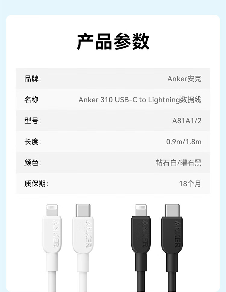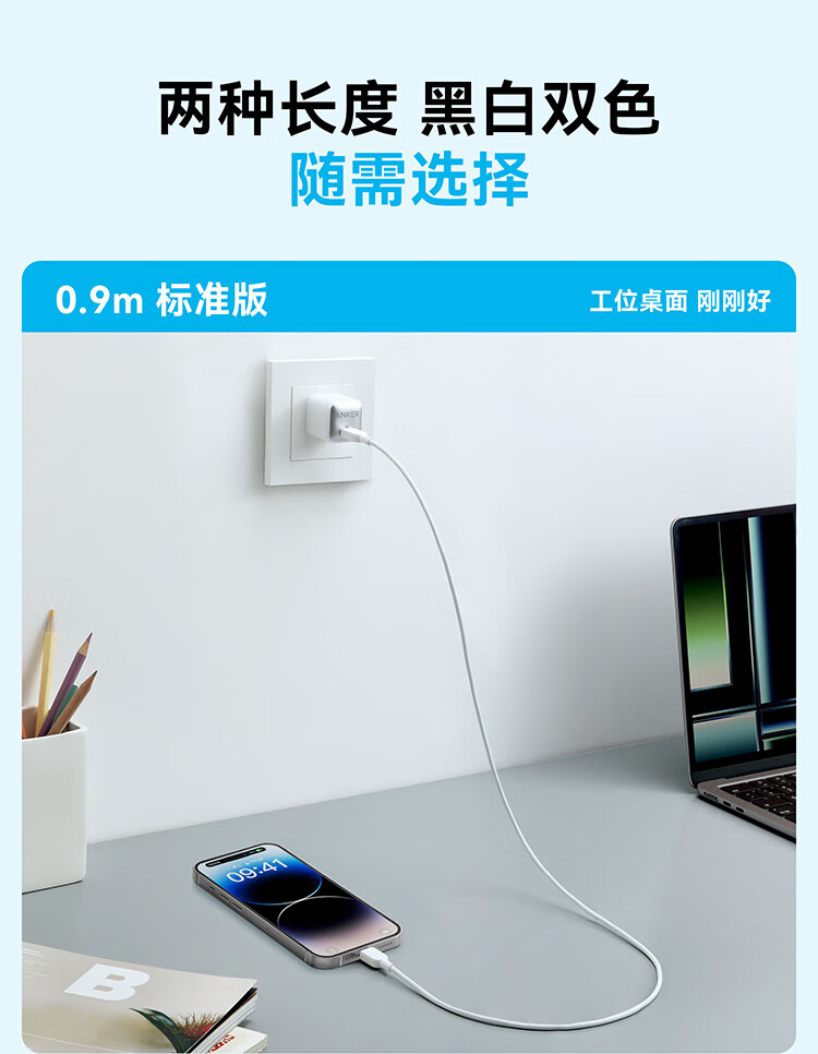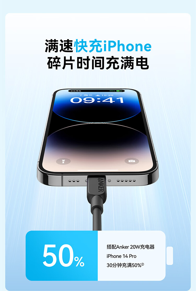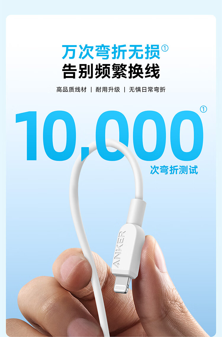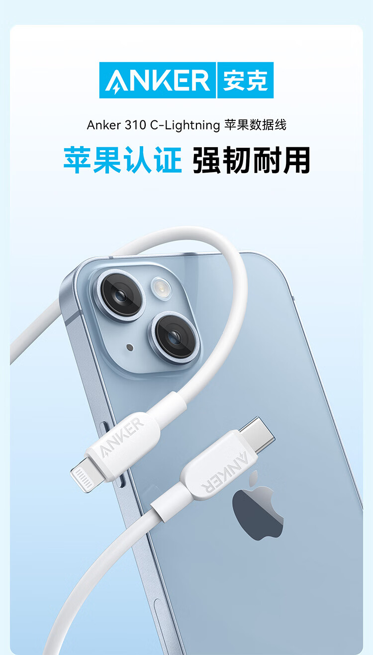 ANKER安克【1件包邮】60WPD快充MFI认证CL数据充电线适配充电宝充电器线苹果手机131412lightning接口 【白】0.9米