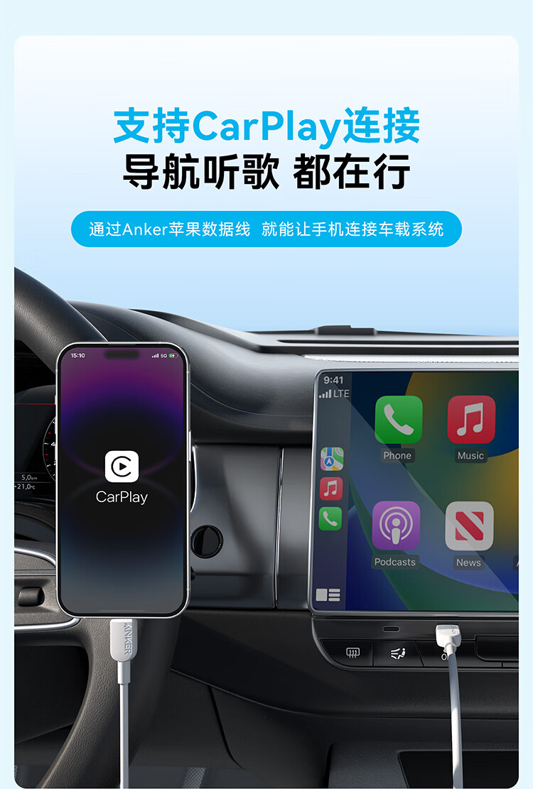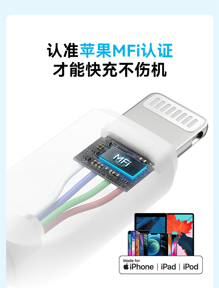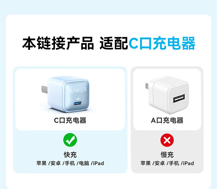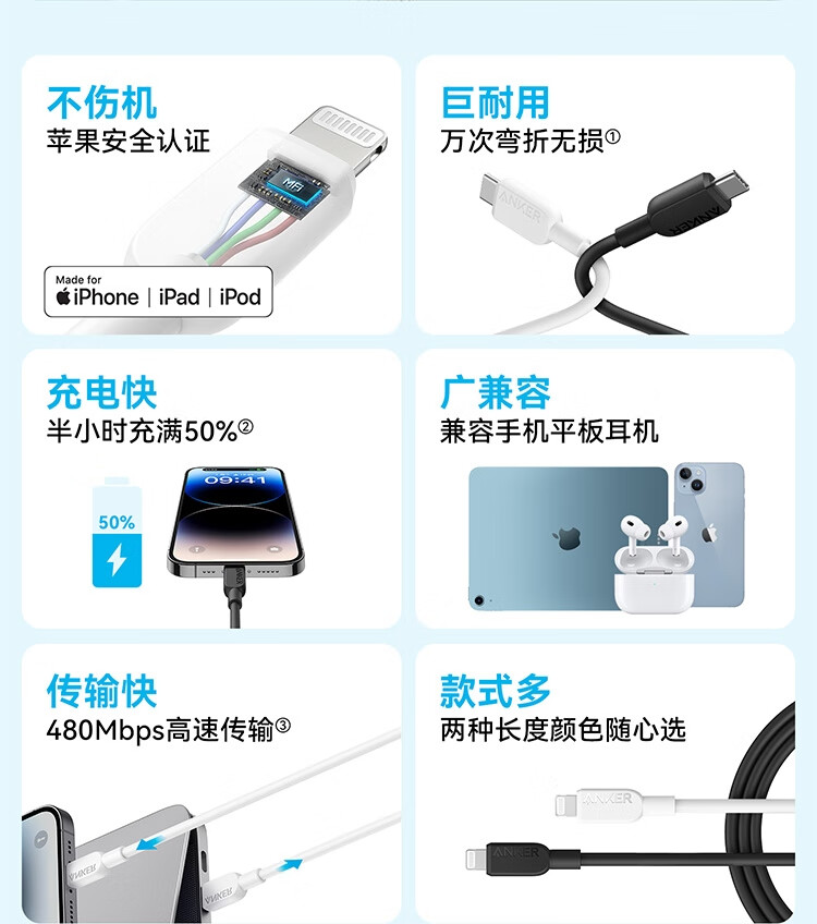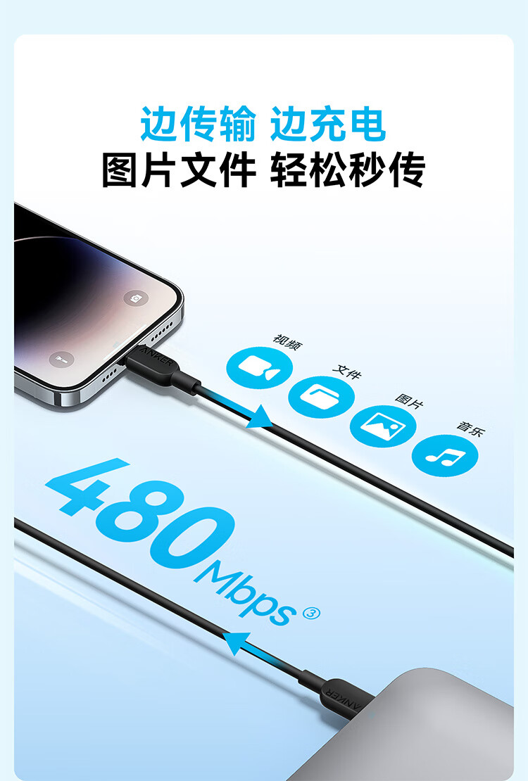 ANKER安克【1件包邮】60WPD快充MFI认证CL数据充电线适配充电宝充电器线苹果手机131412lightning接口 【白】0.9米