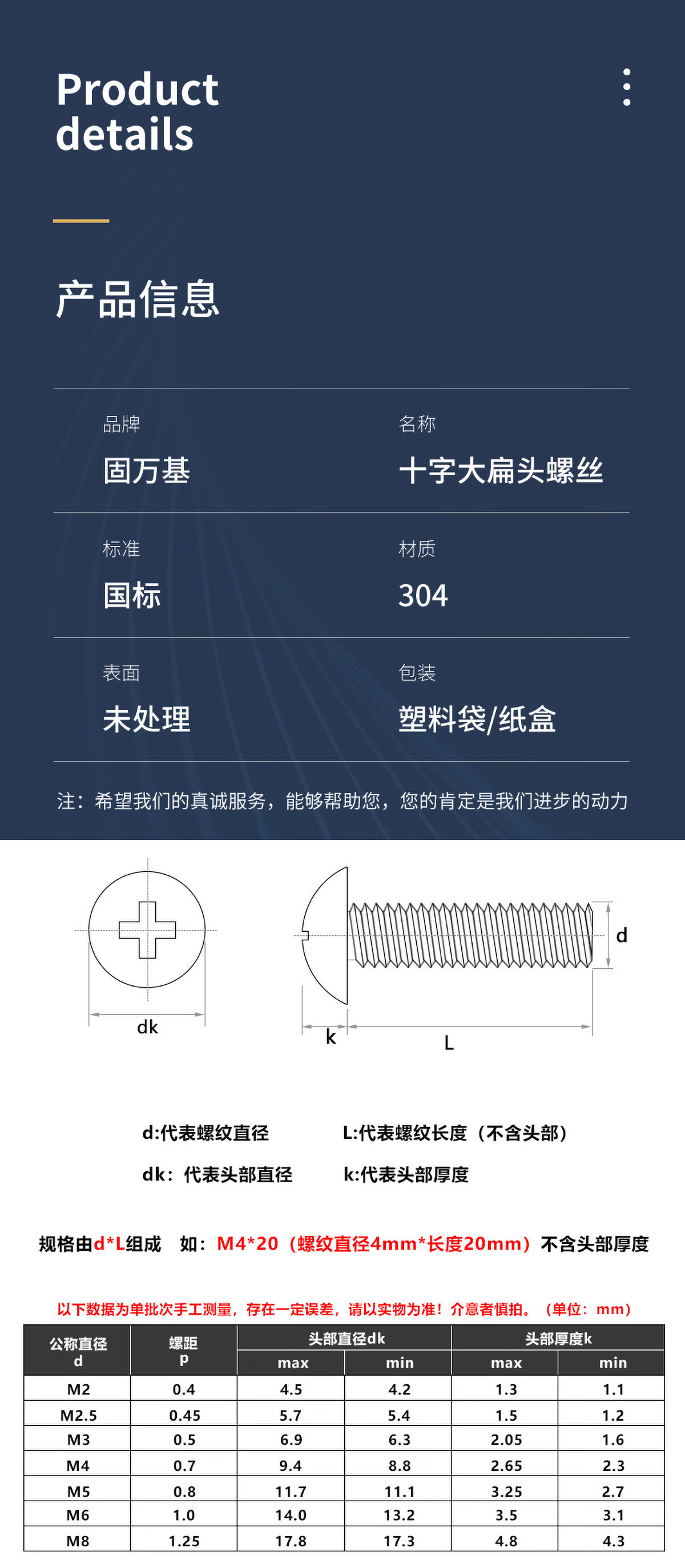 GUWANJI304不锈钢十字大扁头螺丝钉大帽YB406蘑菇伞头机丝螺栓螺钉 M2x3[200个]