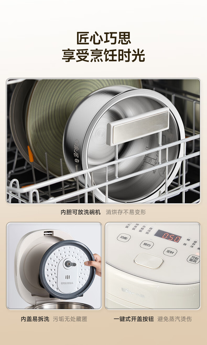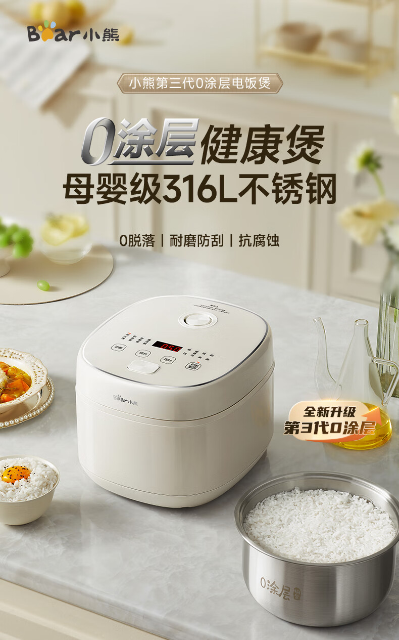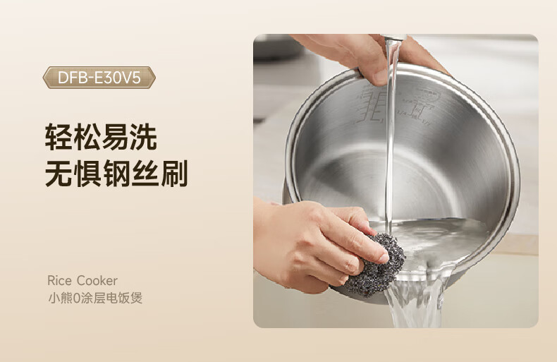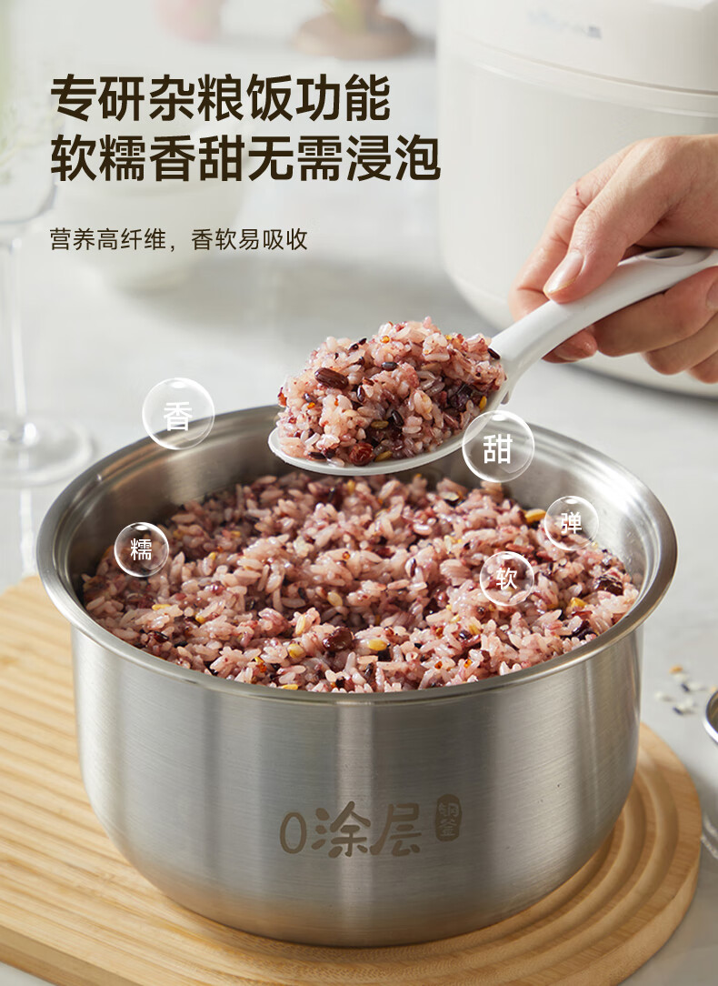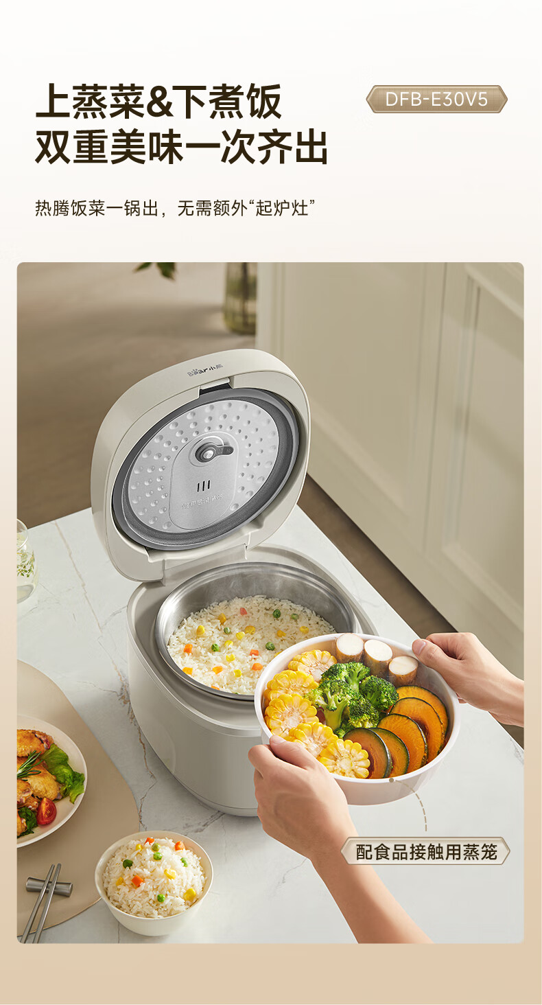 小熊(Bear)电饭煲0涂层 4-5人不锈钢内胆电饭锅 家用智能微压柴火饭杂粮饭多功能3L米黄 DFB-E30V5