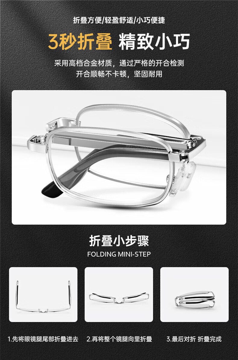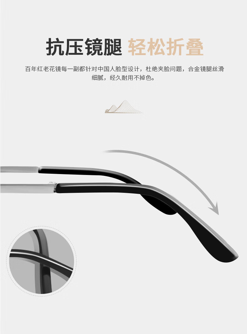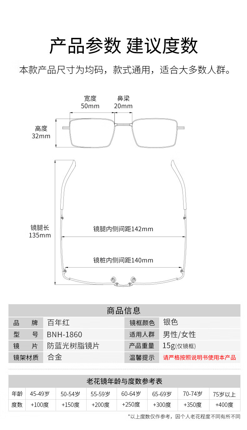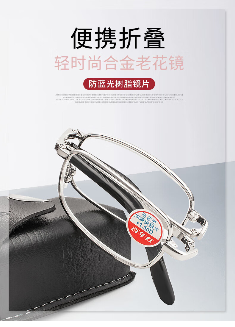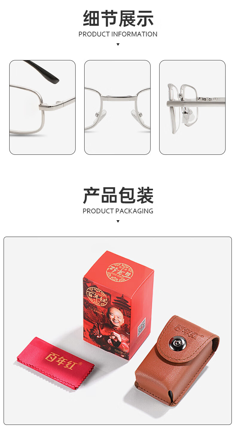 百年红折叠老花镜进口高清防蓝光老花镜正品高端老人眼镜1860银色-150