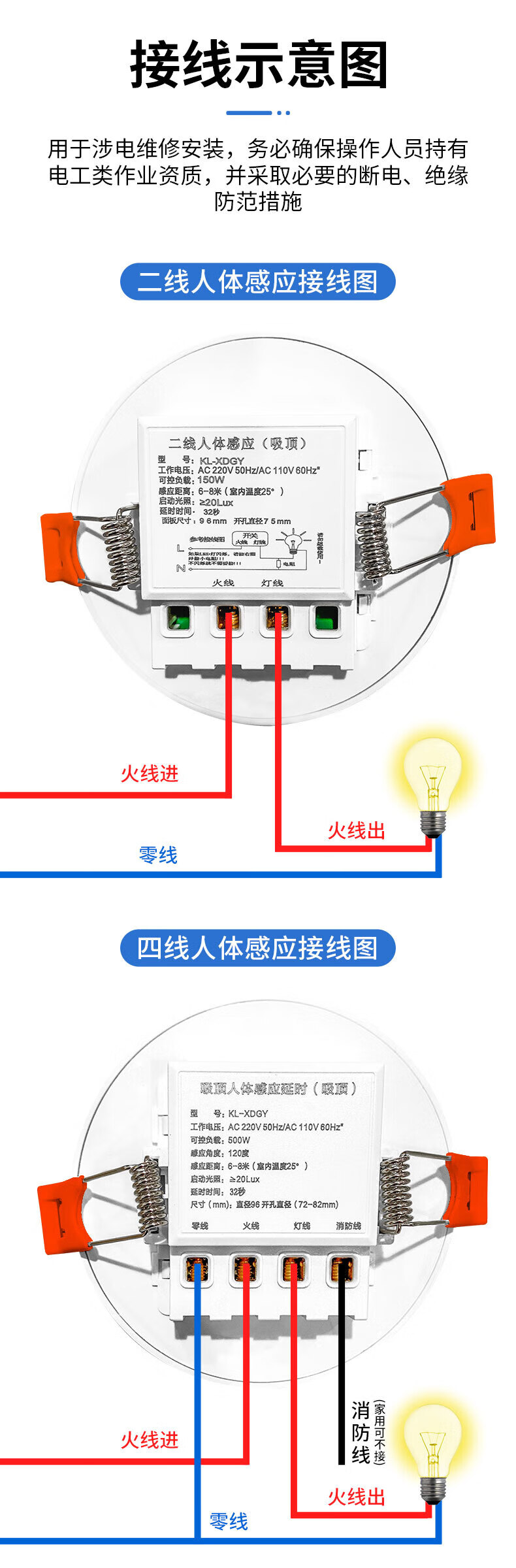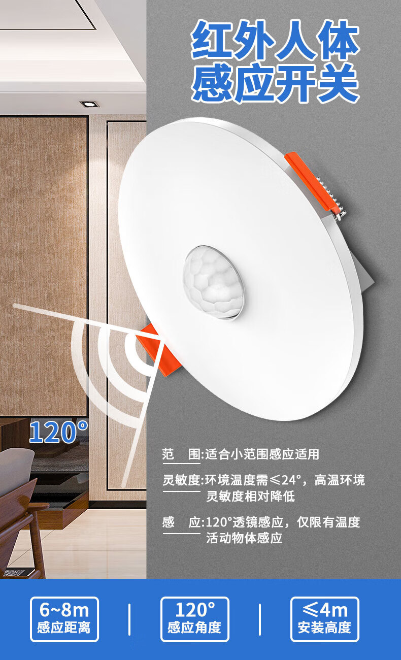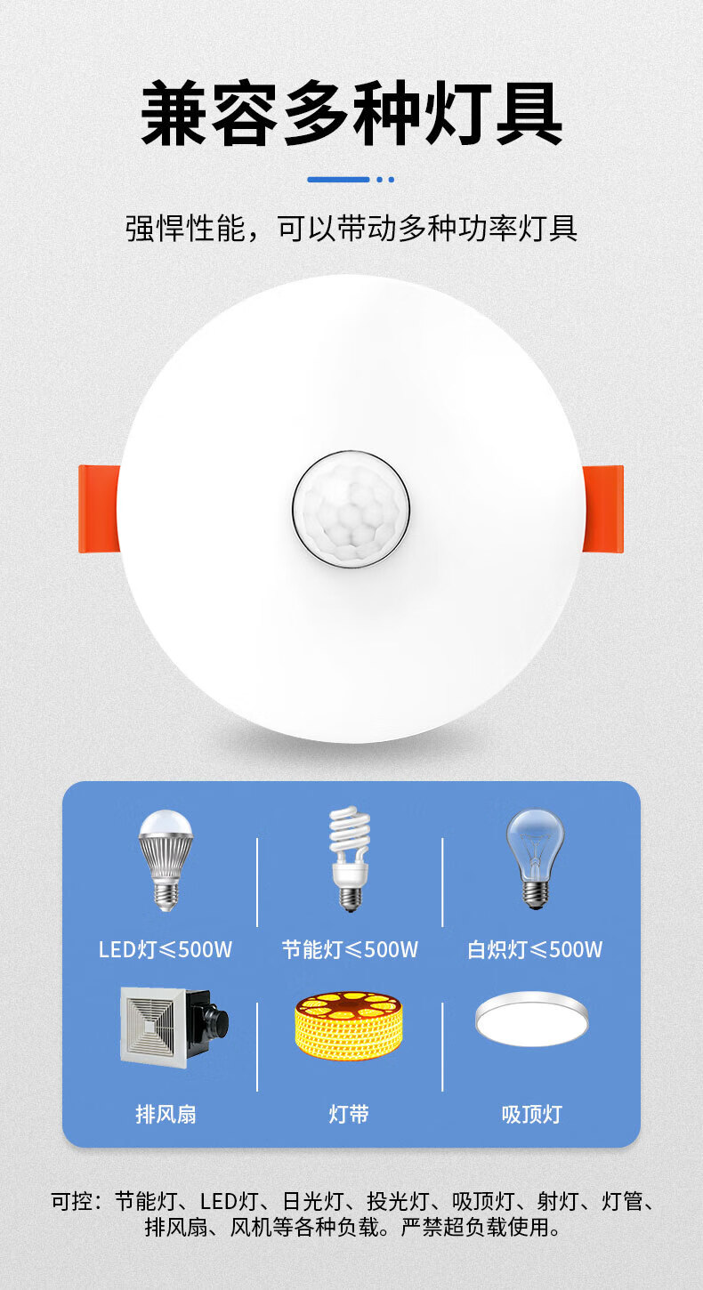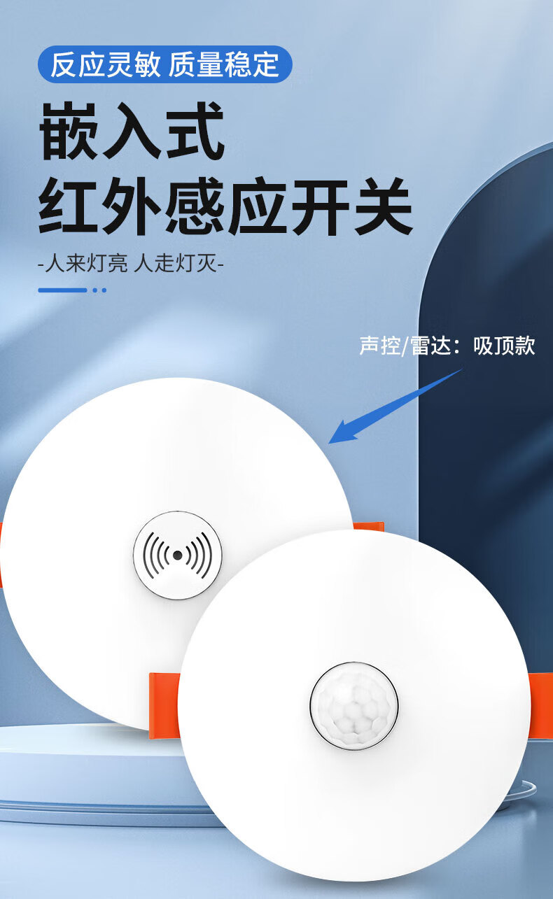 国际电工光感吸顶灯家用嵌入式人体感应开关大功率LED灯节能延时声控感应 150W-人体感应【二线制】