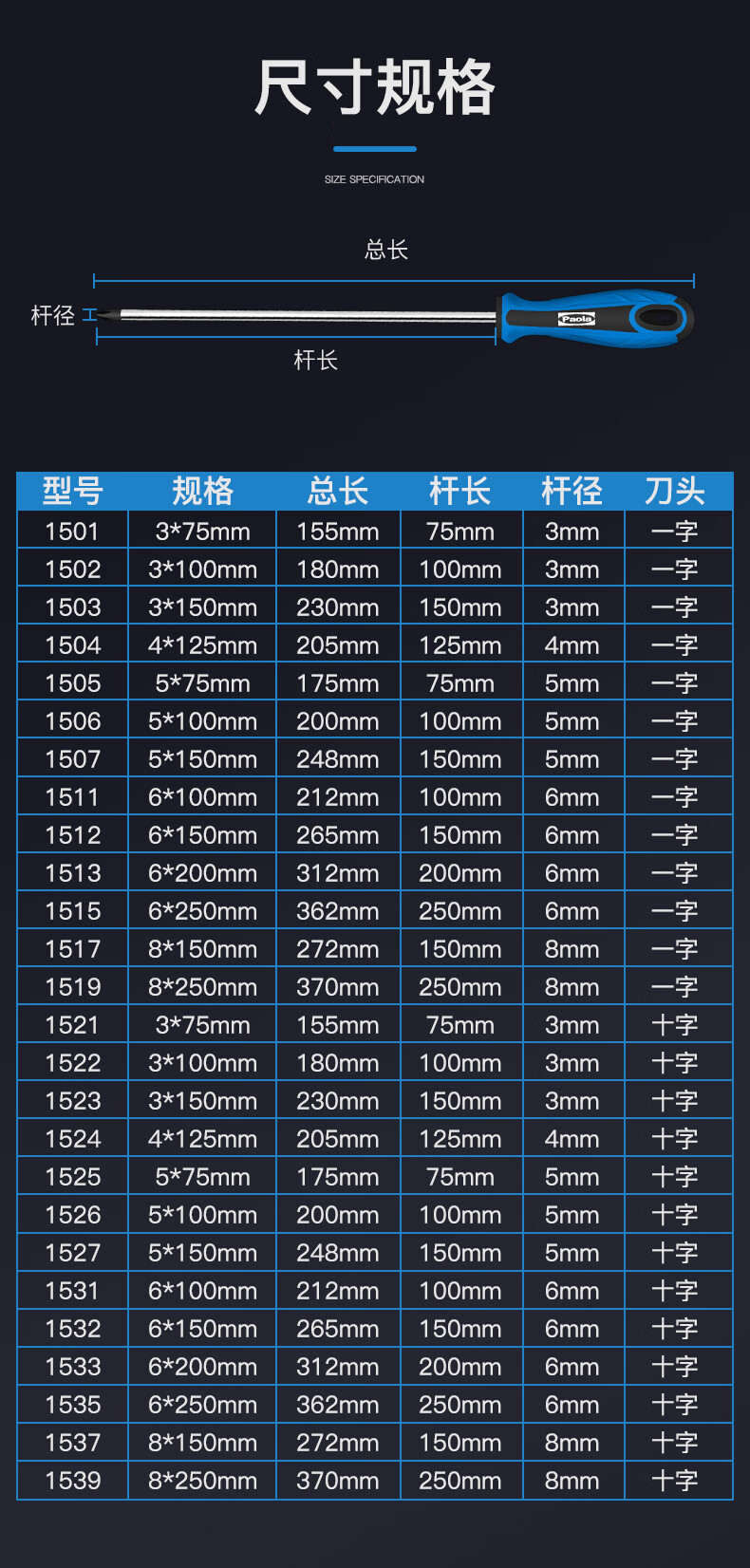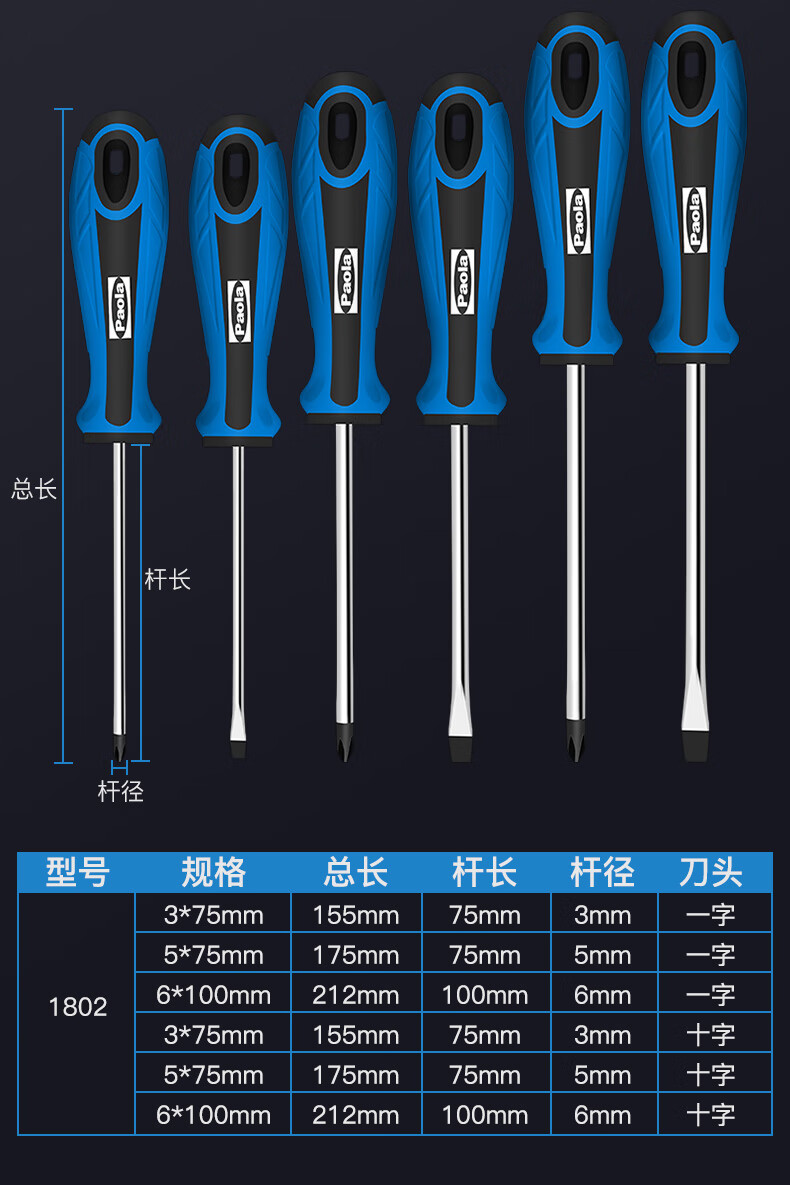 保拉(Paola)螺丝刀十字6*200mm 防滑带强磁性加长螺丝批 起子改锥1533