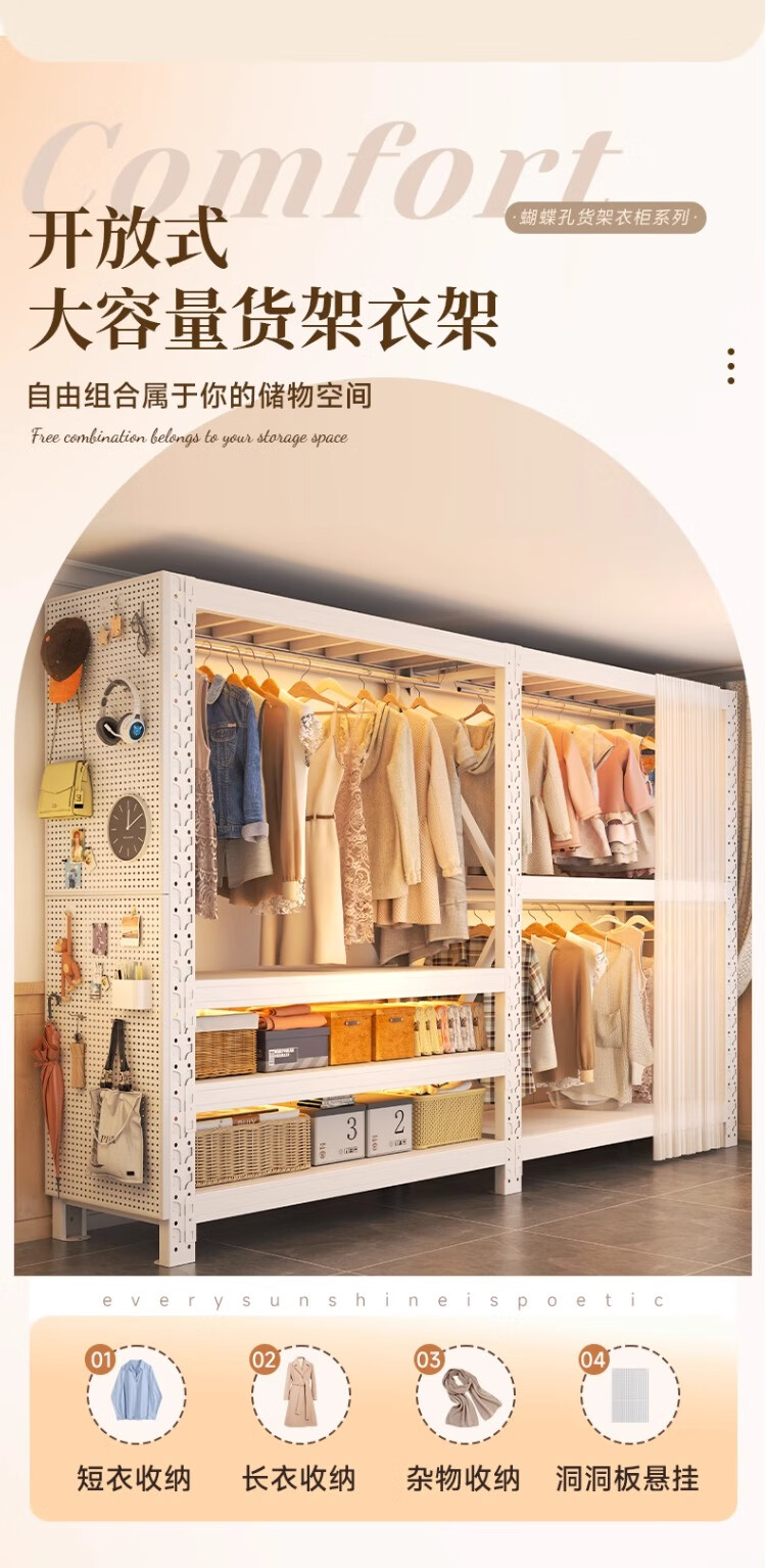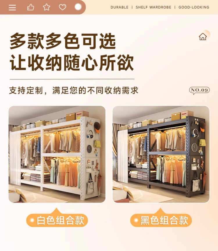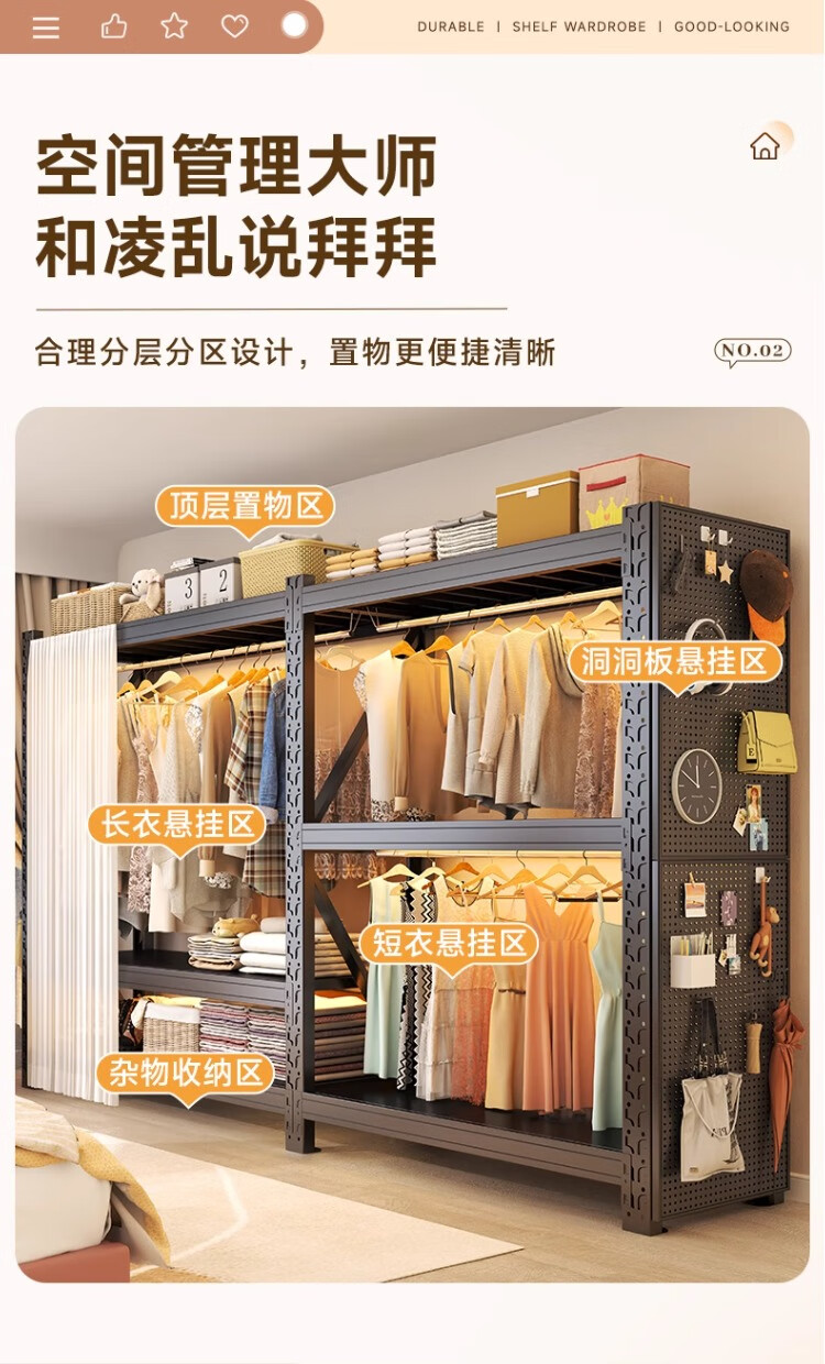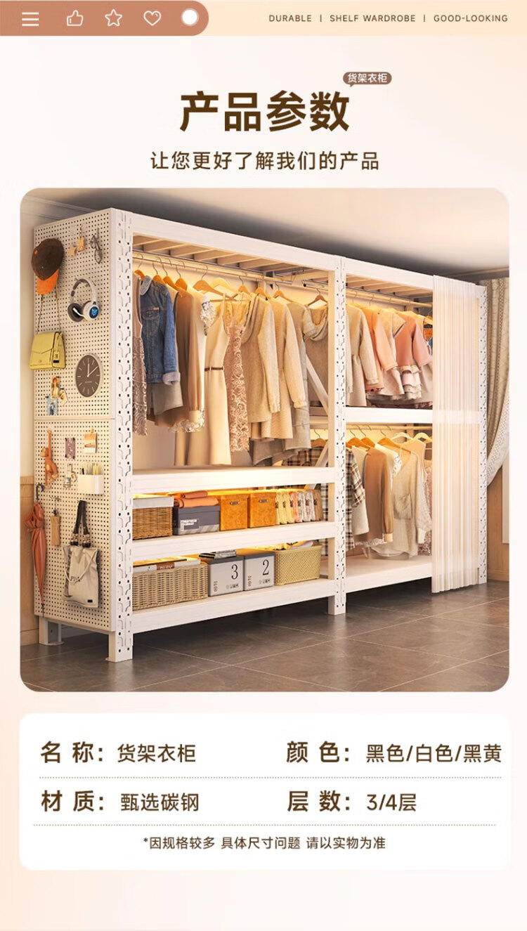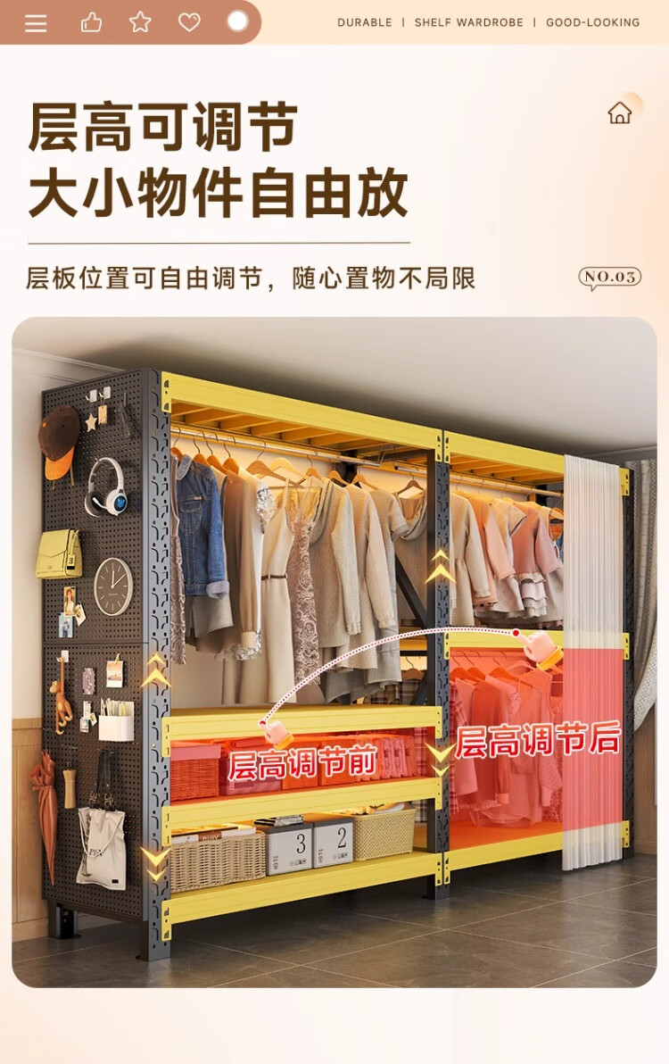 昭简简易衣柜钢架结构置物架开放式卧室收纳柜出租房衣帽架货架衣柜 黑黄三层【送正面帘+挂衣杆*2】 组合款长300*宽60*高200