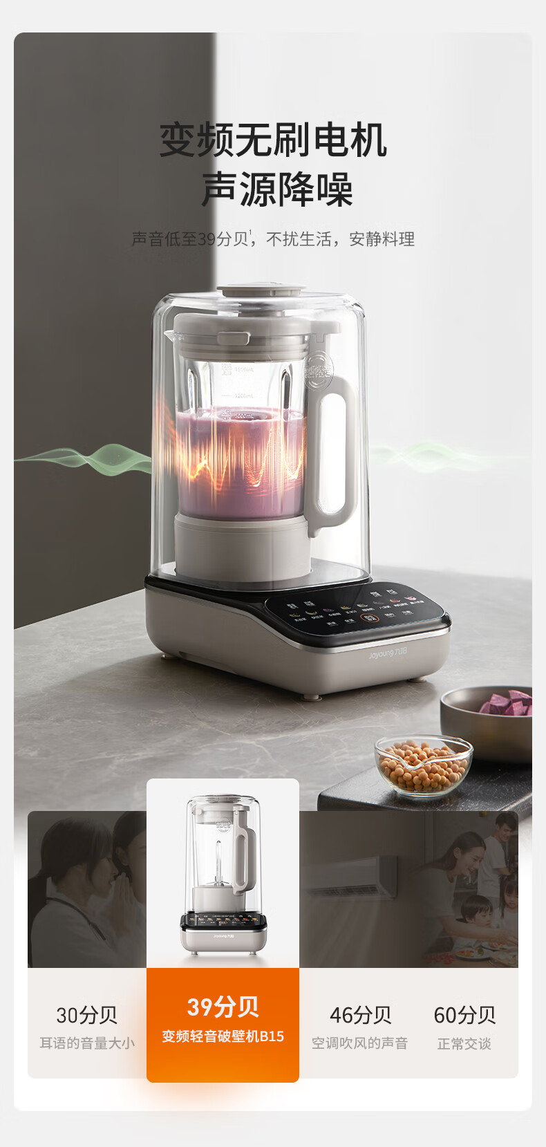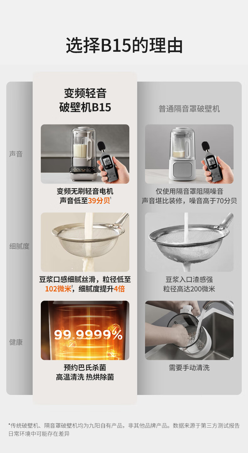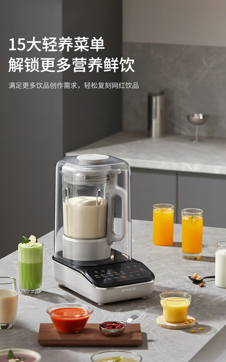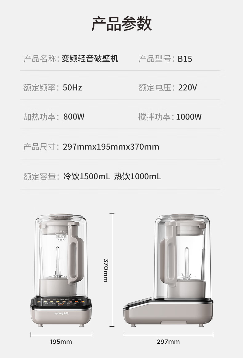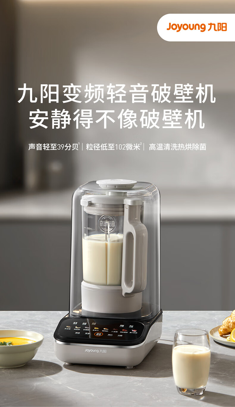 九阳最新款变频轻音破壁机家用全自动豆浆机轻音低至39分贝2-4人用1.5L降噪B15 政府补贴