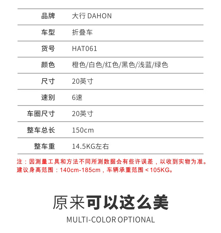 大行(DAHON)折叠自行车20英寸超轻6速通勤折叠单车HAT061 白色