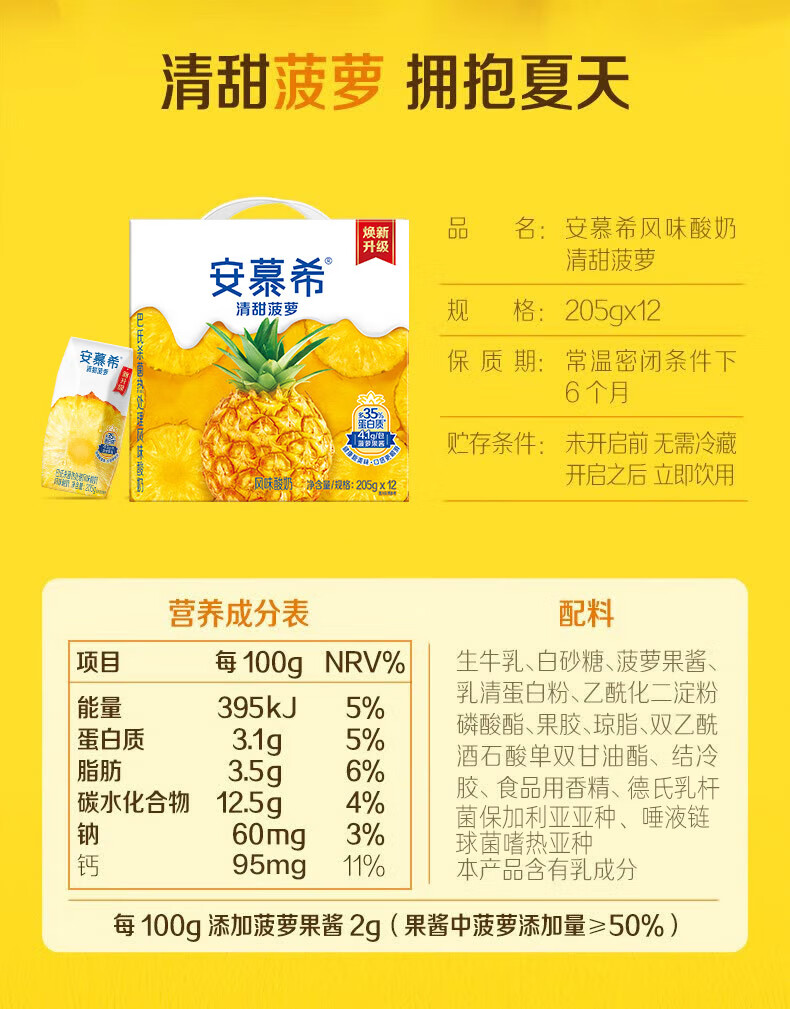 伊利安慕希酸奶清甜菠萝风味12盒 酸奶整箱多35%蛋白质 中秋礼盒 205g*12盒/箱 清甜菠萝