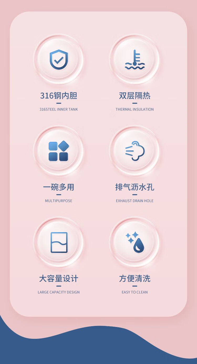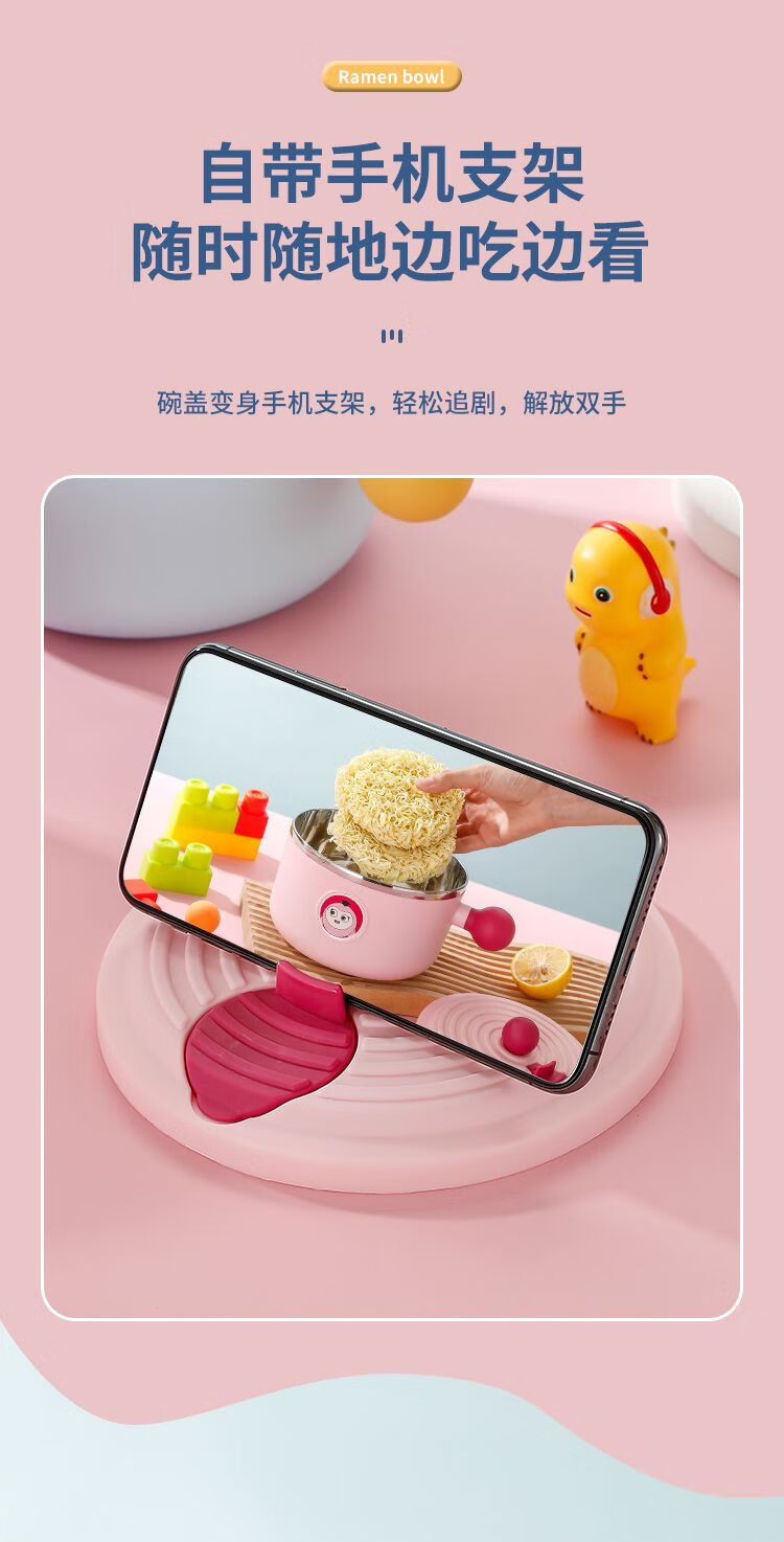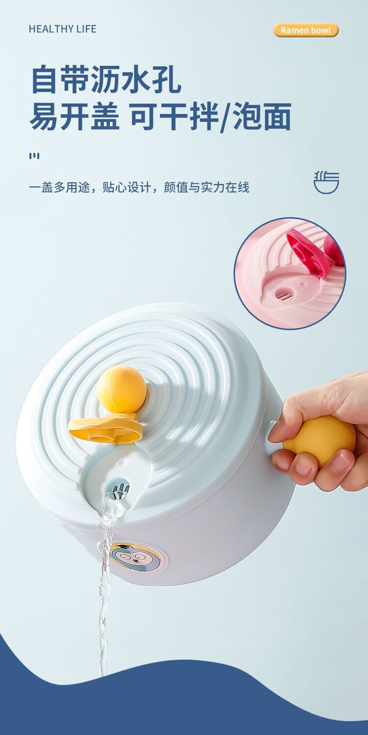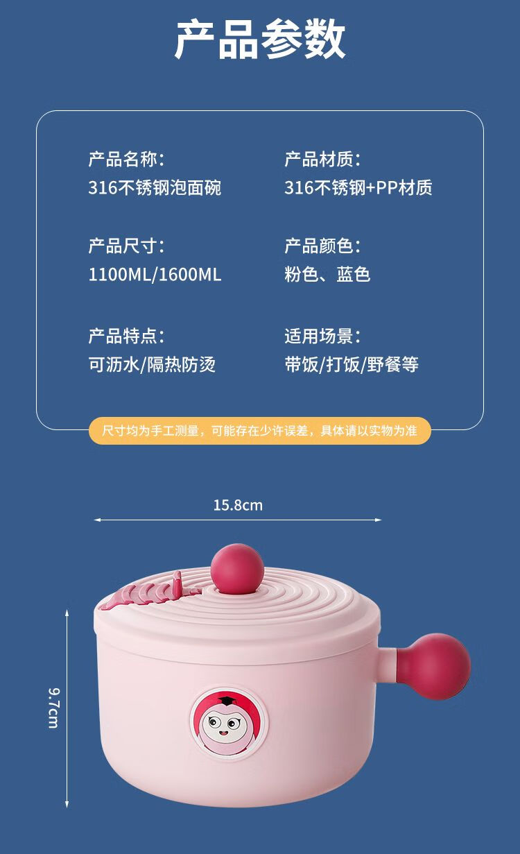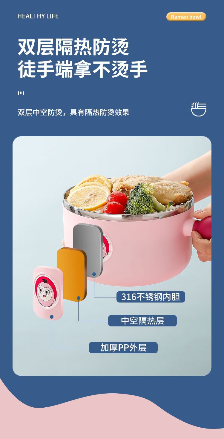 DEATKN316不锈钢泡面碗带盖大容量沥水学生宿舍卡通泡面神器 【进口316内胆】热推【仅余66份】 多巴胺蓝1600ML(送贴纸)