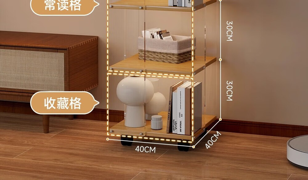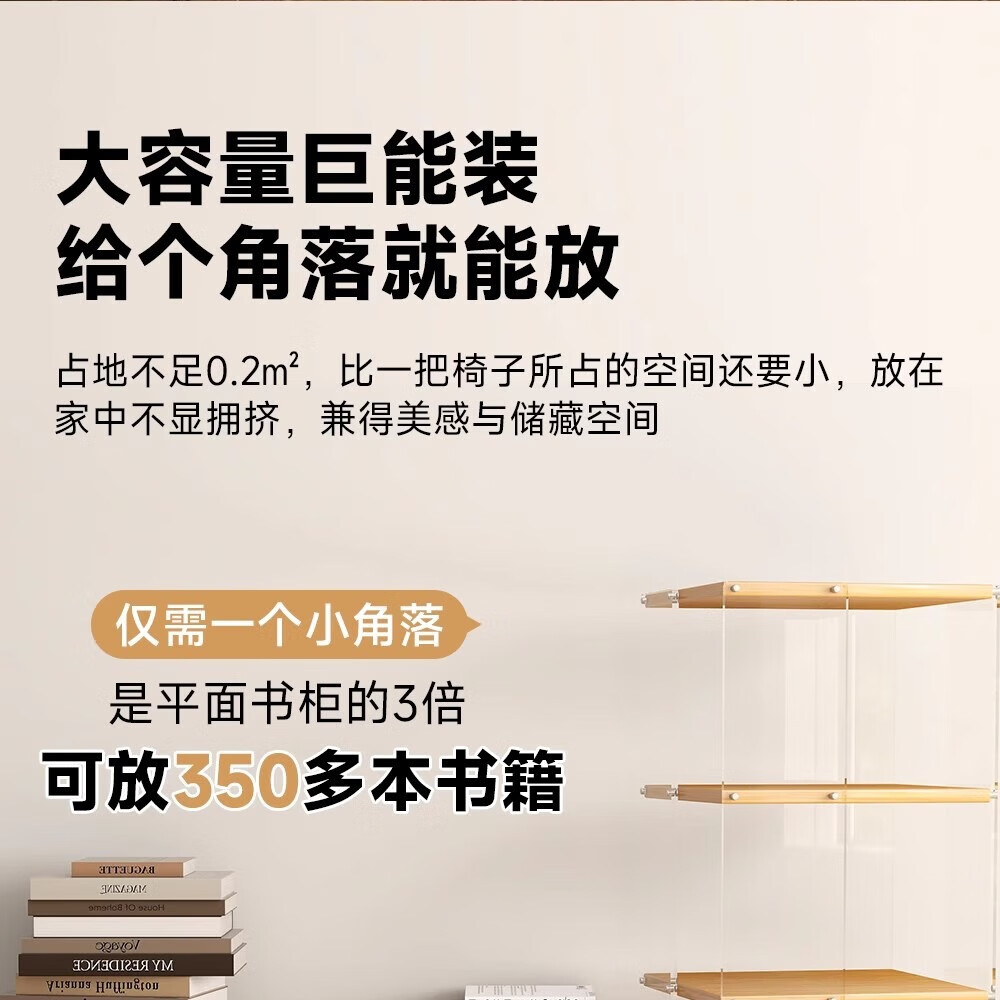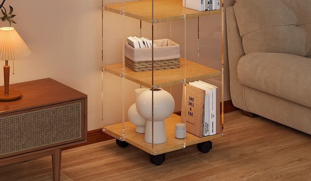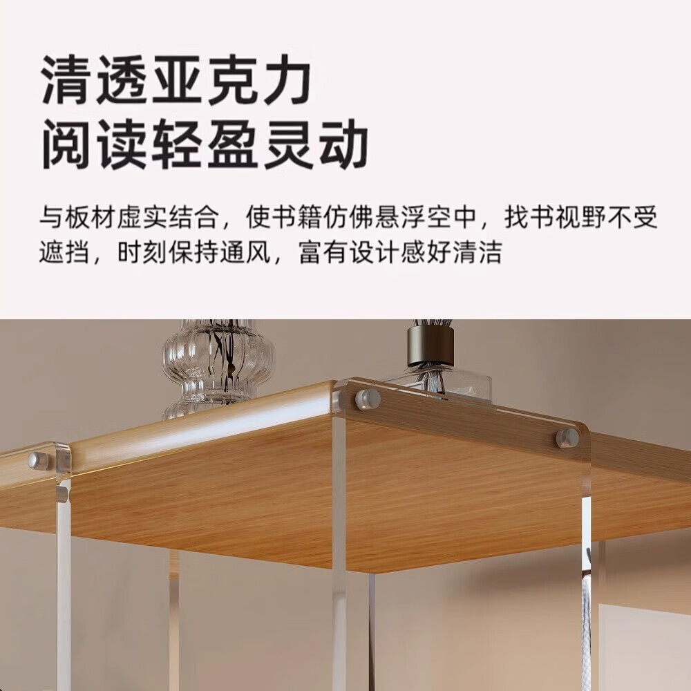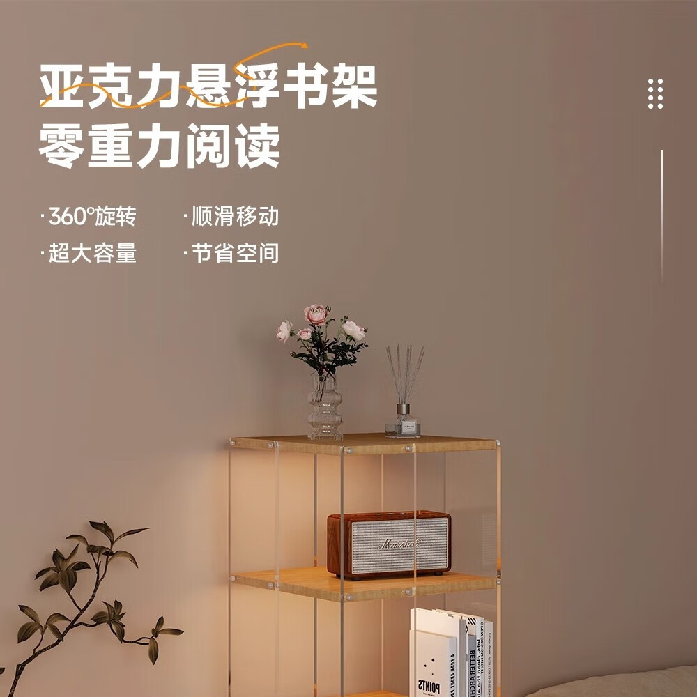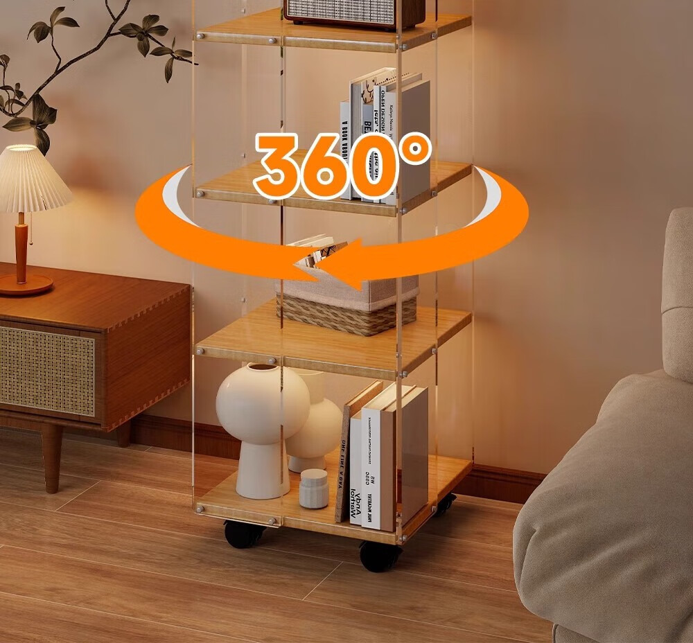 美竹乐实木书架落地置物架亚克力多层旋转可移动客厅书房展示柜转角书柜 【亚克力书架】 四层-原木色 (360度旋转)