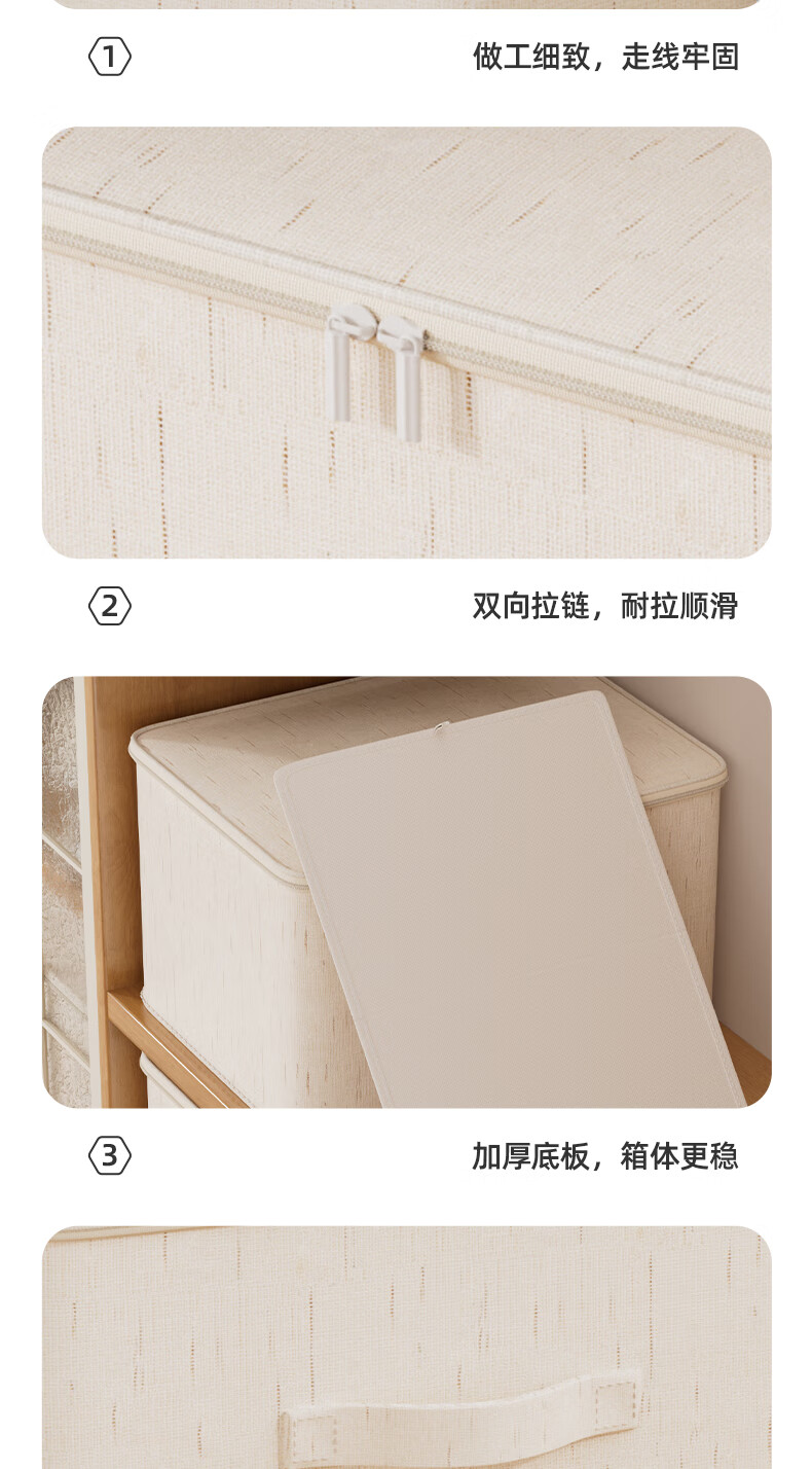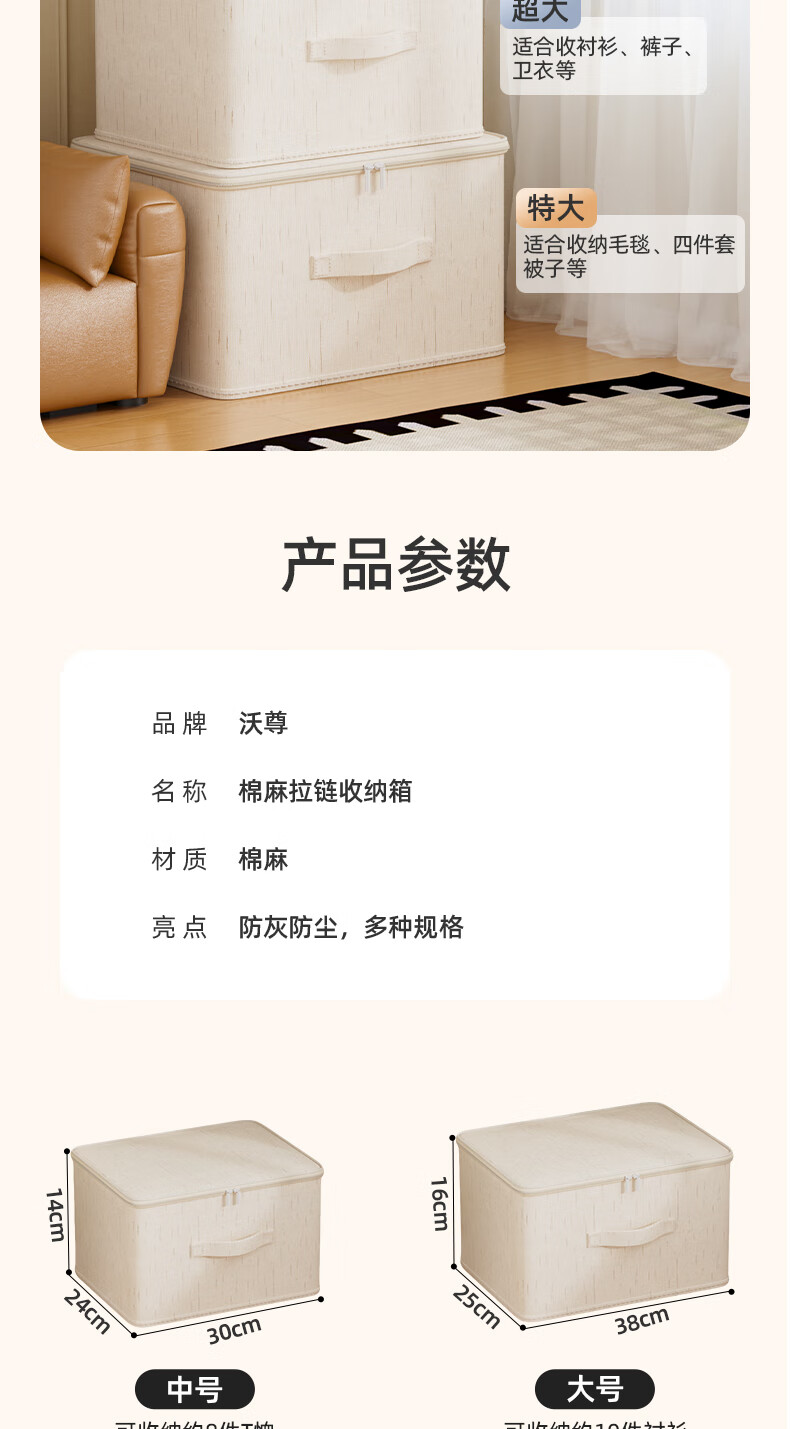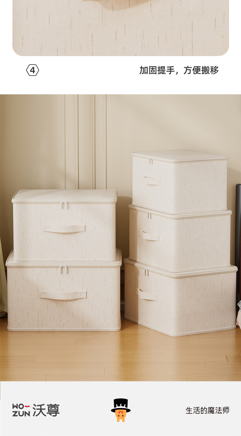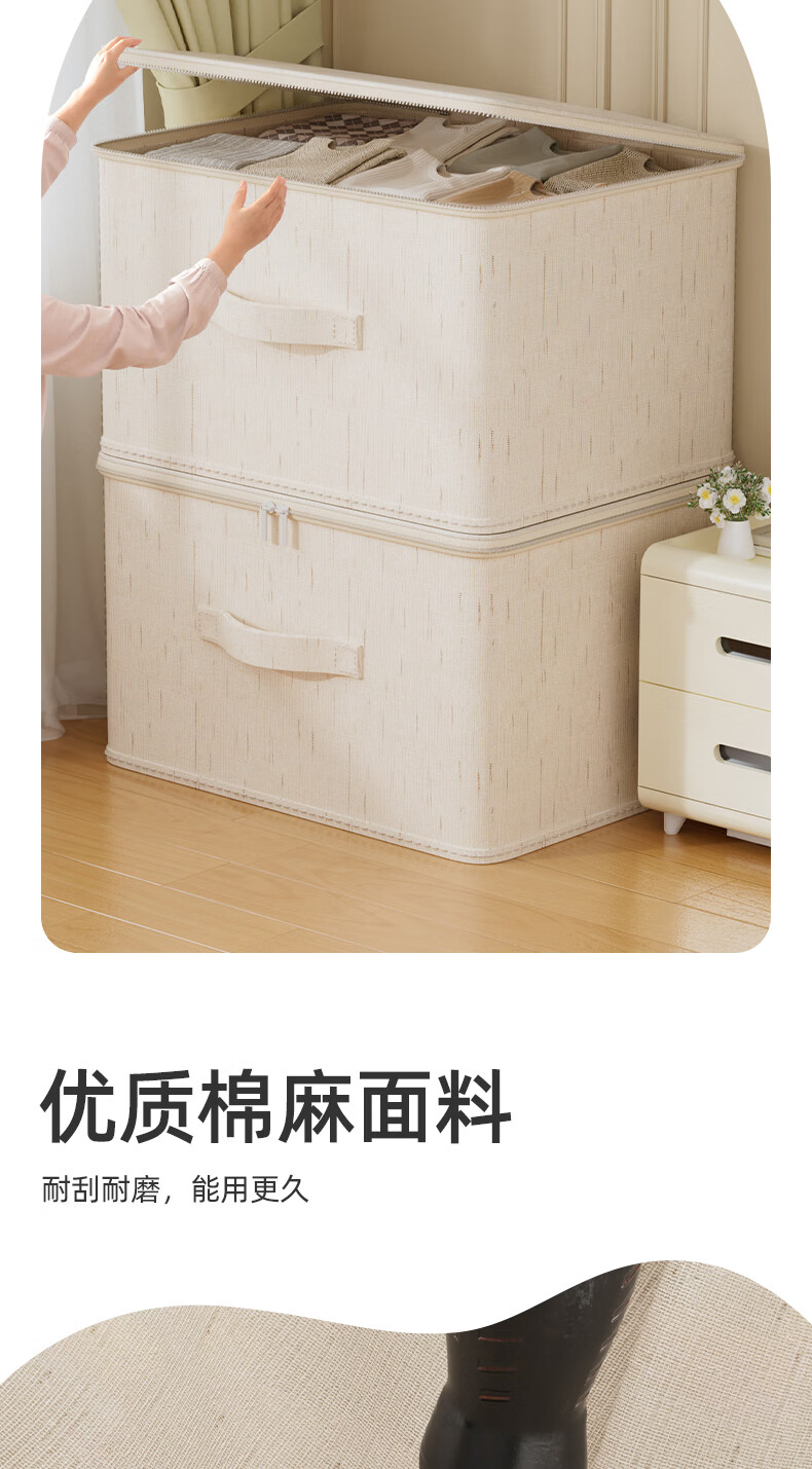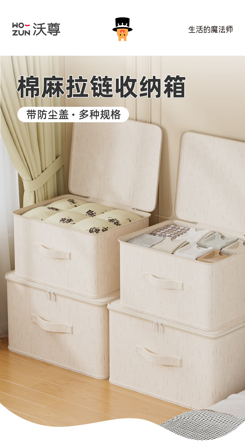 沃尊拉链收纳箱被子收纳筐收纳箱大容量超大周转箱衣柜收纳衣服收纳箱 米色-【中号】棉麻拉链箱30*24*14cm