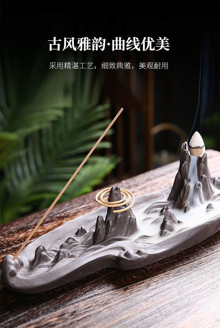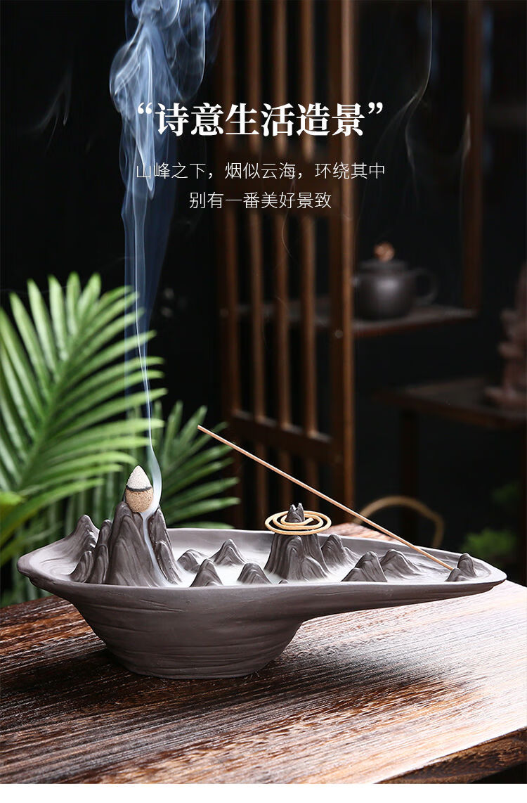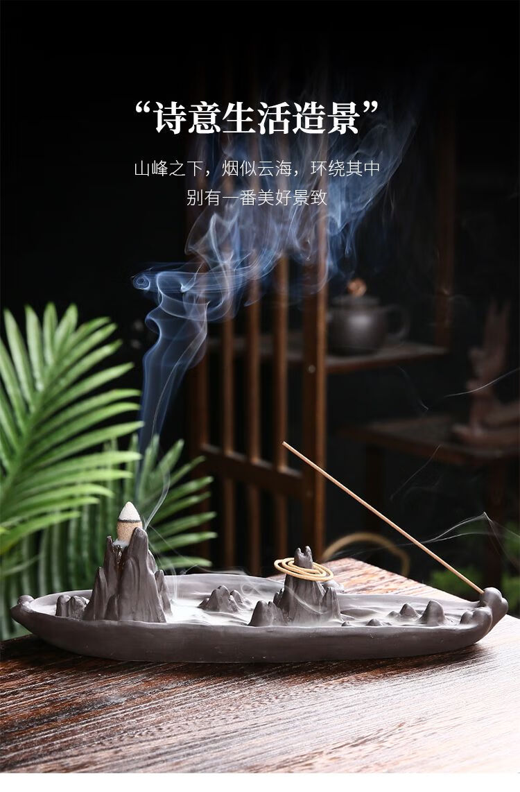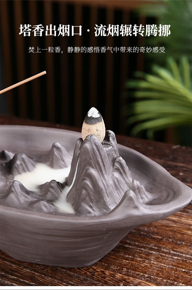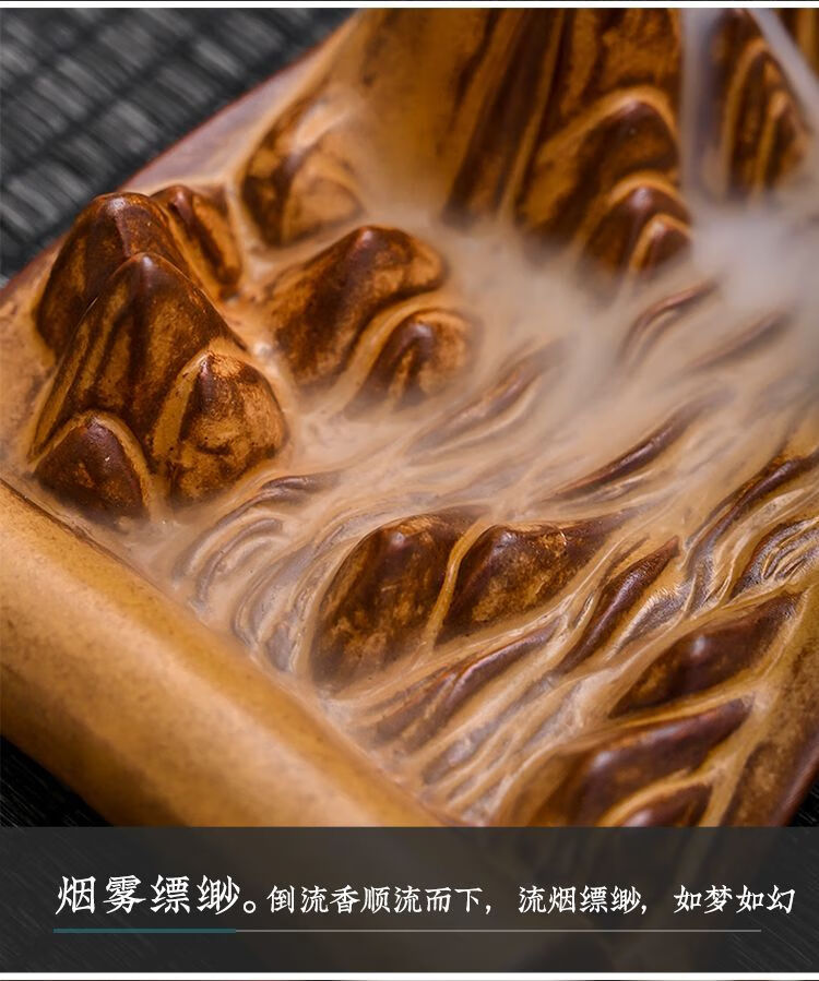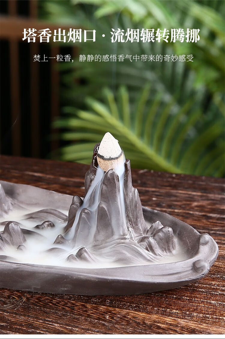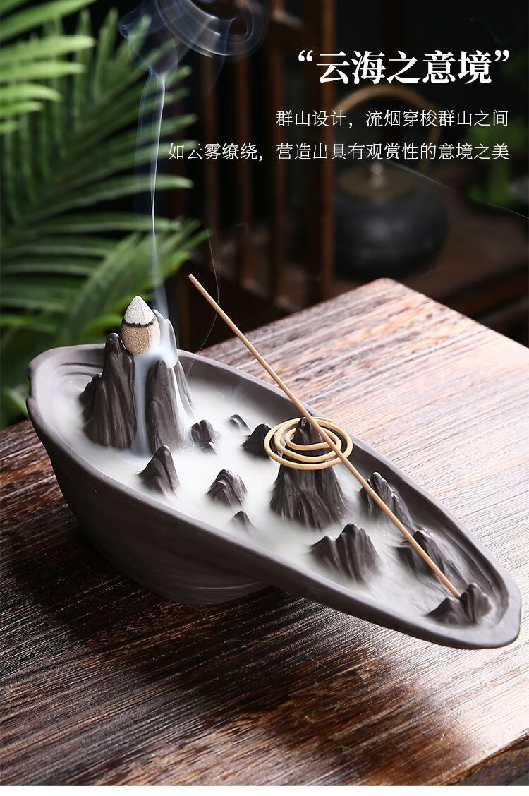 OYKTN盘香倒流香炉高山流水创意摆件紫砂线香炉禅意家用卧香熏炉线香插 浪涛山境 人工随机装-约50颗混合花香+镊子
