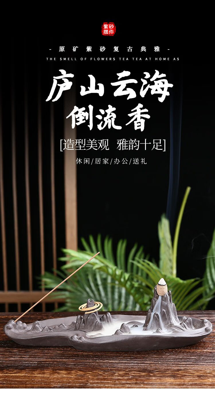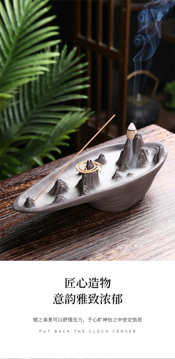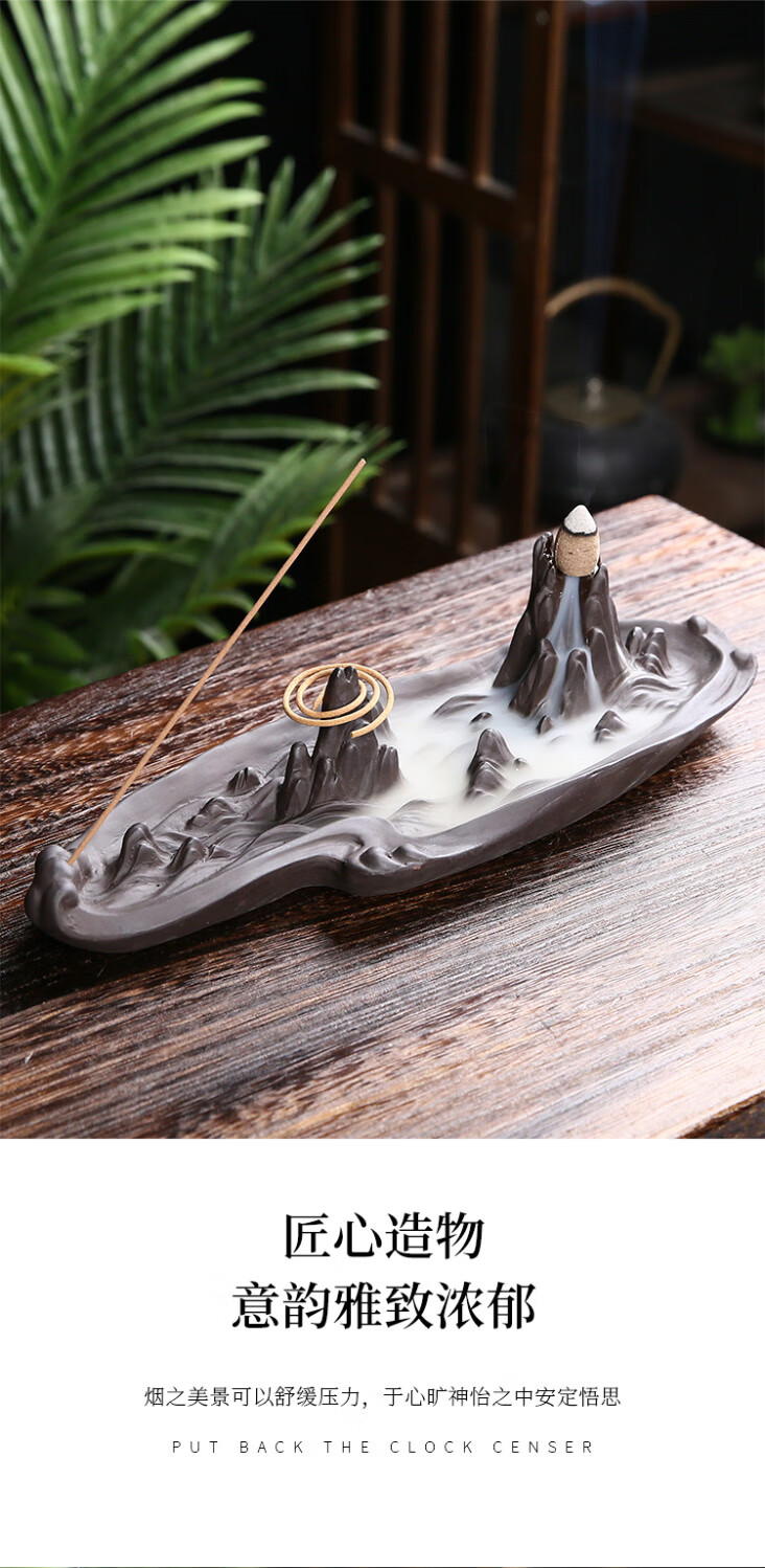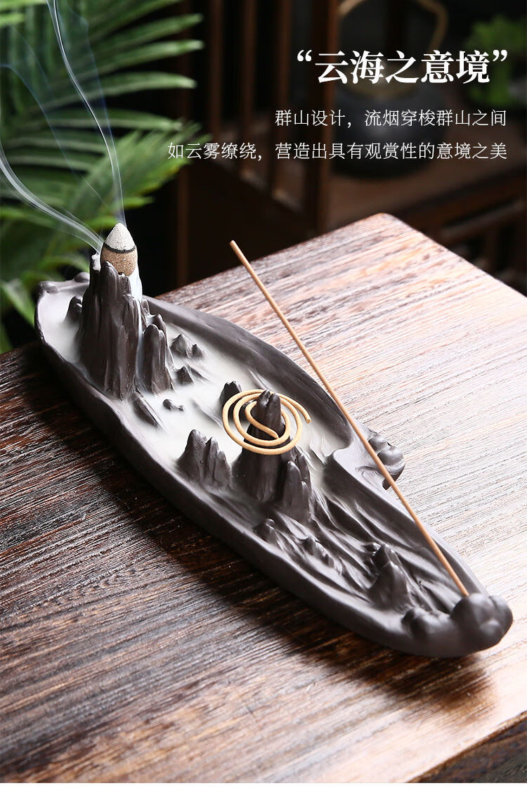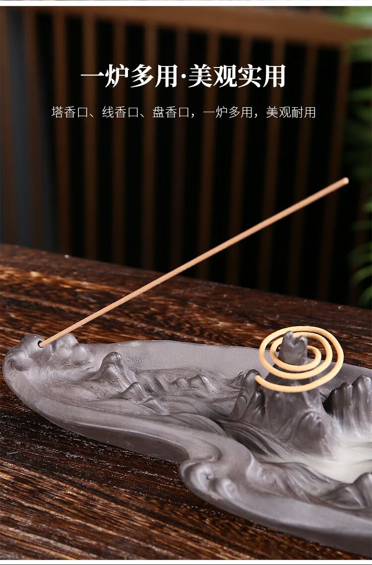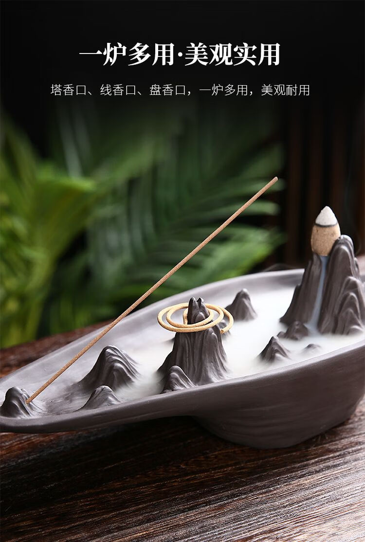 OYKTN盘香倒流香炉高山流水创意摆件紫砂线香炉禅意家用卧香熏炉线香插 浪涛山境 人工随机装-约50颗混合花香+镊子