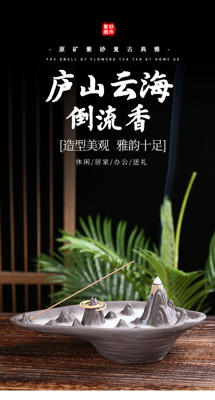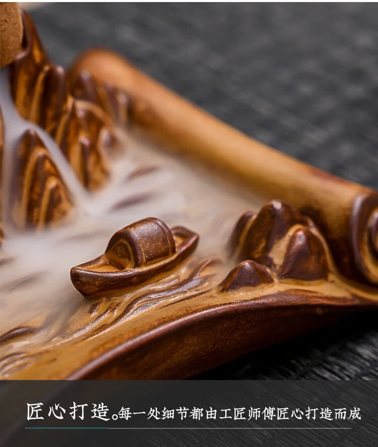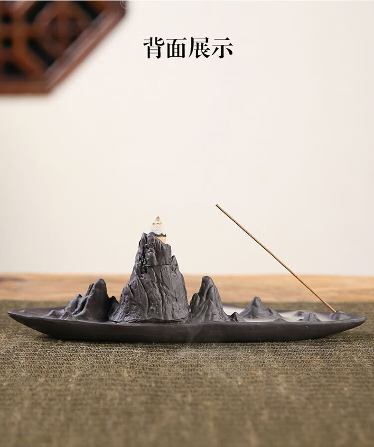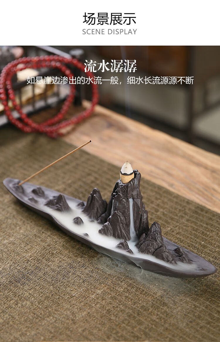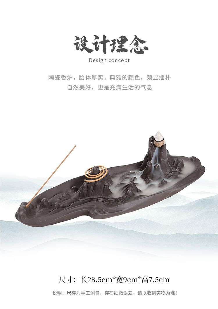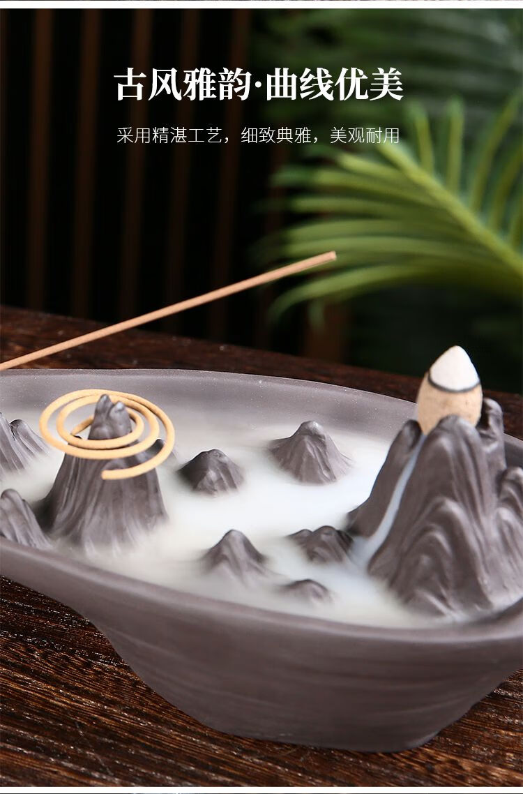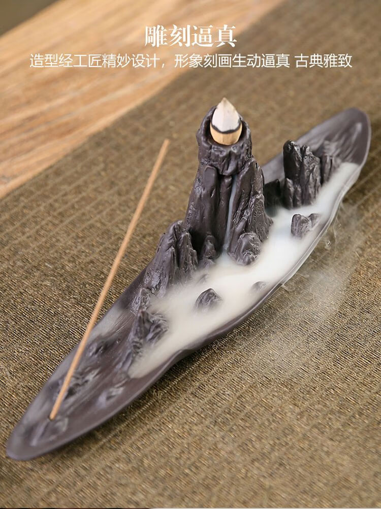 OYKTN盘香倒流香炉高山流水创意摆件紫砂线香炉禅意家用卧香熏炉线香插 浪涛山境 人工随机装-约50颗混合花香+镊子