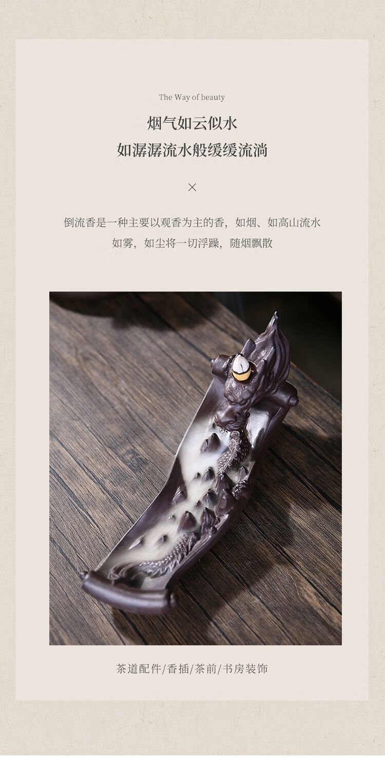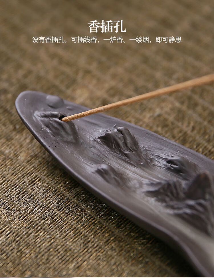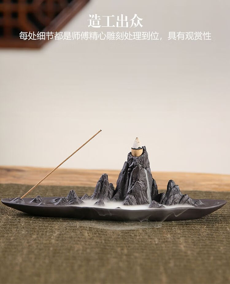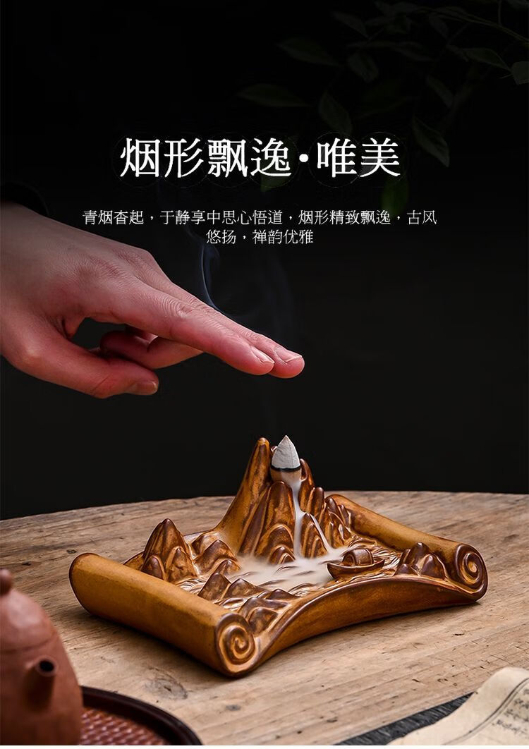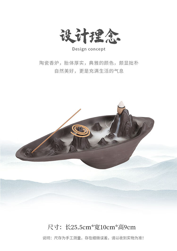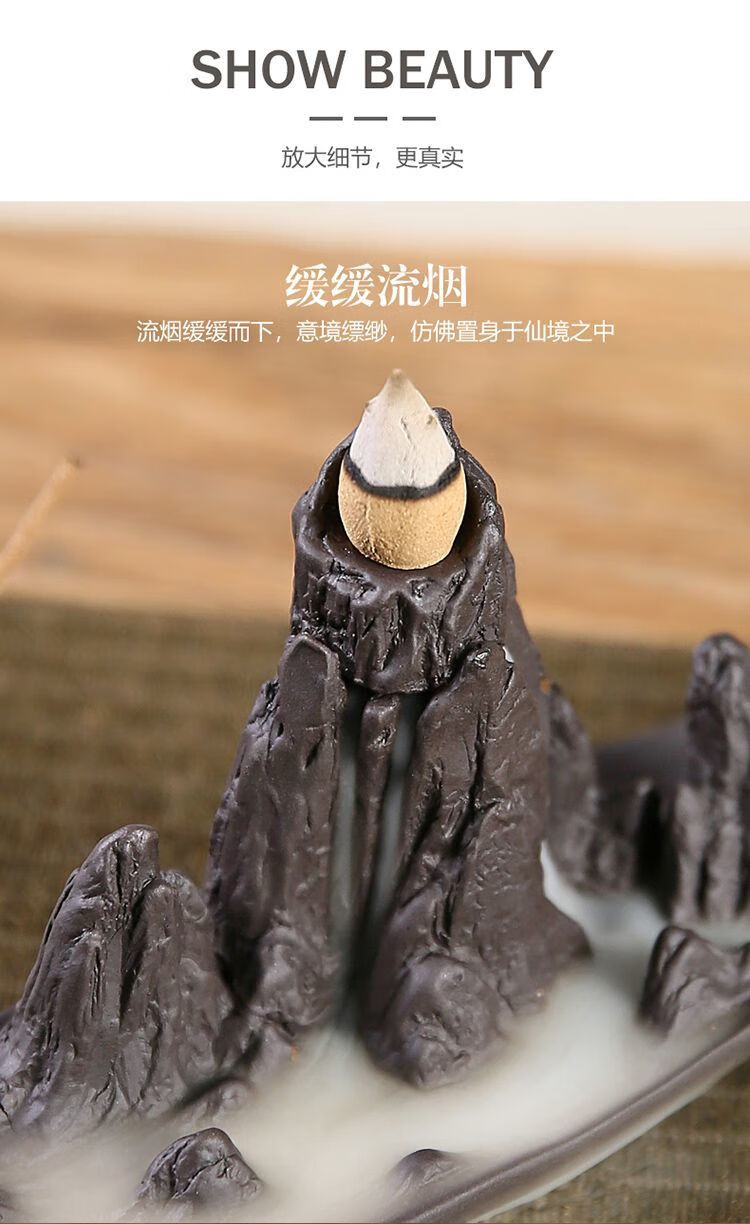 OYKTN盘香倒流香炉高山流水创意摆件紫砂线香炉禅意家用卧香熏炉线香插 浪涛山境 人工随机装-约50颗混合花香+镊子