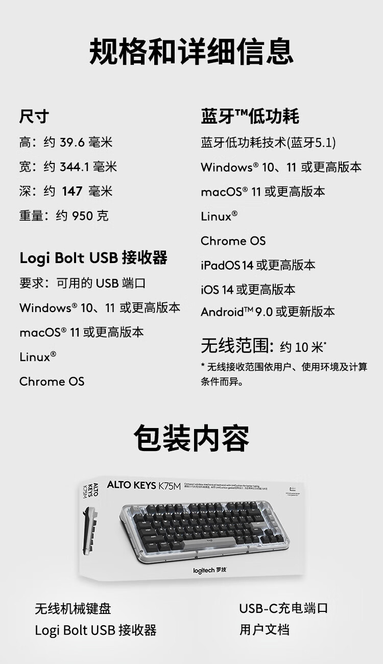 罗技(Logitech)ALTO KEYS K75M 琥珀系列 AI客制化无线机械键盘 热插拔大理石轴 黑色