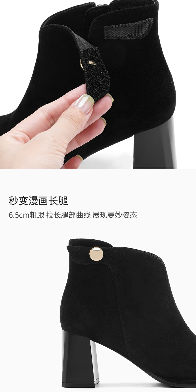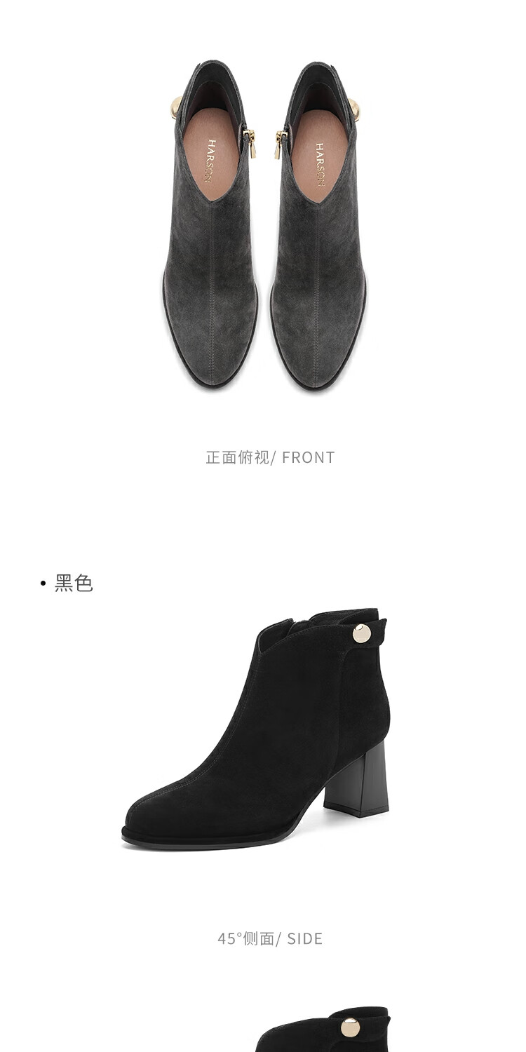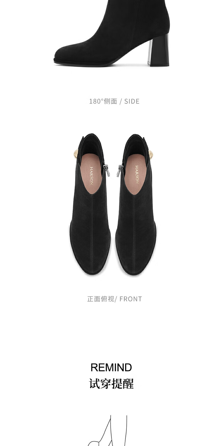 哈森(Harson)【小金豆】25冬新款休闲百搭高跟羊反绒时装靴HA257139 黑色 羊反绒面革 34