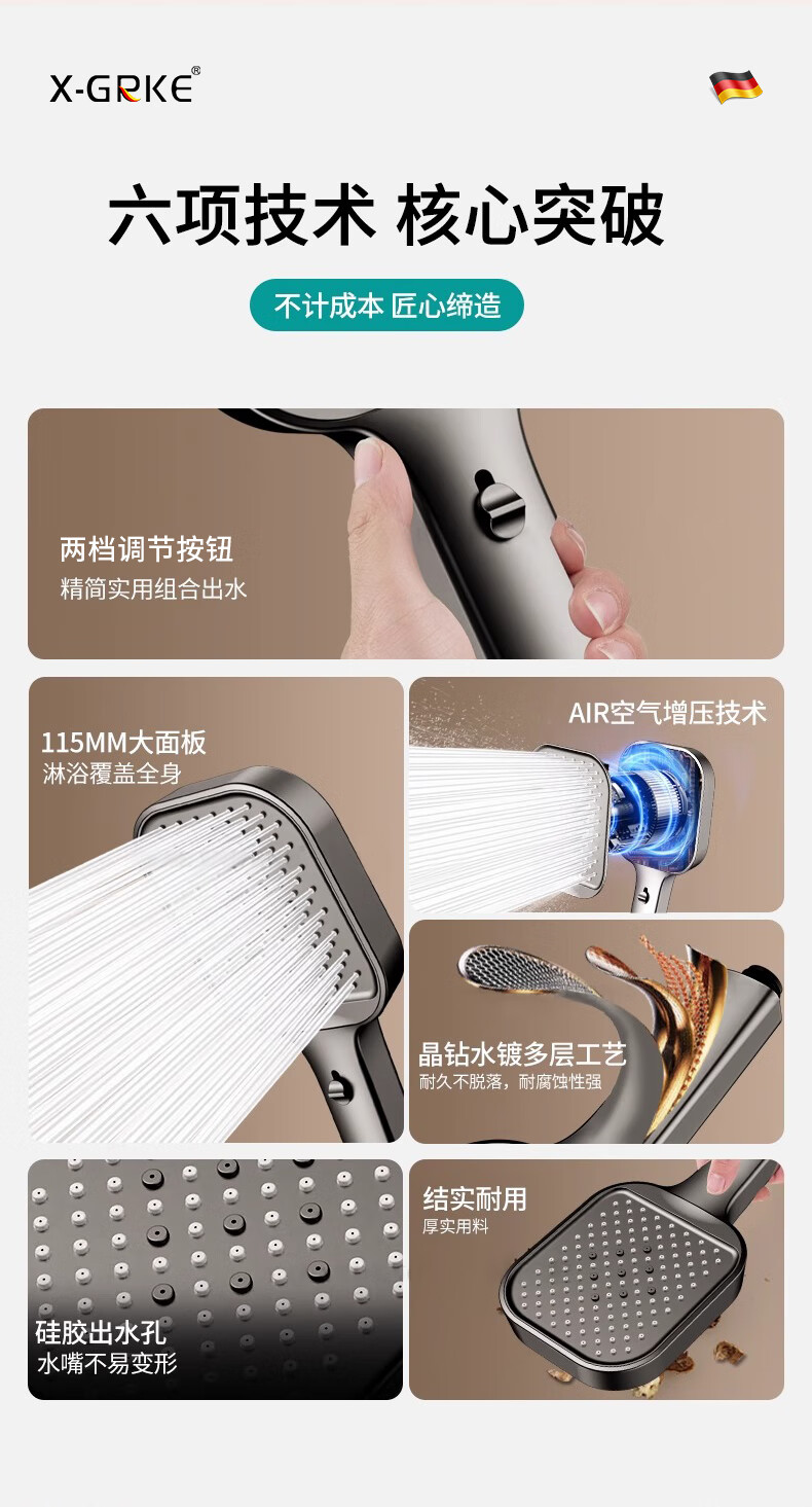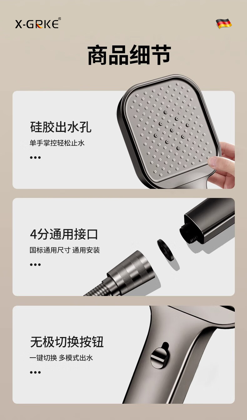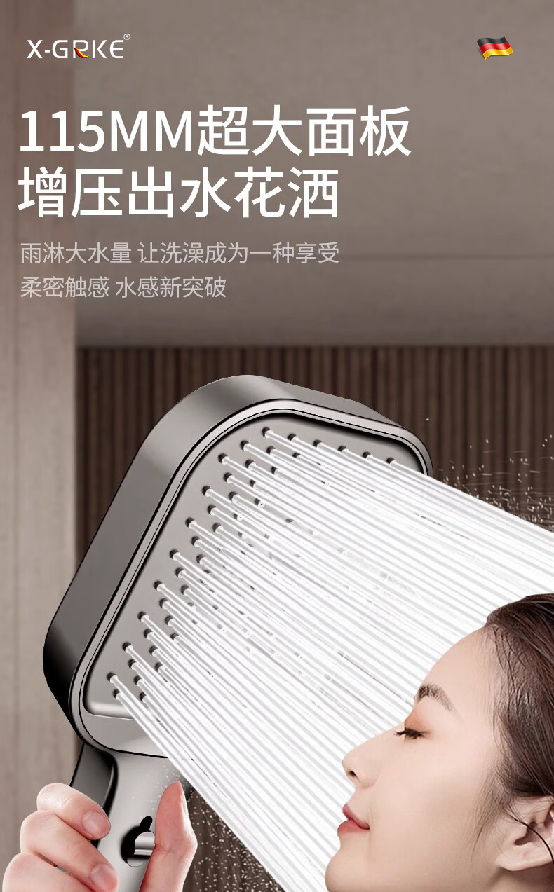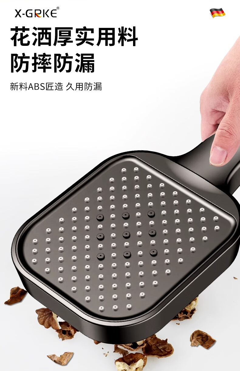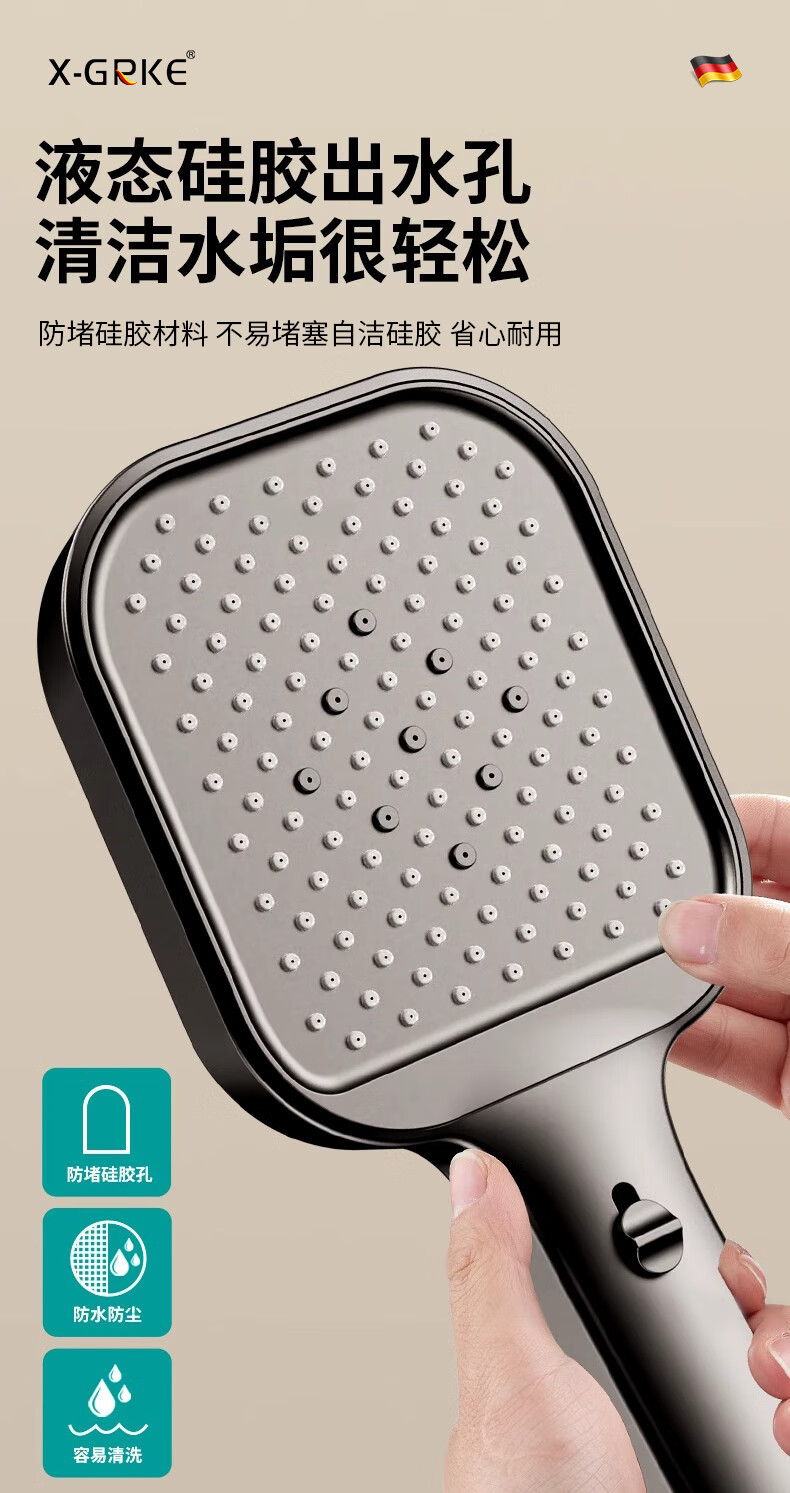 X-GRKE【德国】增压淋浴花洒喷头套装浴室洗澡多功能手持强劲加压莲蓬头 【枪灰】无极推钮花洒 无极出水切换丨自洁硅胶大面板