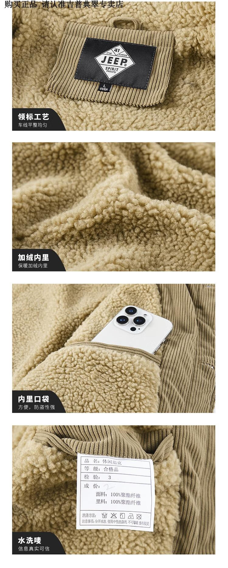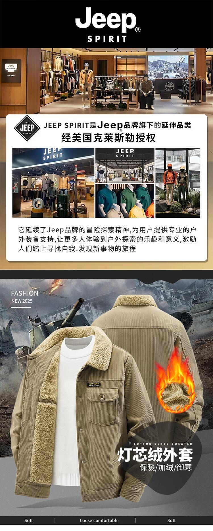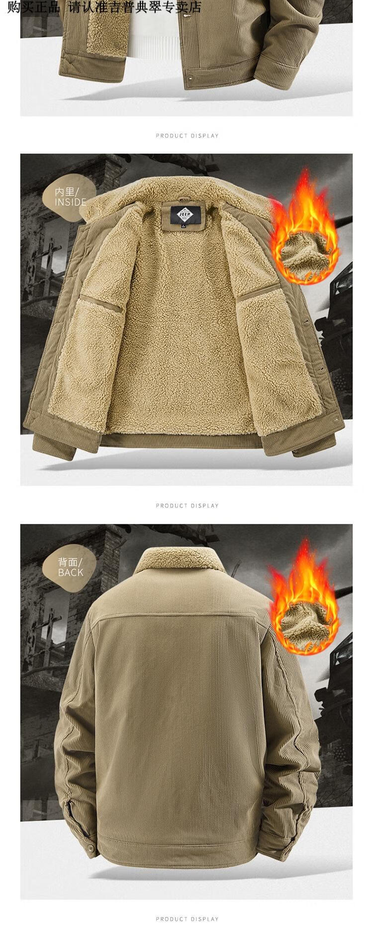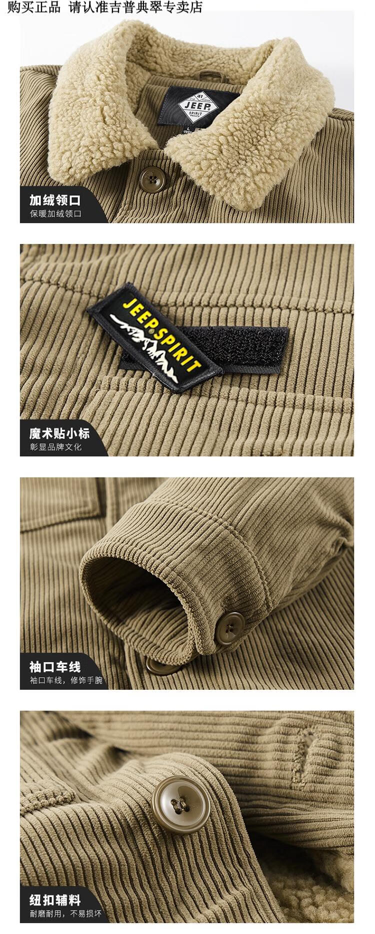 JEEP SPIRIT吉普灯芯绒外套男士冬季卸寒保暖中年爸爸加绒加厚羊羔绒翻领夹克 卡其(加绒) 加厚 M (95-100斤)