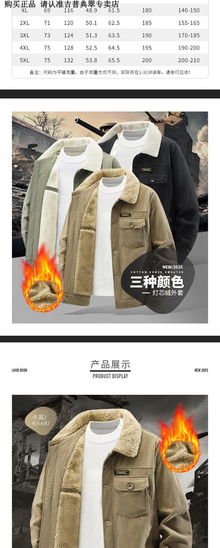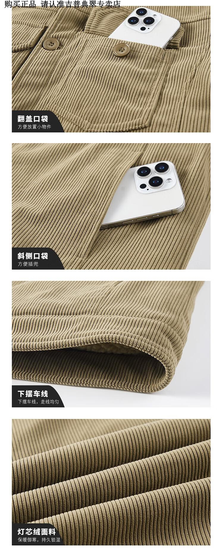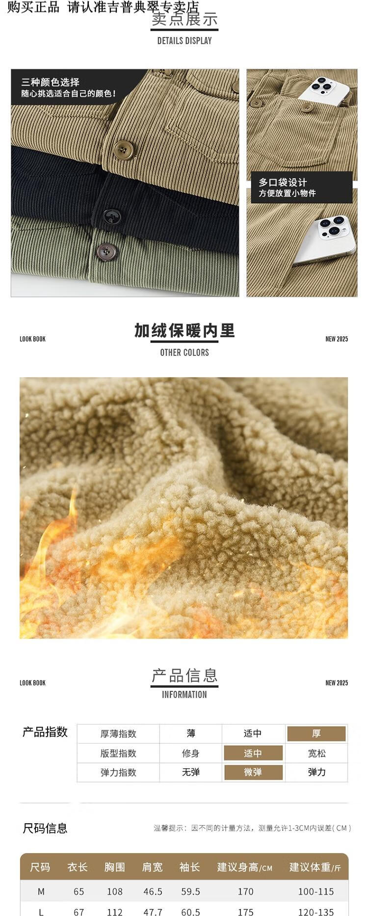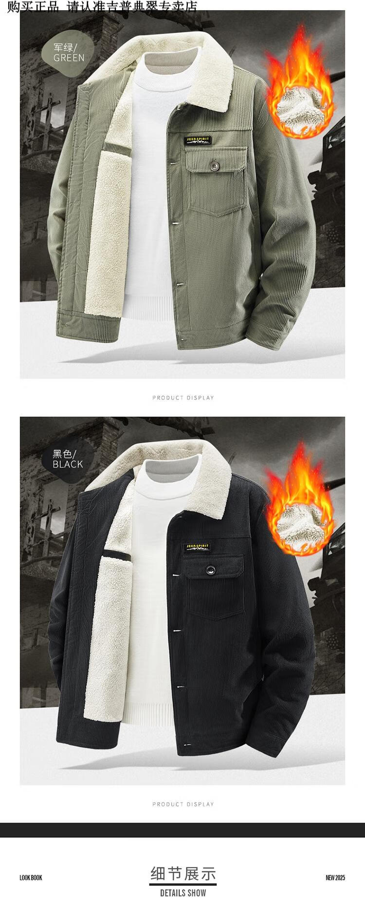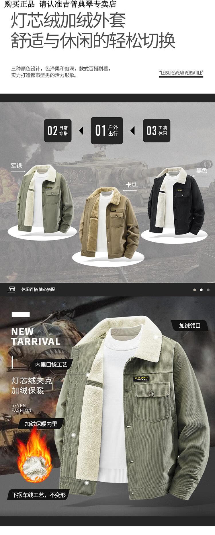 JEEP SPIRIT吉普灯芯绒外套男士冬季卸寒保暖中年爸爸加绒加厚羊羔绒翻领夹克 卡其(加绒) 加厚 M (95-100斤)