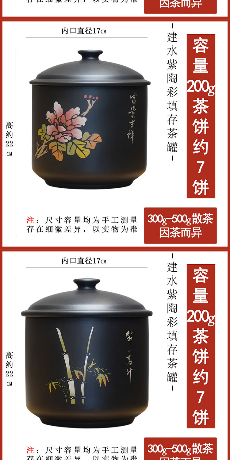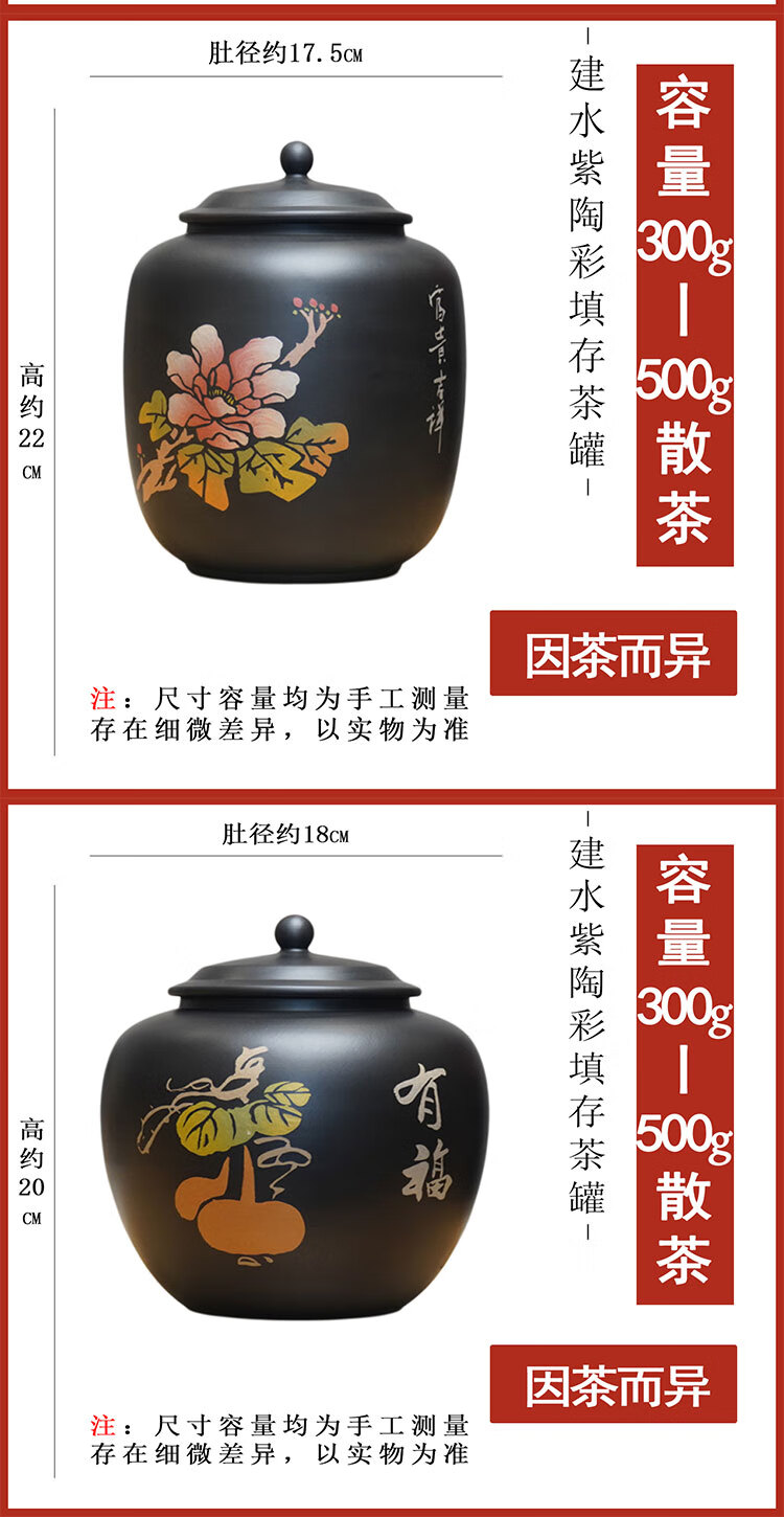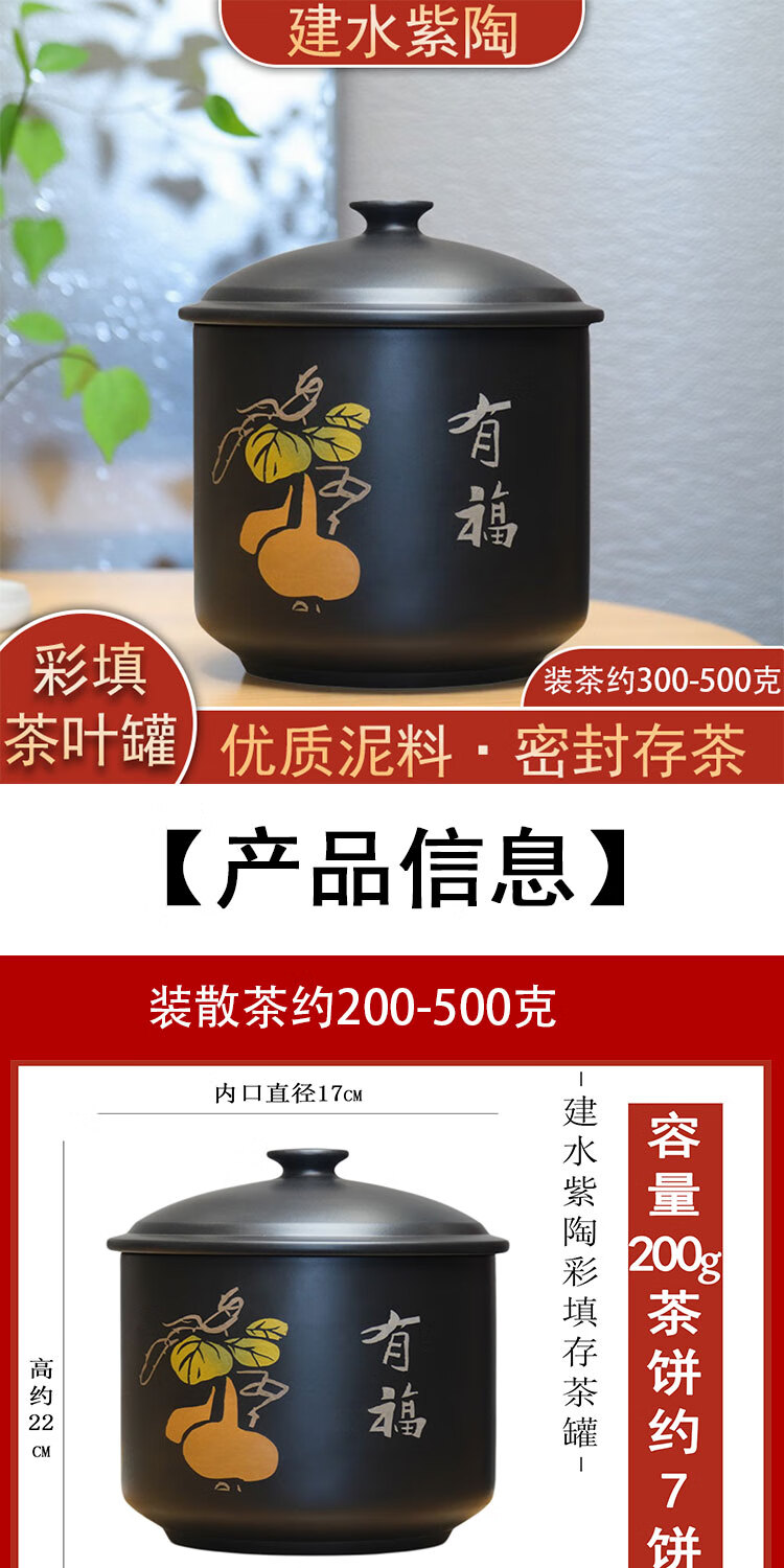 茗垚建水紫陶小号茶叶罐纯手工精品散茶罐茶饼罐防潮密封罐陈皮储存罐 【精品】一款 富贵吉祥 彩填茶叶罐 散茶约300-500g