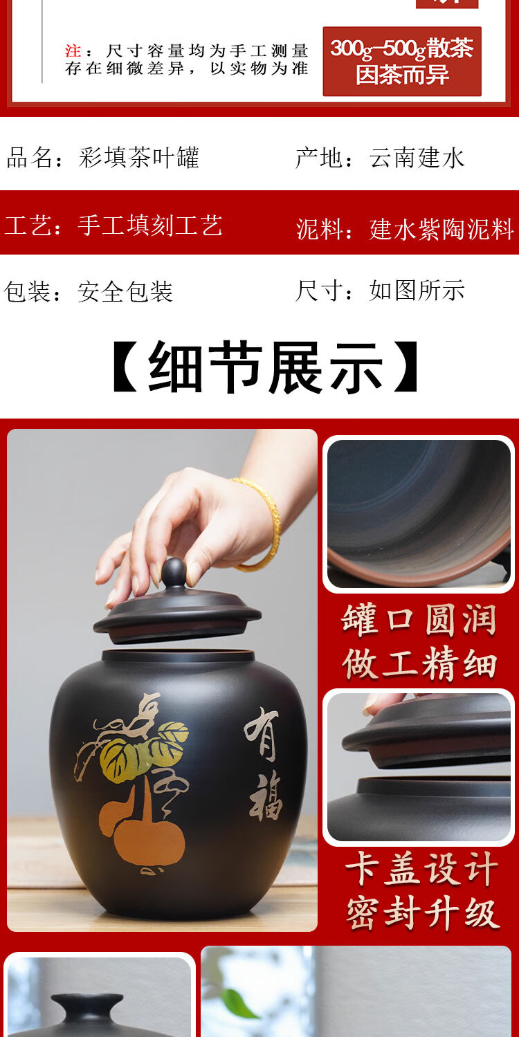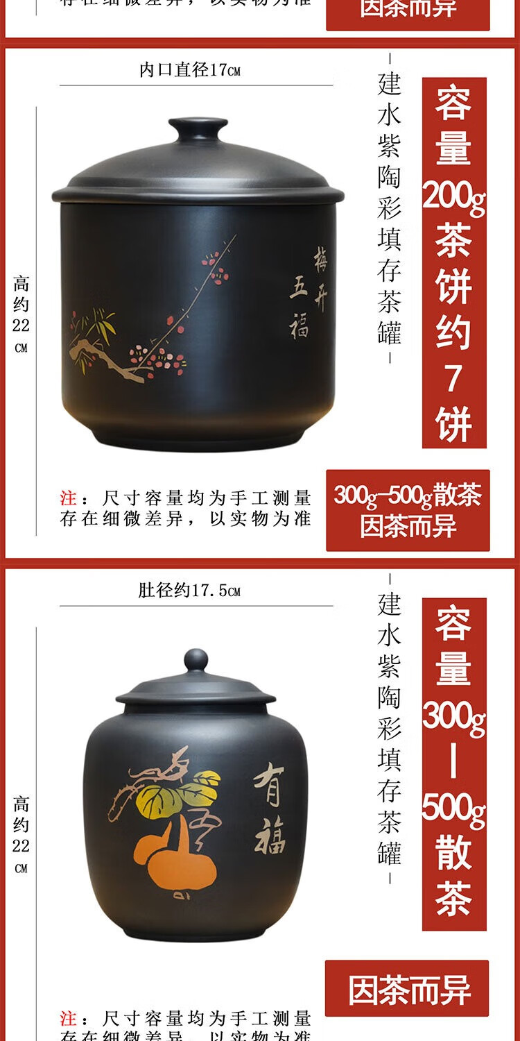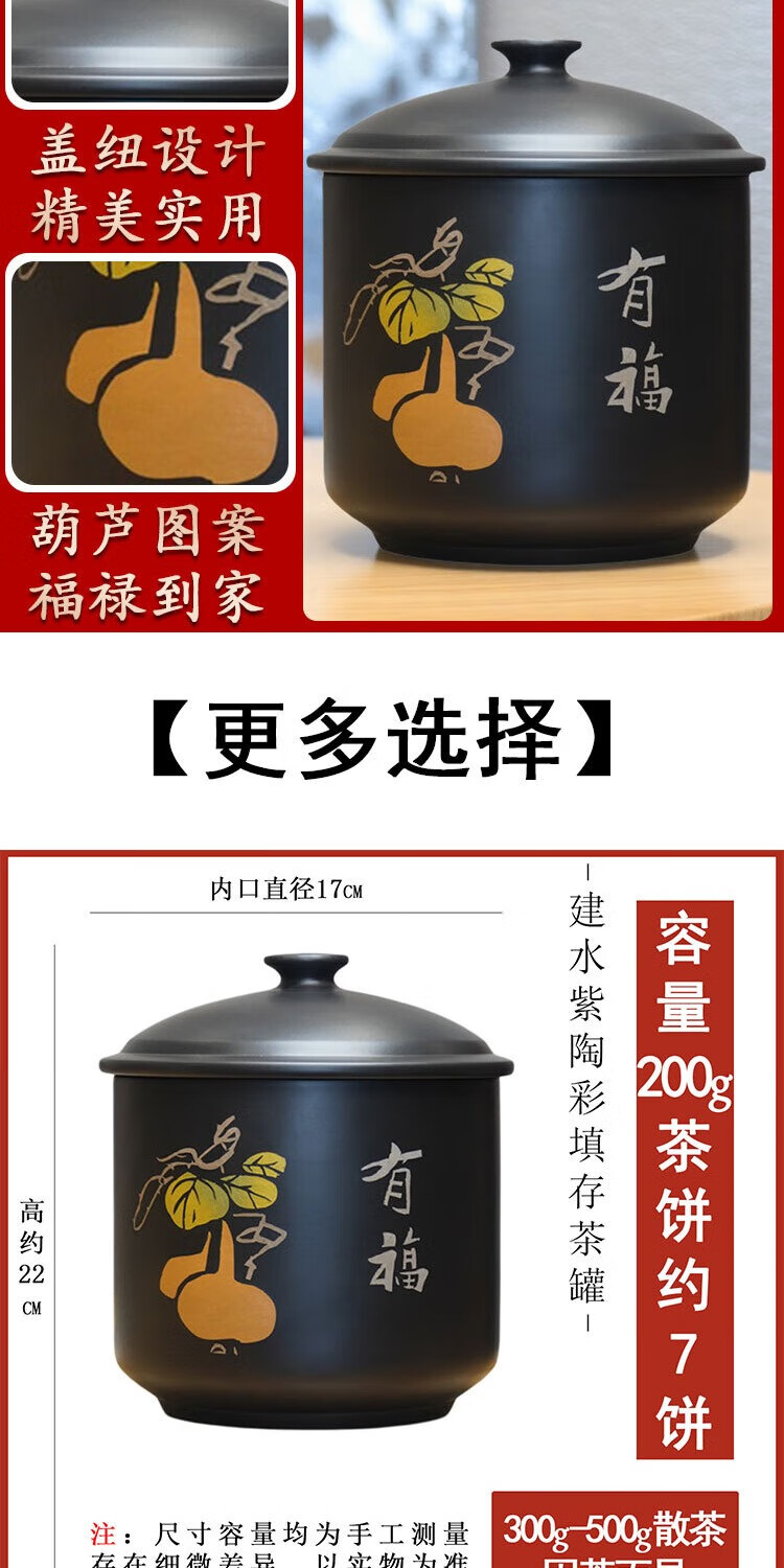 茗垚建水紫陶小号茶叶罐纯手工精品散茶罐茶饼罐防潮密封罐陈皮储存罐 【精品】一款 富贵吉祥 彩填茶叶罐 散茶约300-500g