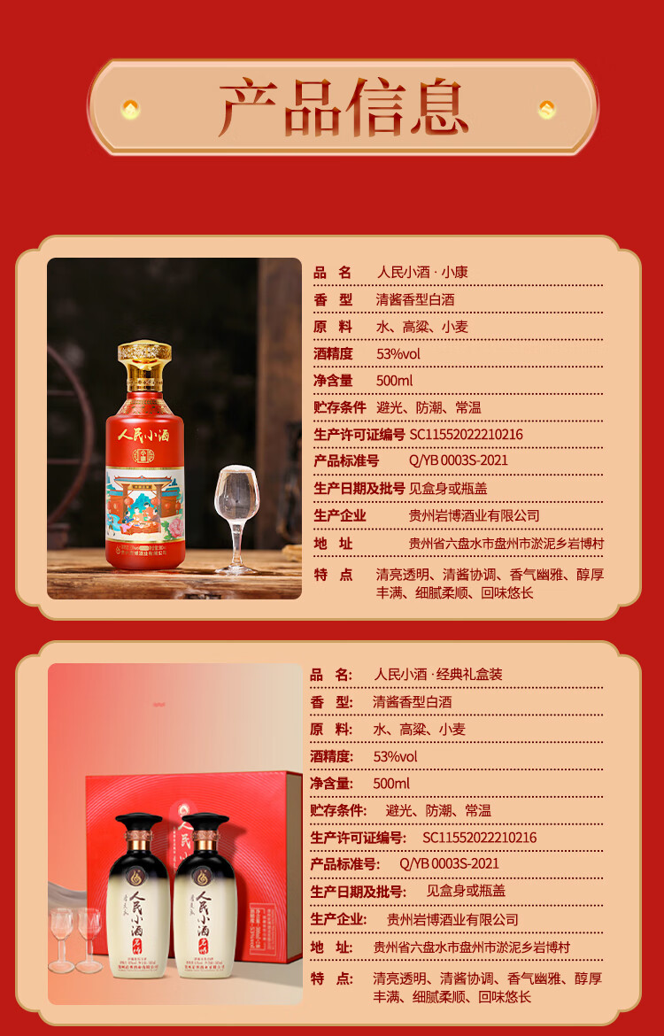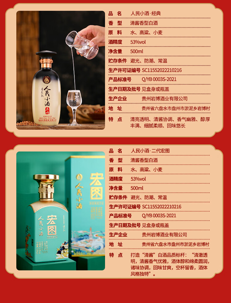 人民小酒 53度清酱香型白酒 纯粮食酿制高度白酒 送礼佳品 53度 500mL 2瓶 经典礼盒