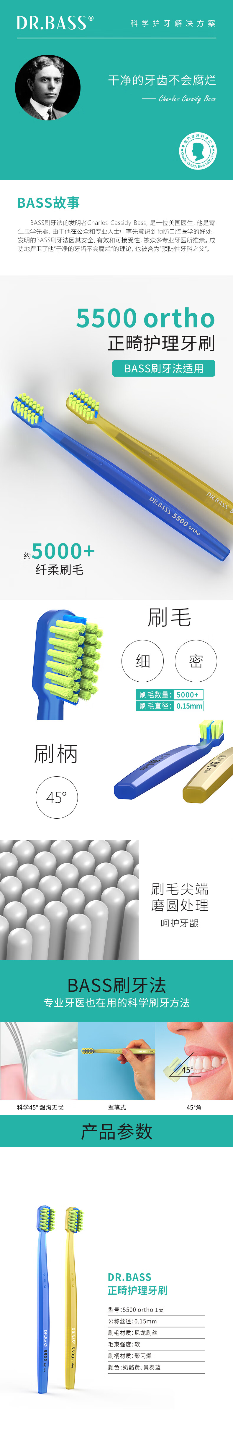 DR. BASS正畸护理软毛牙刷成人青少年矫正固定U型牙套巴氏刷牙法专用牙刷 5500正畸牙刷 1支 景泰蓝