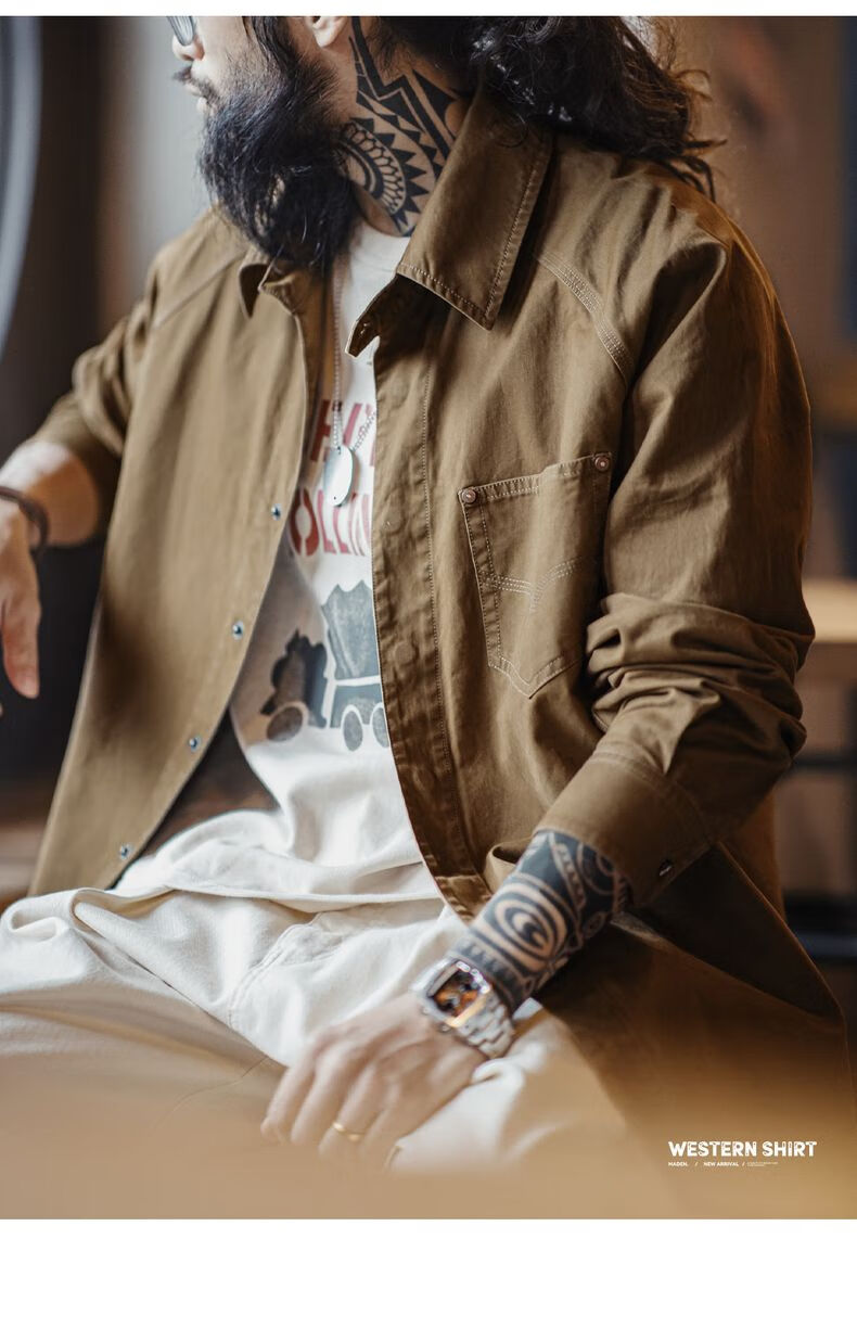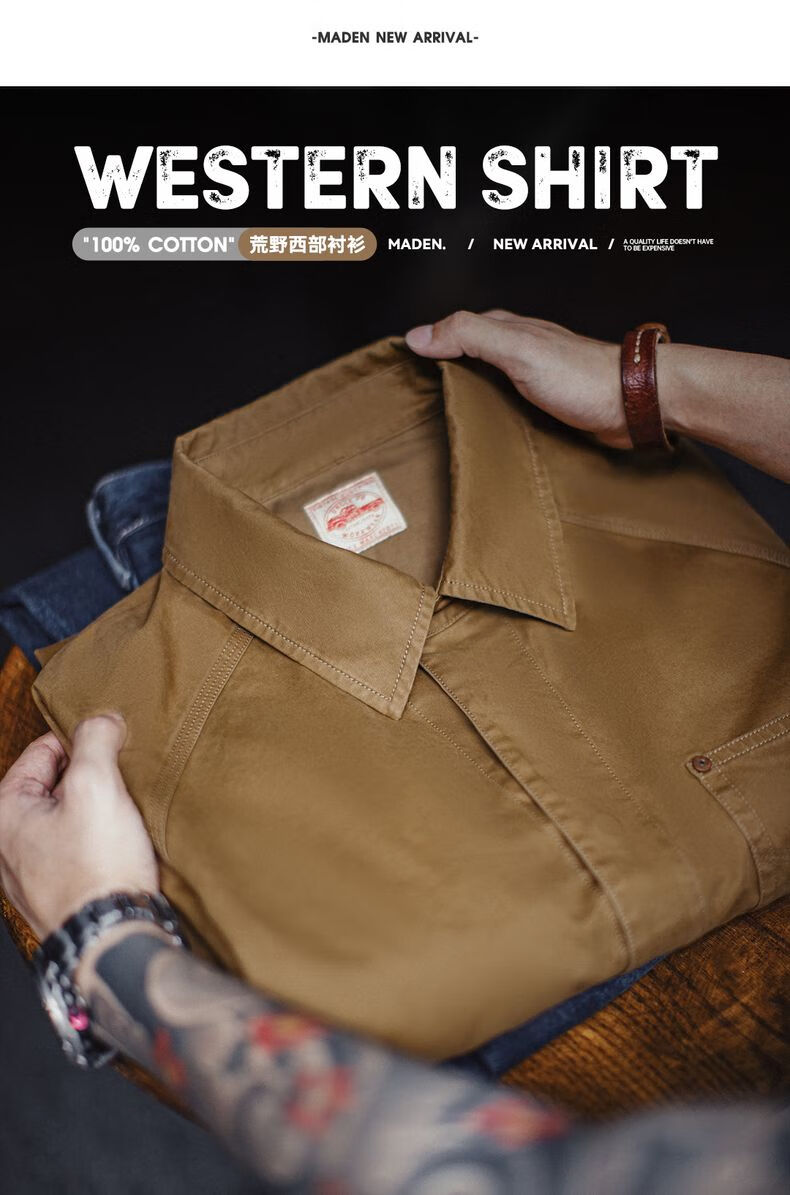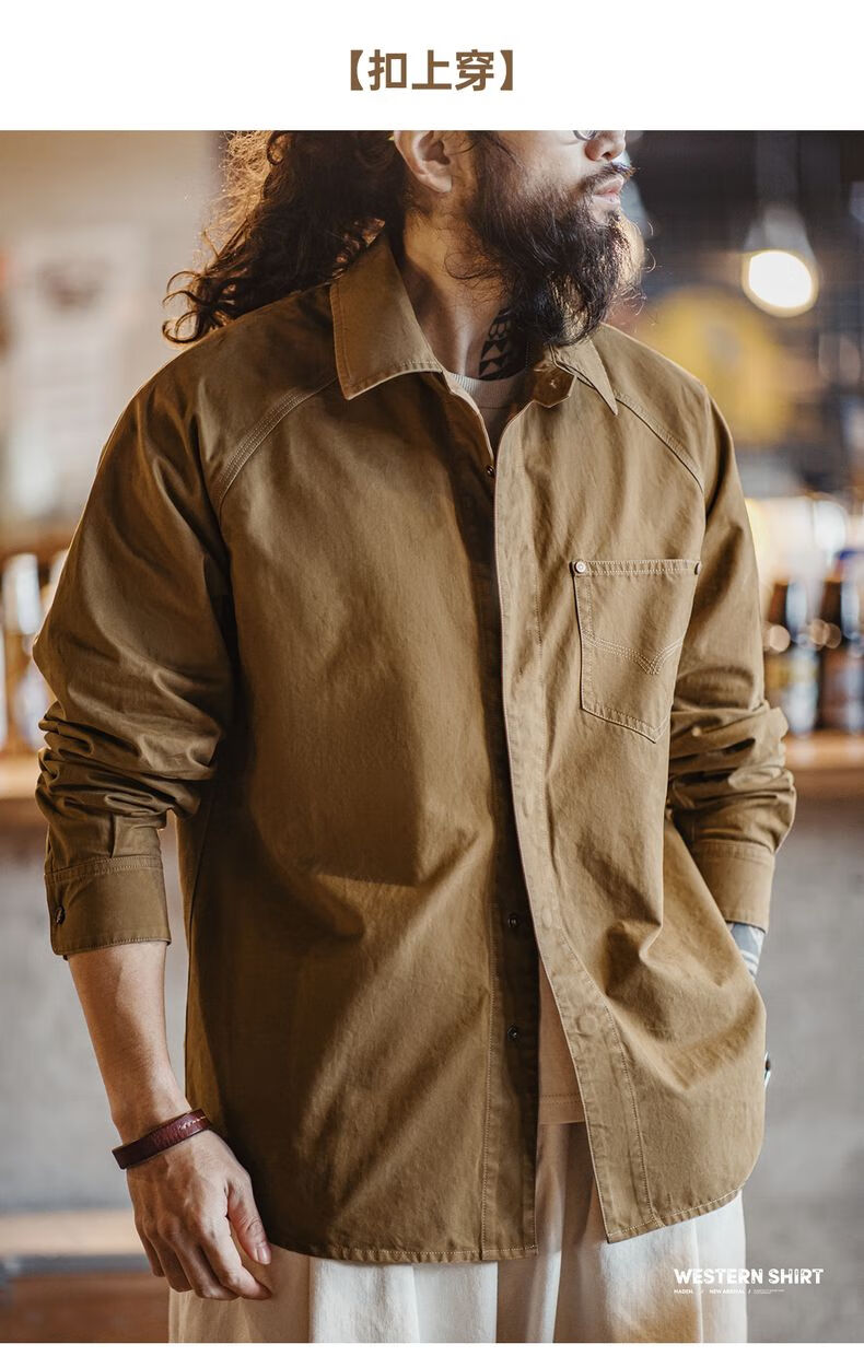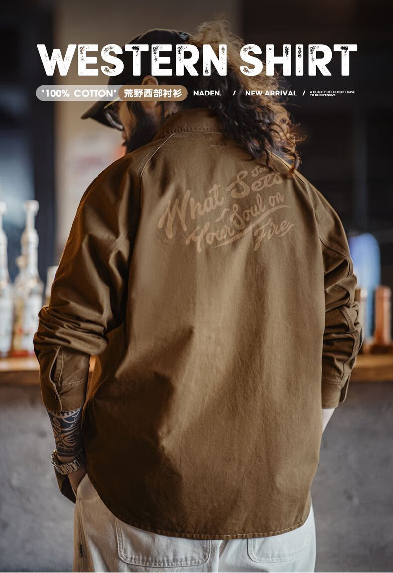 马登工装美式复古荒野西部衬衫美拉德印花牛仔衬衣纯棉长袖外套男秋 榛子棕 L (175)