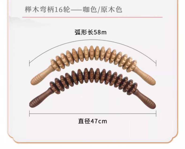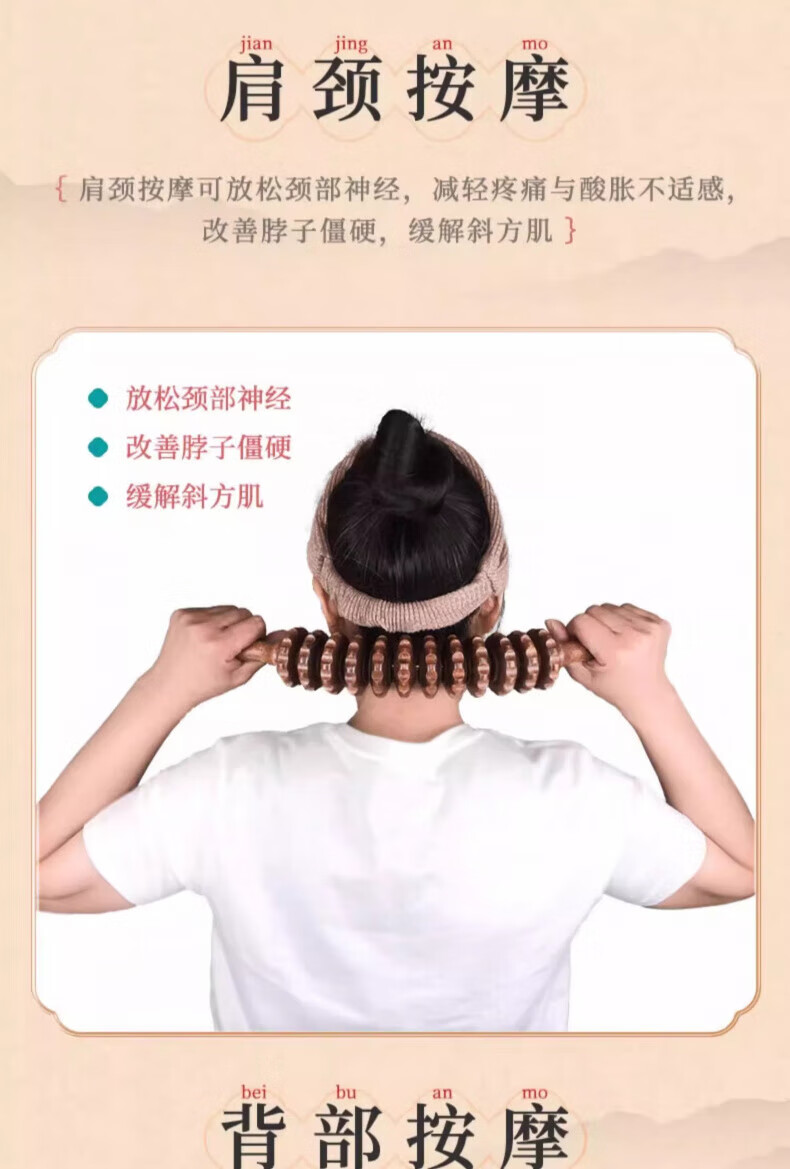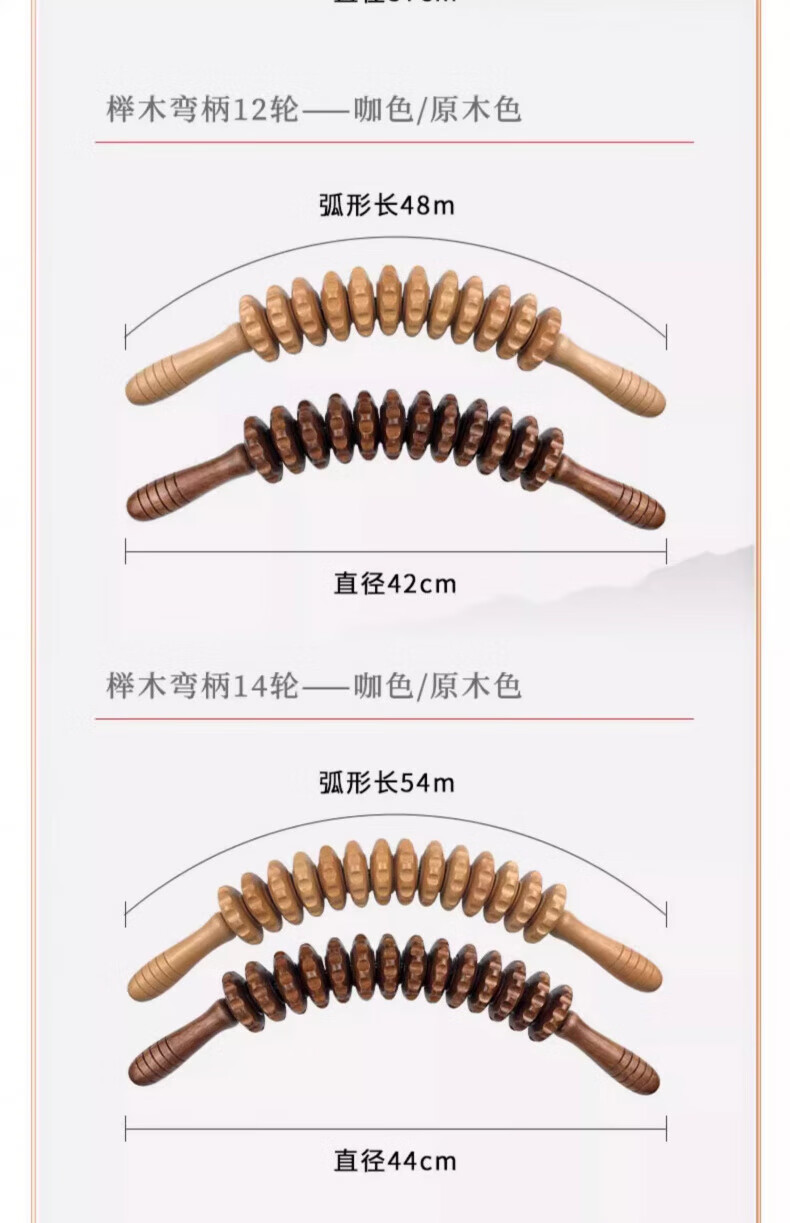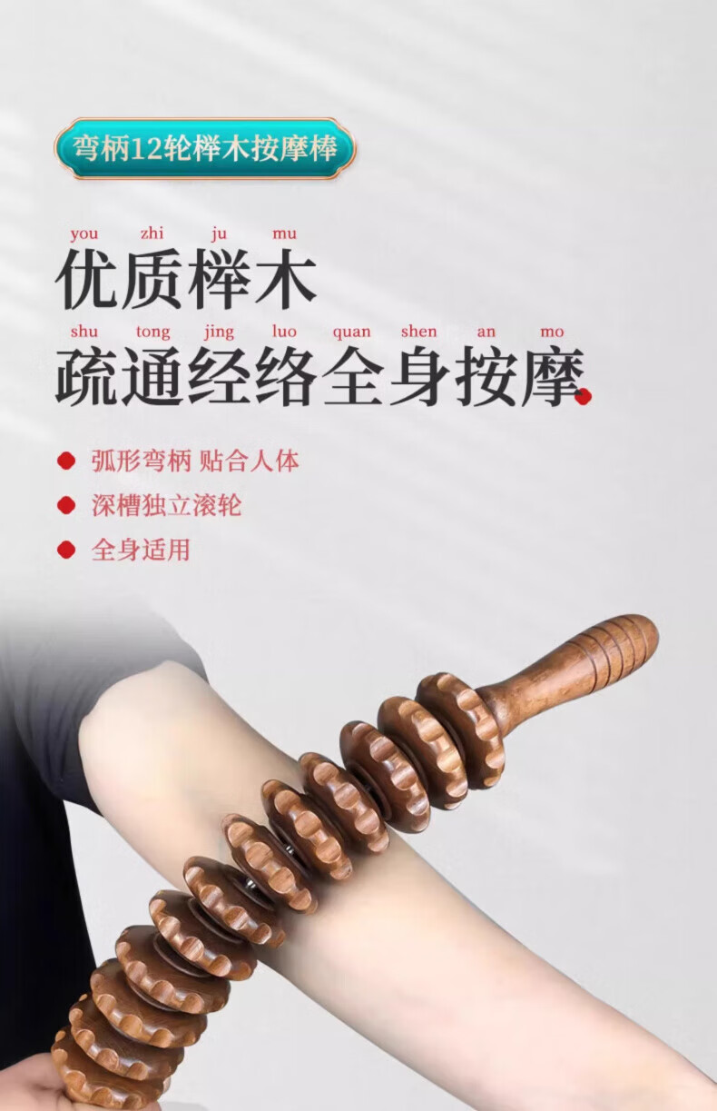 AILUKI日本擀筋棒实木弯柄滚轮全身肩颈椎经络疏通揉腹肚子开 原色直柄12轮____