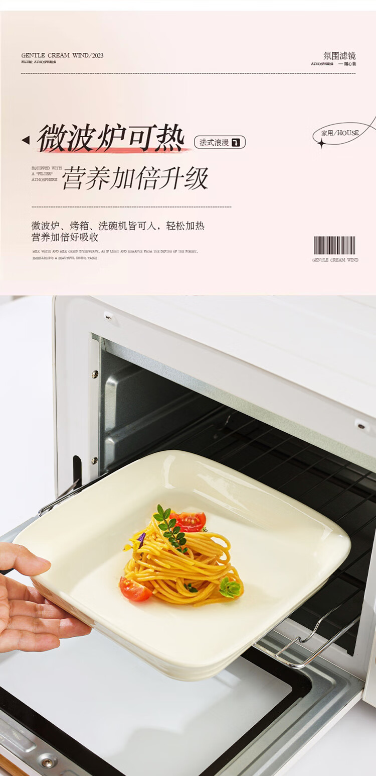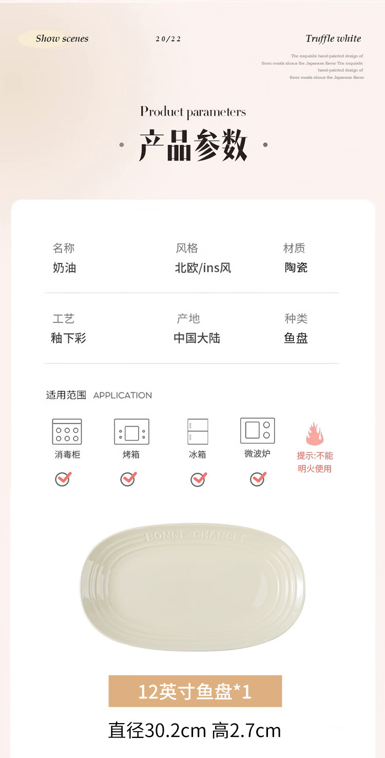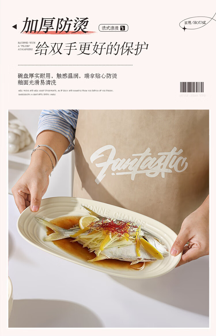 贺川屋陶瓷鱼盘奶油风高颜值陶瓷盘釉下彩12英寸蒸鱼盘菜盘子