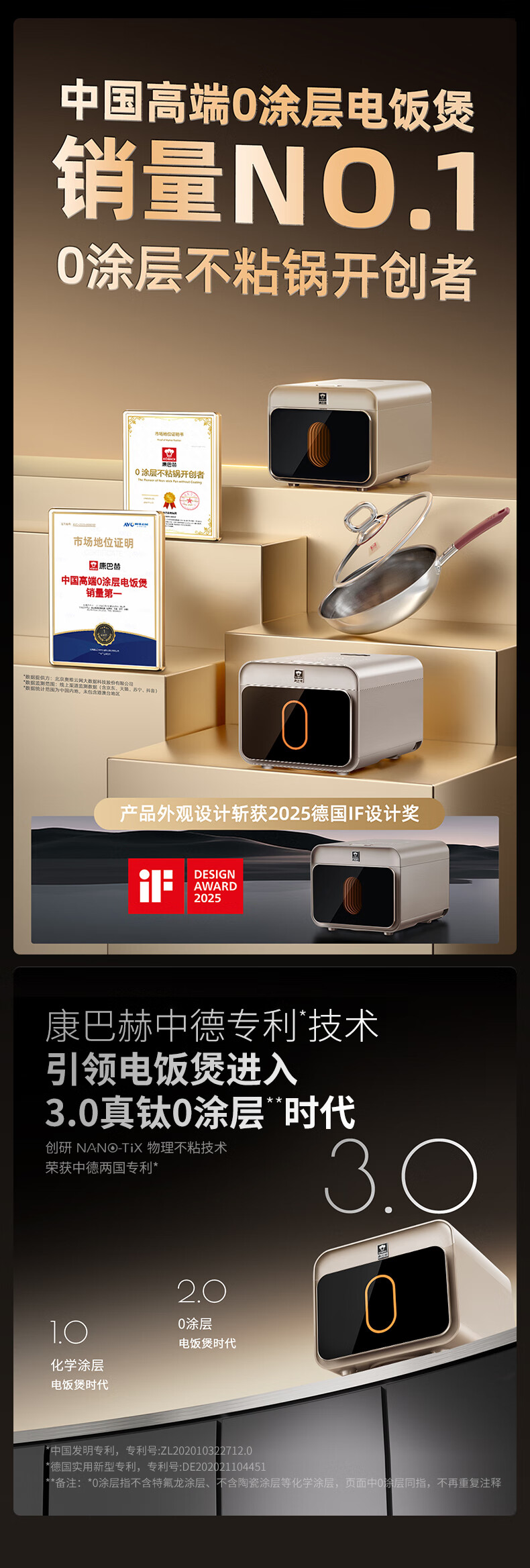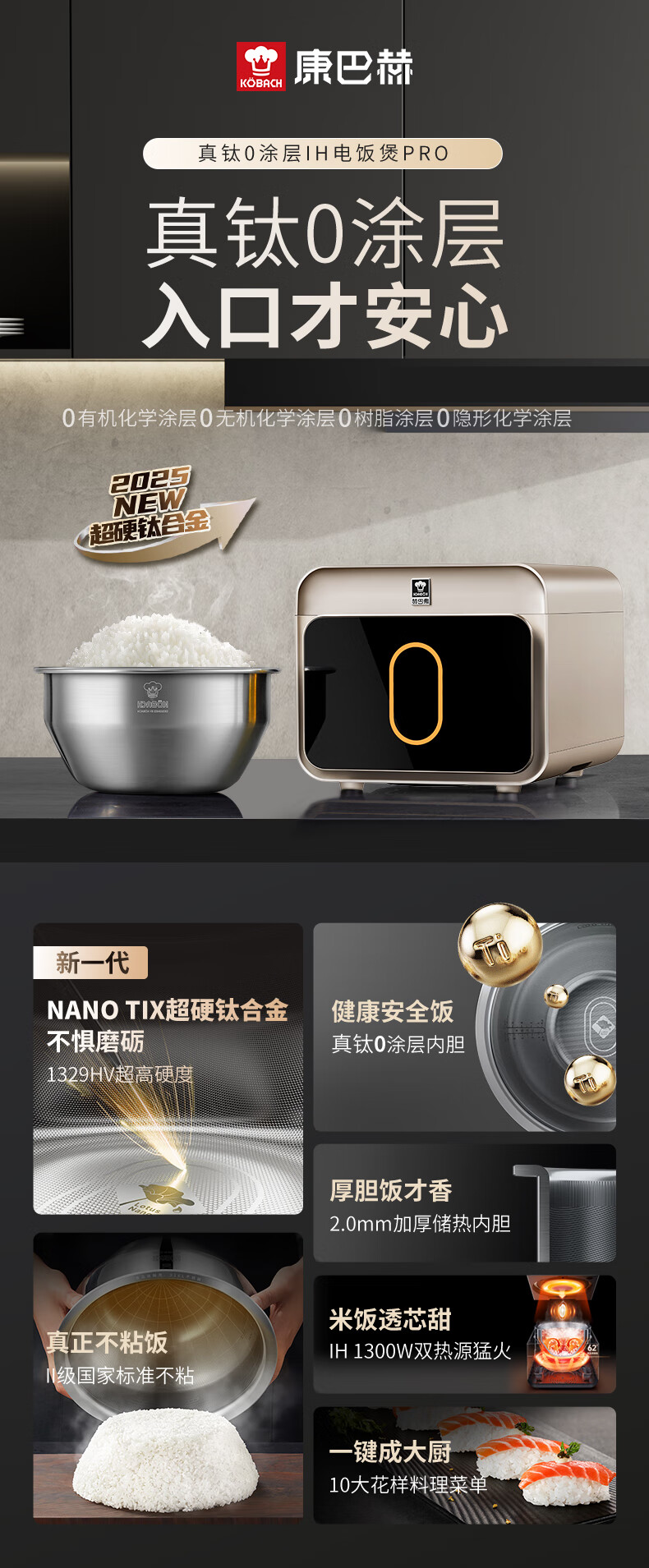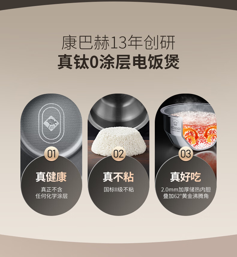 康巴赫电饭煲0涂层真钛内胆IH电磁加热智能电饭锅多功能家用2-8人大容量不粘锅大火力Pro 星耀金 3L