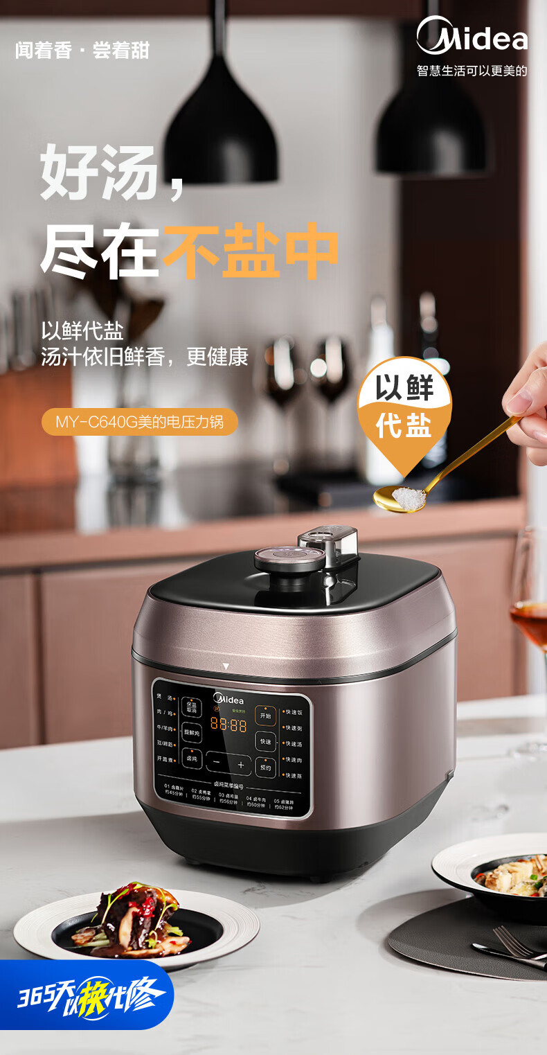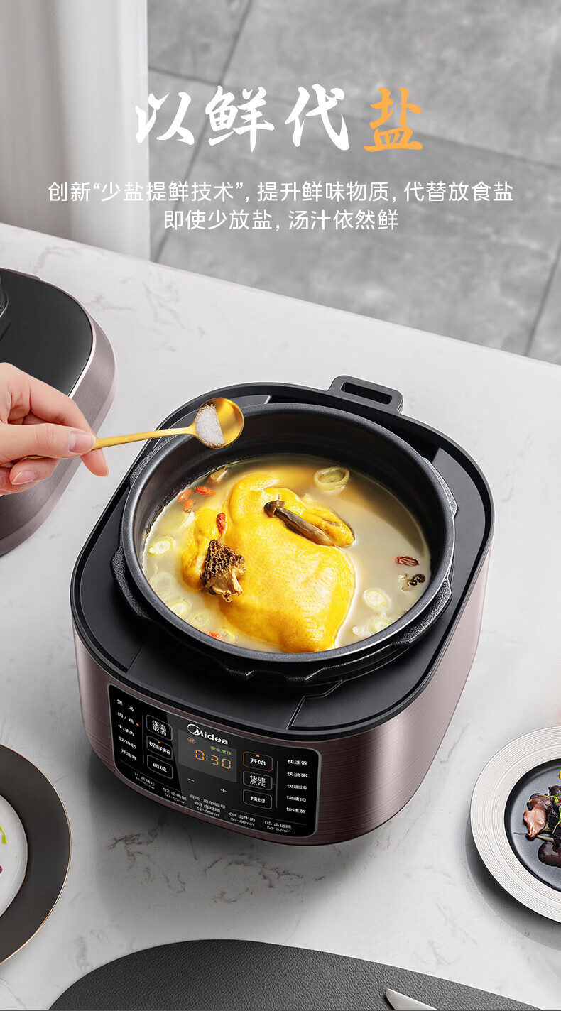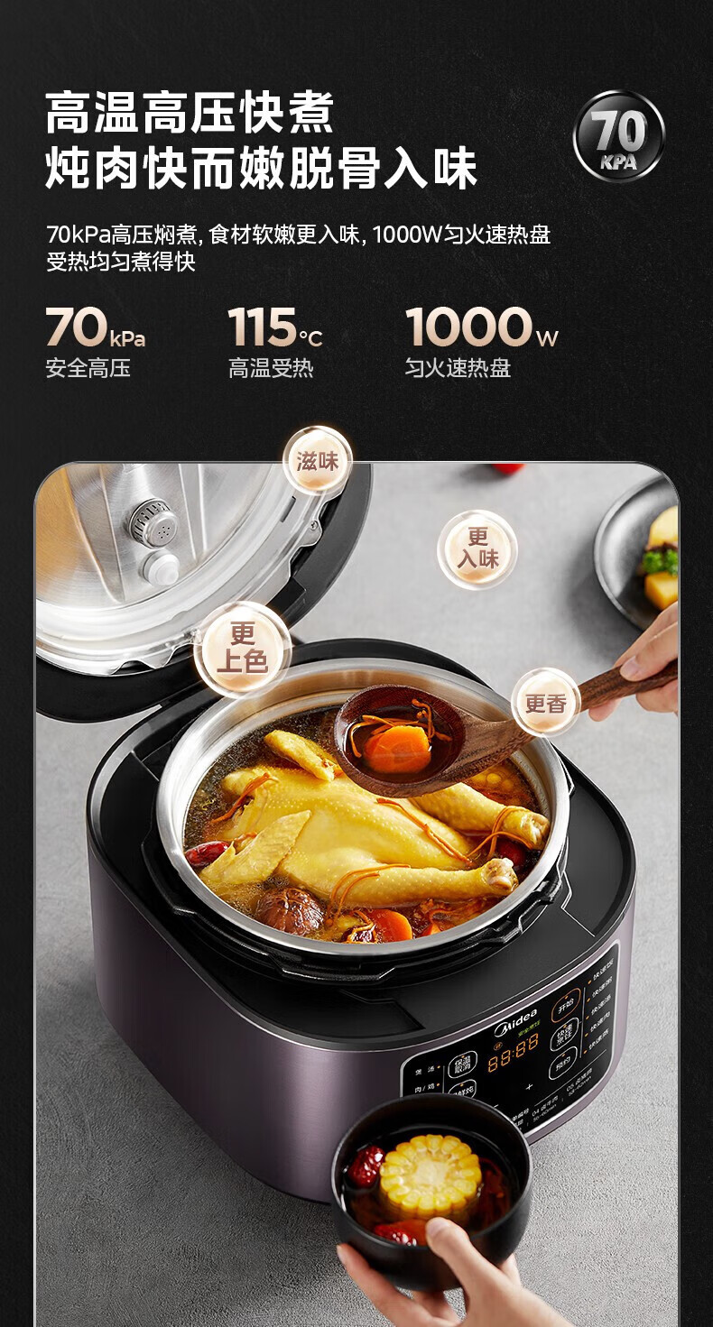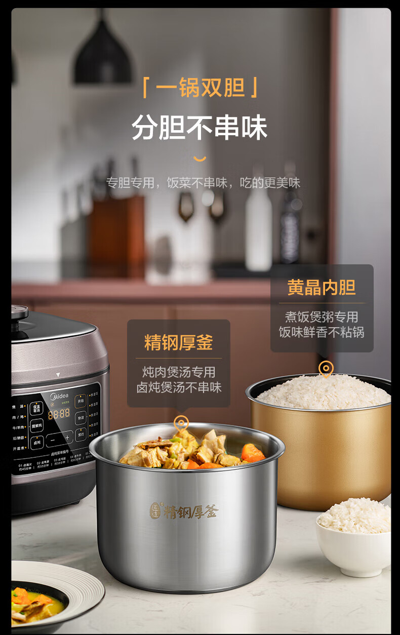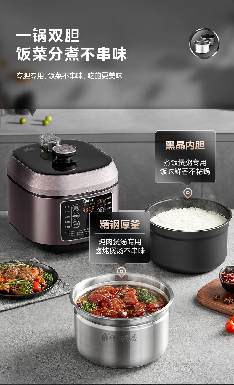美的电压力锅高压锅 高压电饭锅 自动电饭煲压力锅 不锈钢内胆 0涂层系列 【0涂层内胆+黑晶内胆】MY-C540- 5L