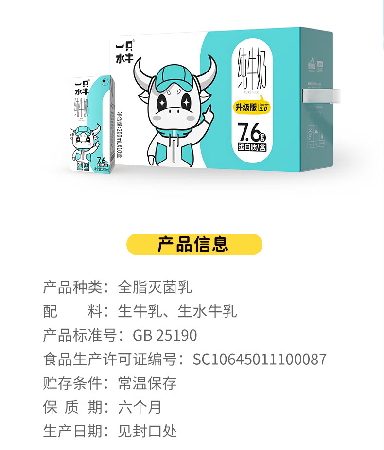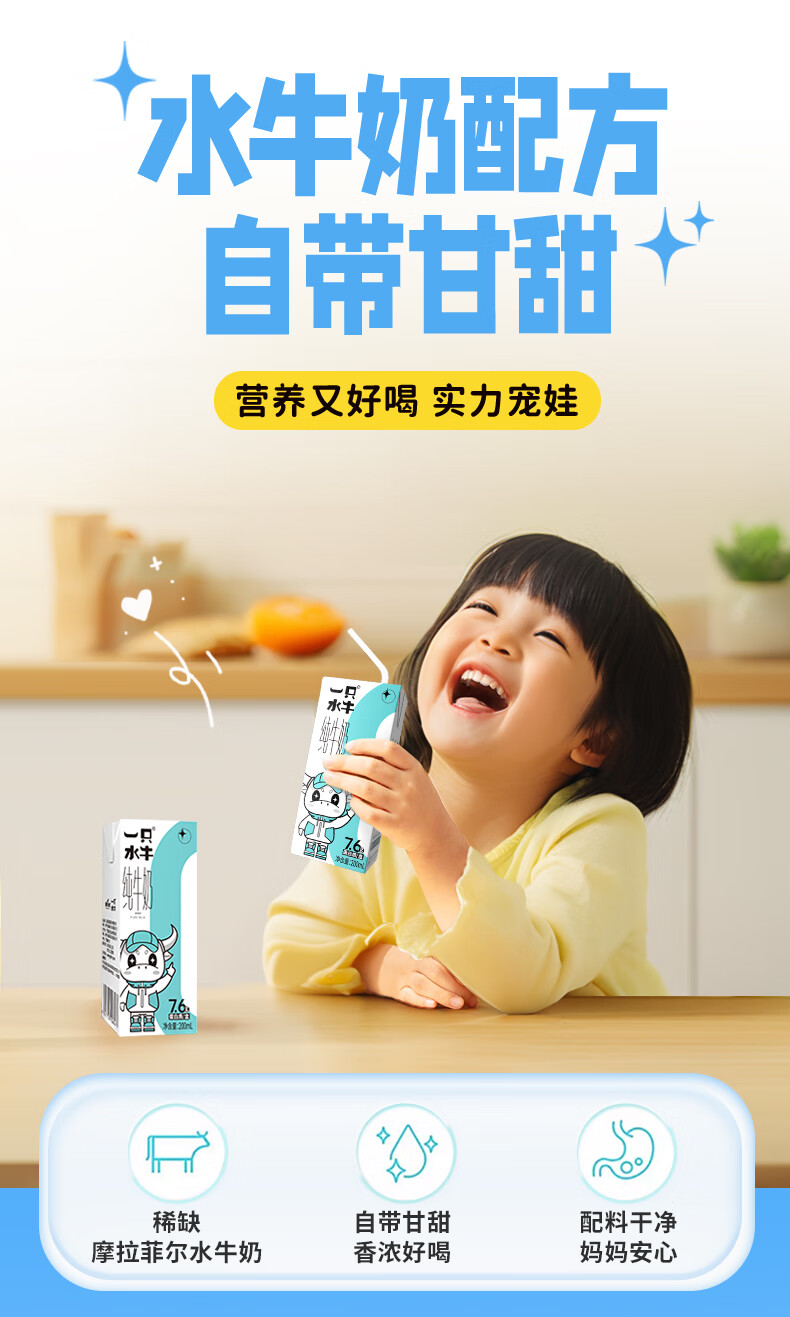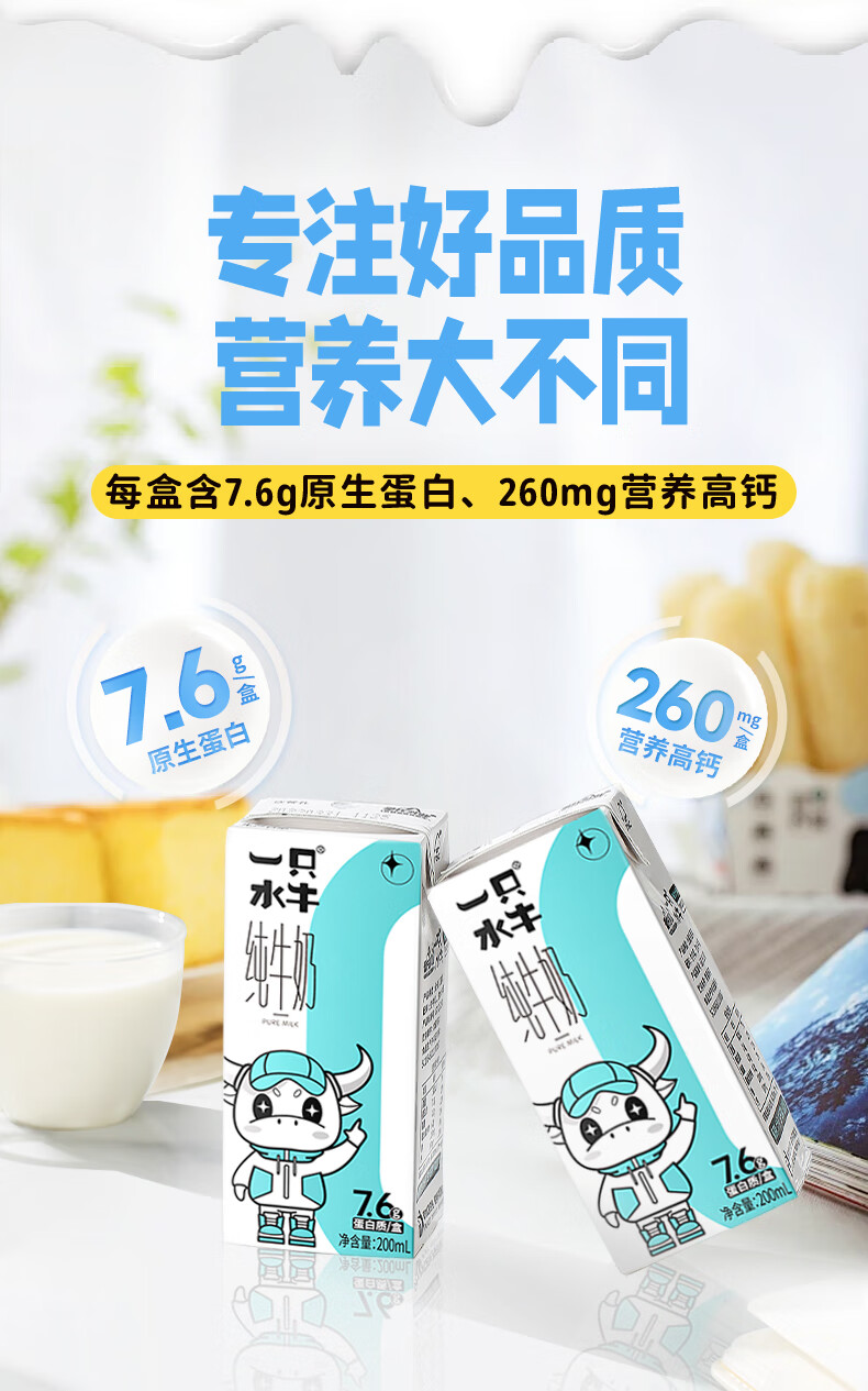 一只水牛皇氏儿童宝宝低脂纯牛奶 7.6g蛋白质 【2箱】低脂纯牛奶200ml*10盒