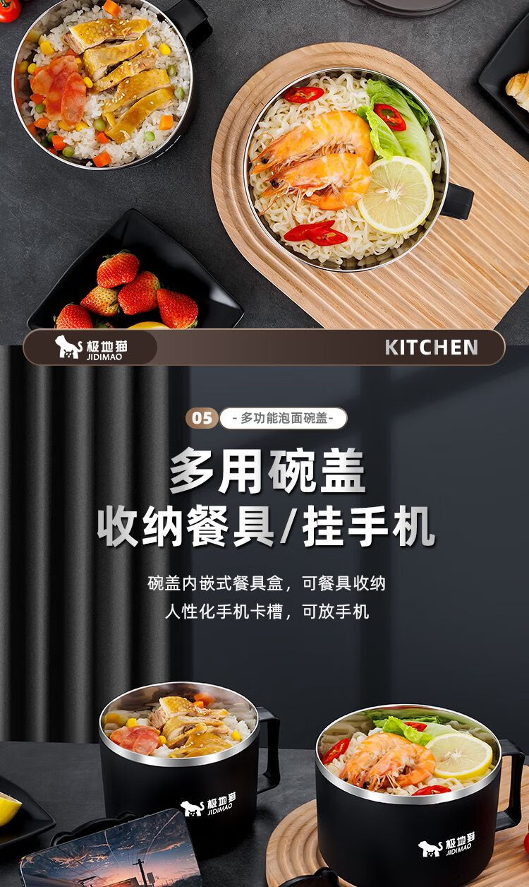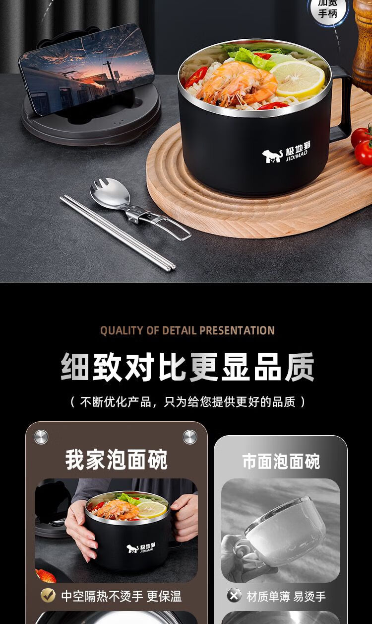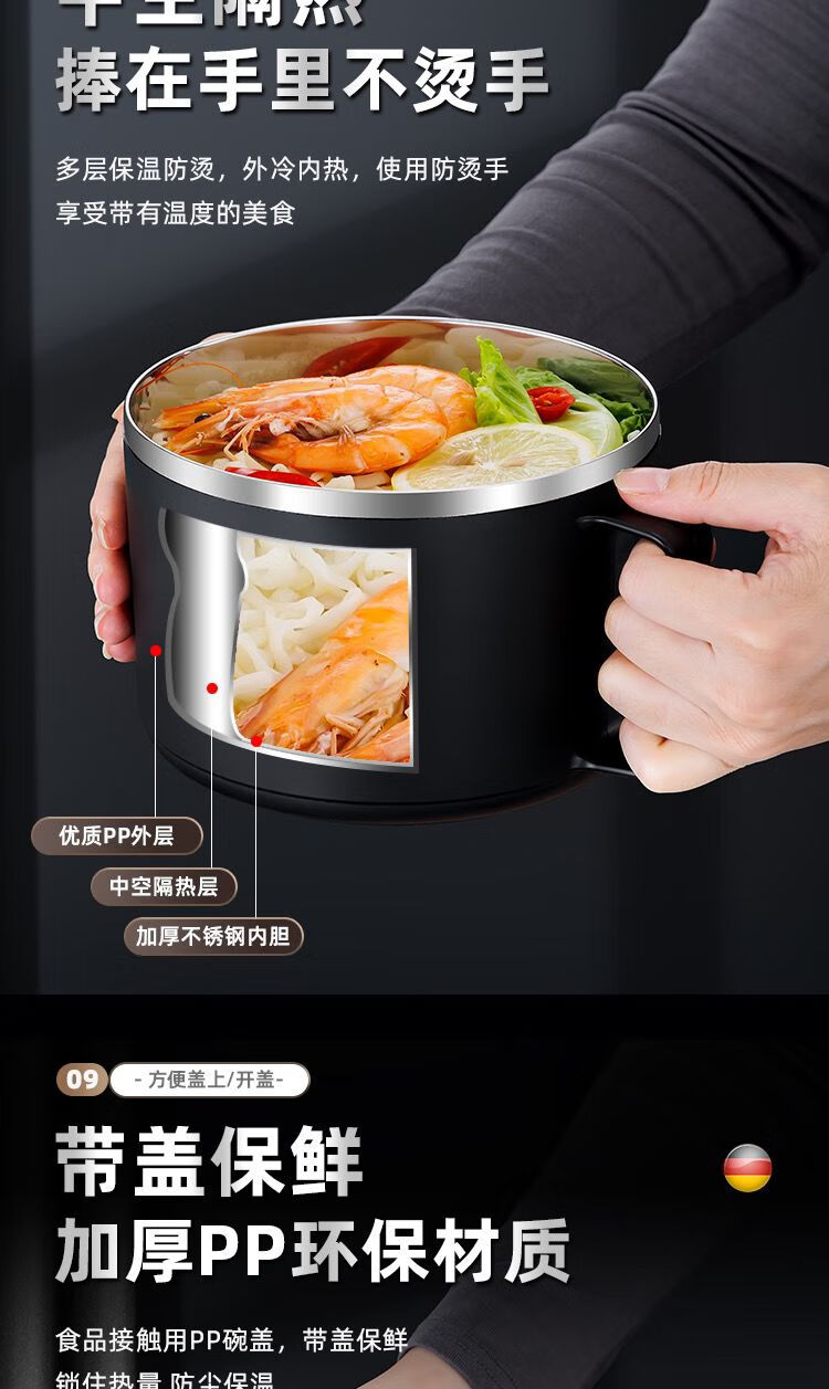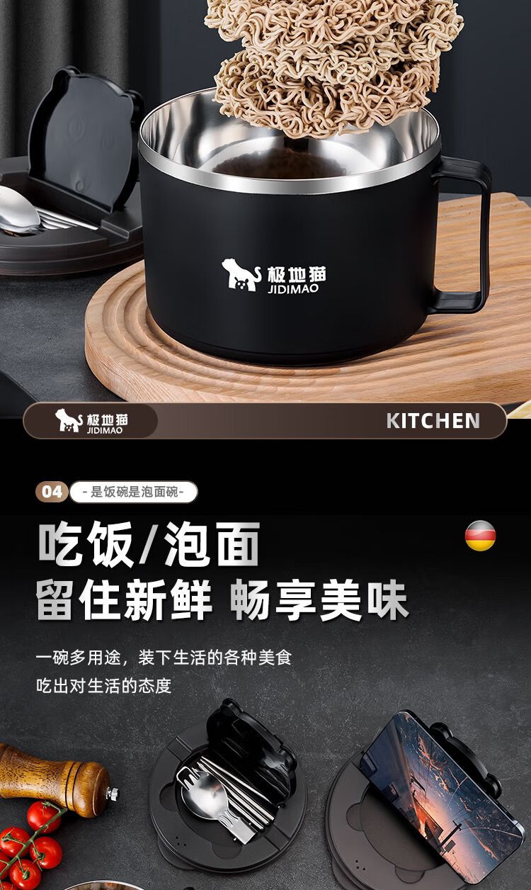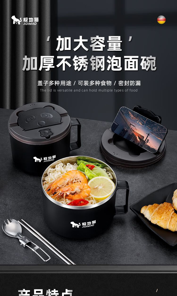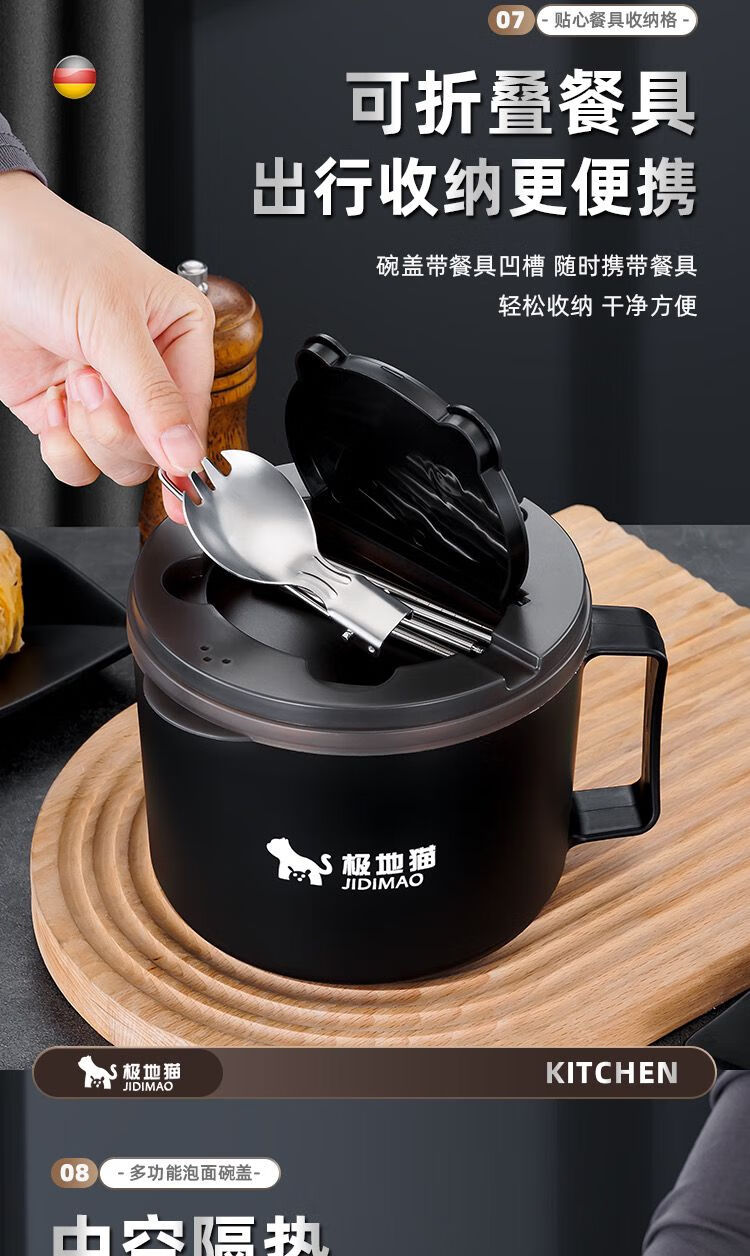 DEATKN不锈钢泡面碗带盖大容量日式可沥水方便面碗学生饭碗筷套装 JDM新款【不锈钢内胆】1500ml 泡面碗+餐具收纳盖+不锈钢折叠筷勺