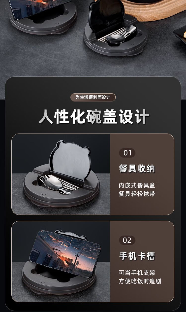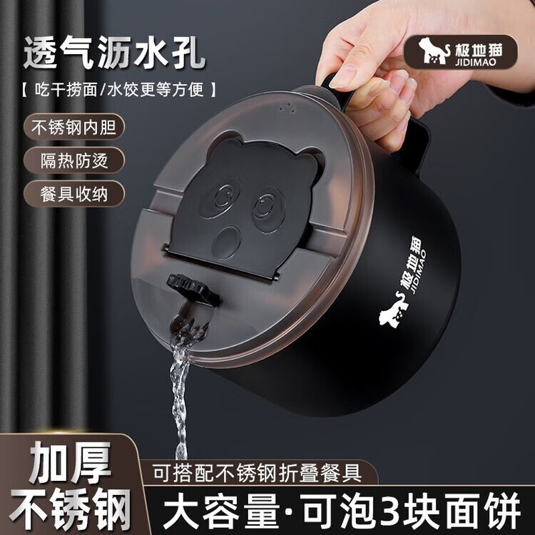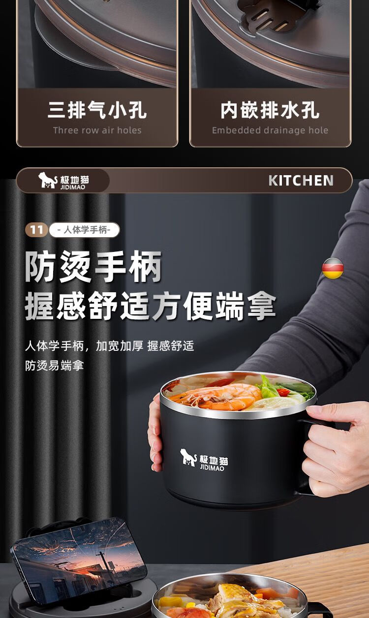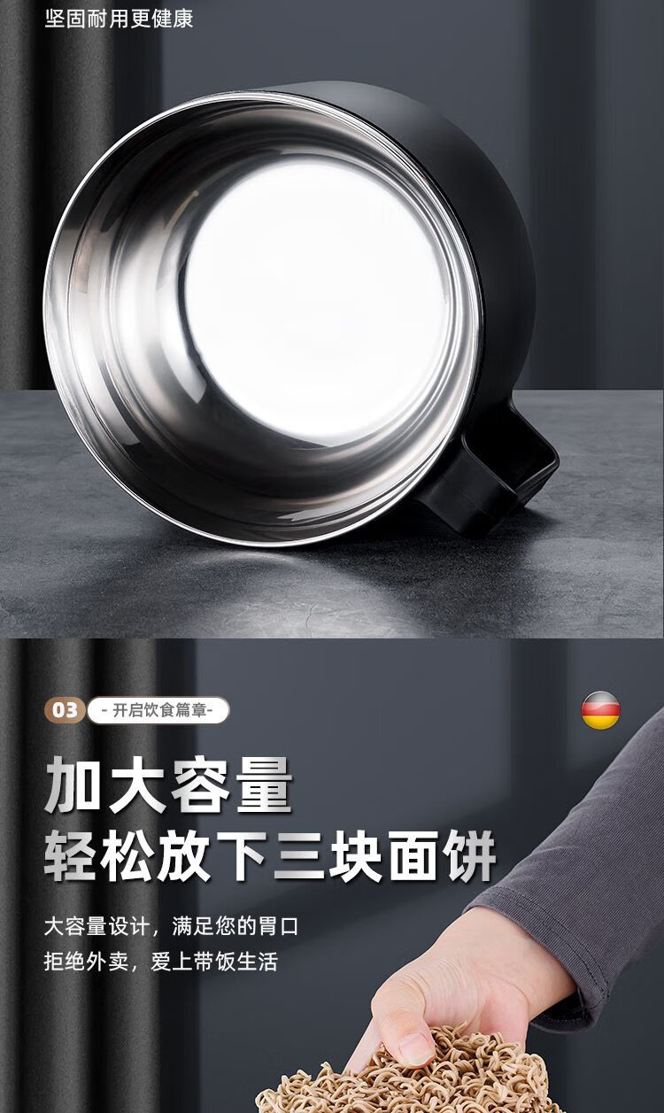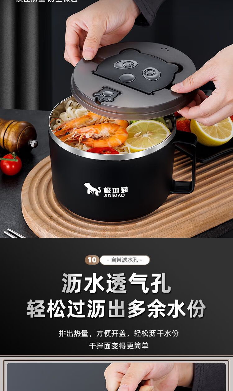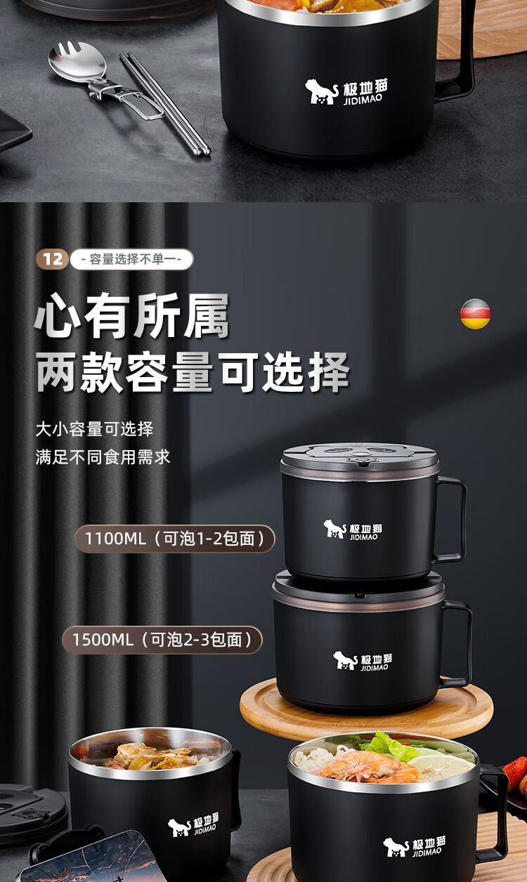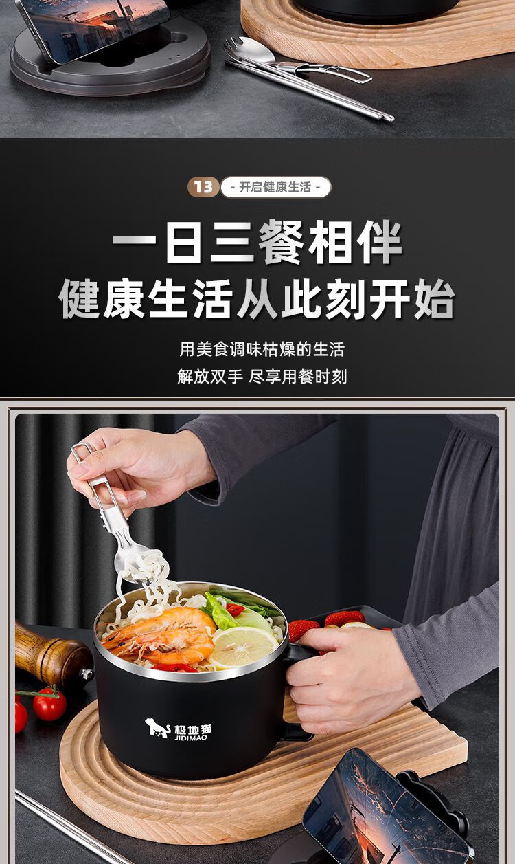 DEATKN不锈钢泡面碗带盖大容量日式可沥水方便面碗学生饭碗筷套装 JDM新款【不锈钢内胆】1500ml 泡面碗+餐具收纳盖+不锈钢折叠筷勺