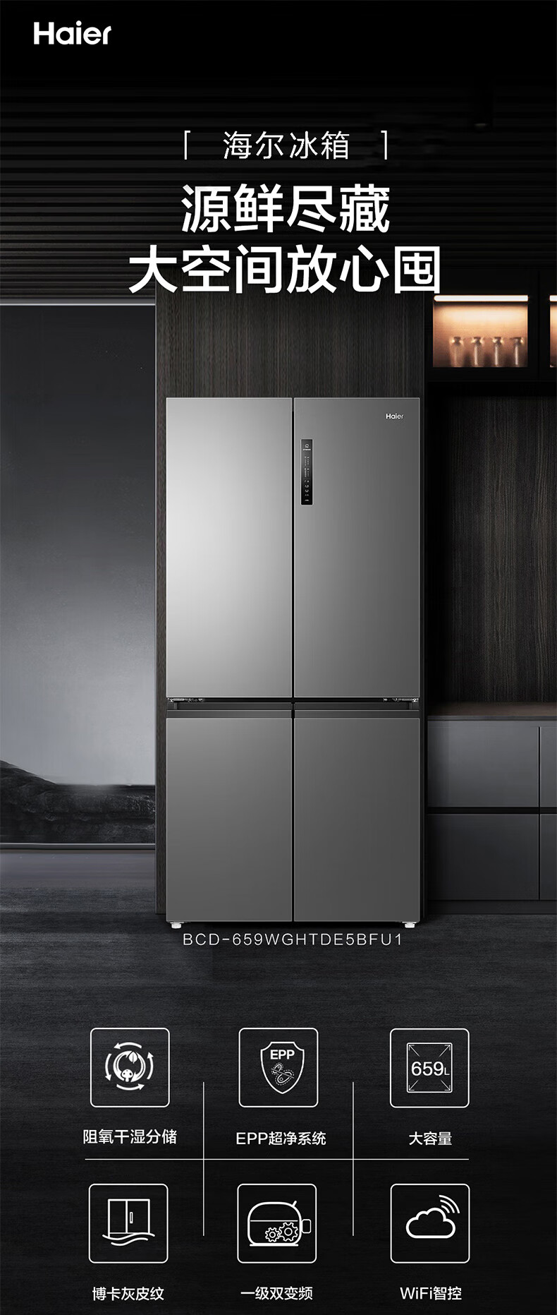 海尔(Haier)冰箱659升四开门十字对开门一级能效双变频风冷无霜EPP超净系统家用超大容量冰箱政府补贴20% 659升超大容量+阻氧干湿分储