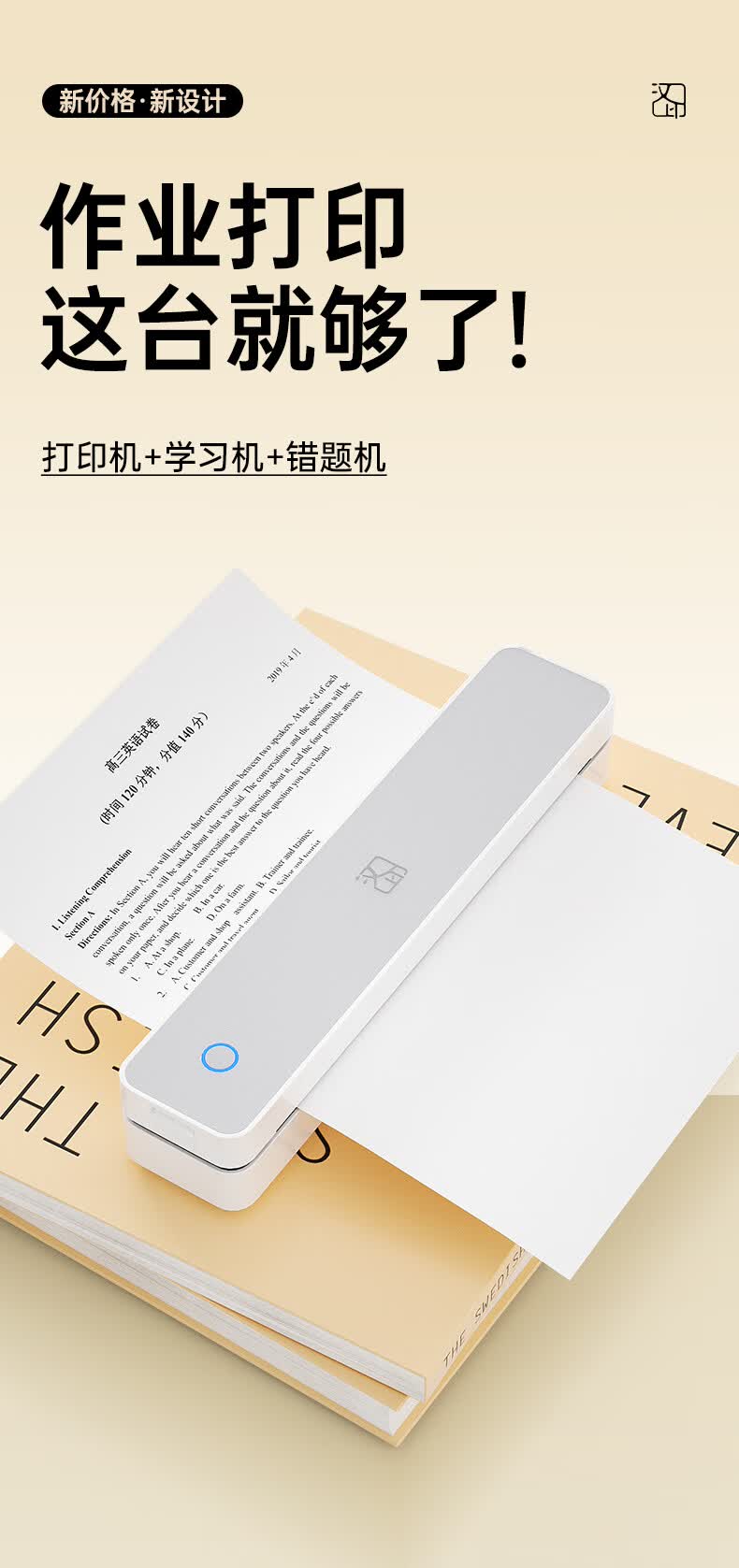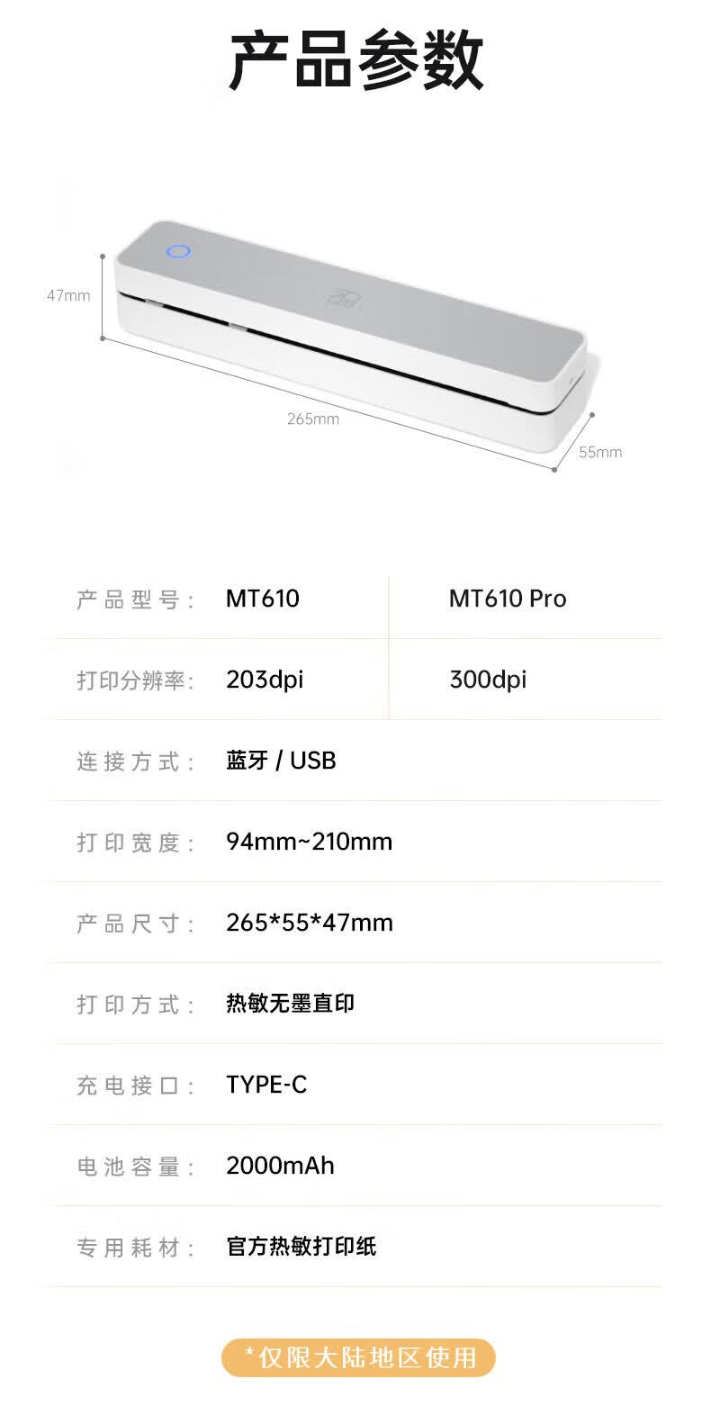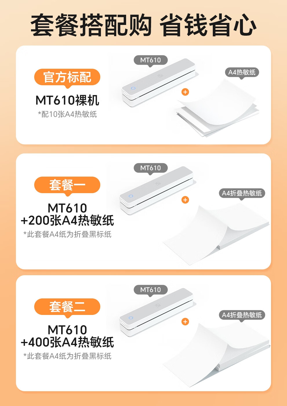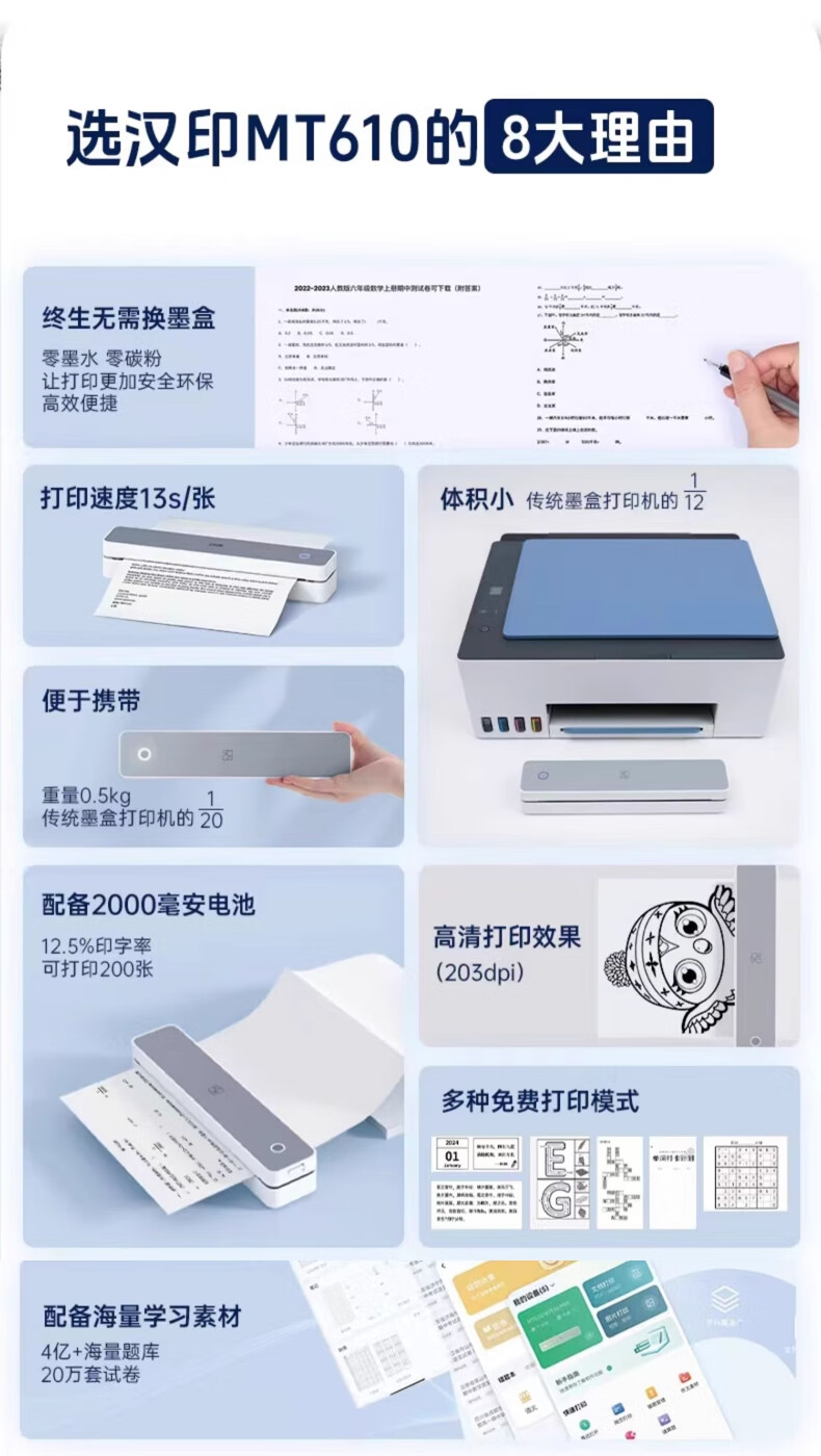 汉印(HPRT)MT610便携式打印机错题机家用作业手机无线蓝牙连接A4迷你消息试卷热敏无墨黑白学生家庭办公 MT610高清版【内置锂电池+免费学习题库】 官方标配【单机+赠10张打印纸】