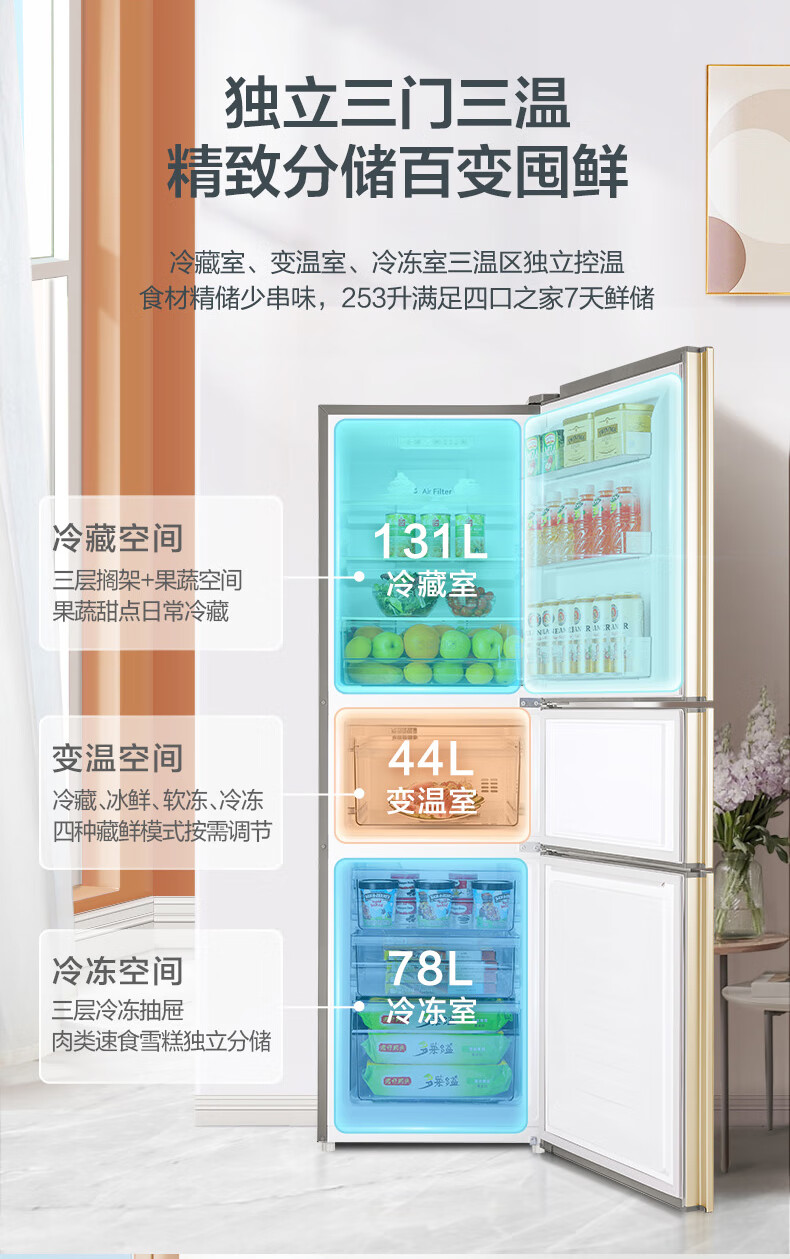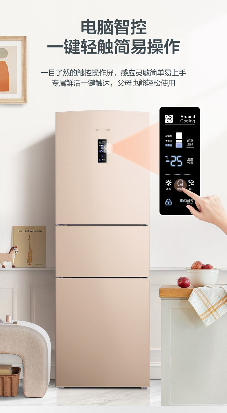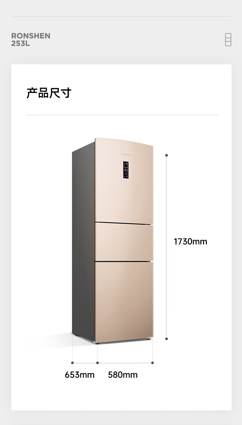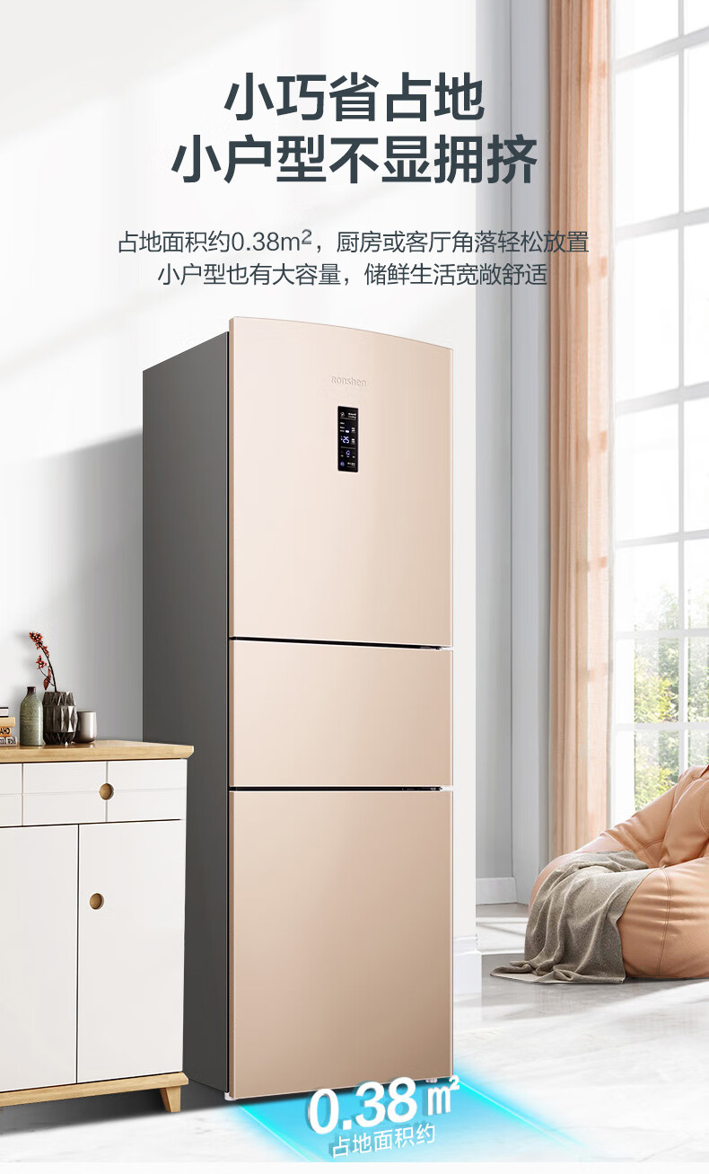 容声253升一级能效三开门小电冰箱家用小型风冷无霜节能出租房宿舍BCD-253WD16NPA璀璨金家电国家补贴