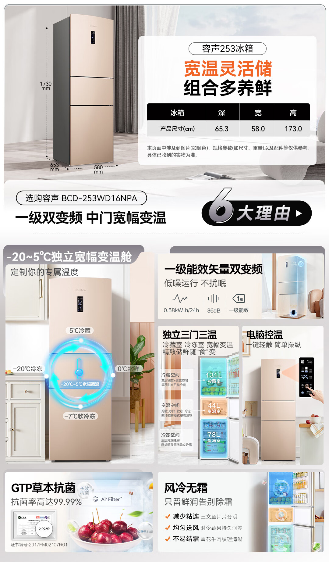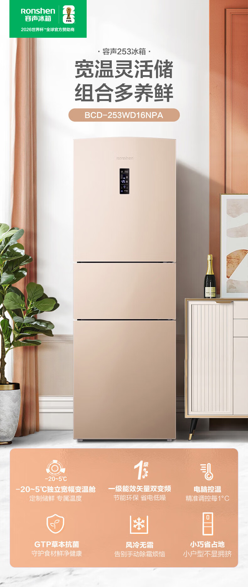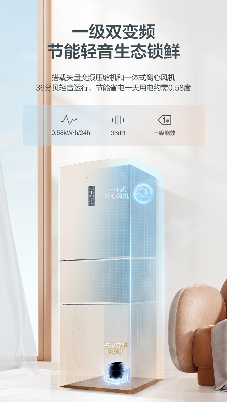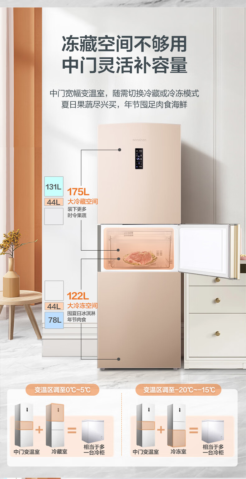 容声253升一级能效三开门小电冰箱家用小型风冷无霜节能出租房宿舍BCD-253WD16NPA璀璨金家电国家补贴
