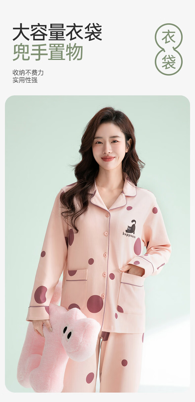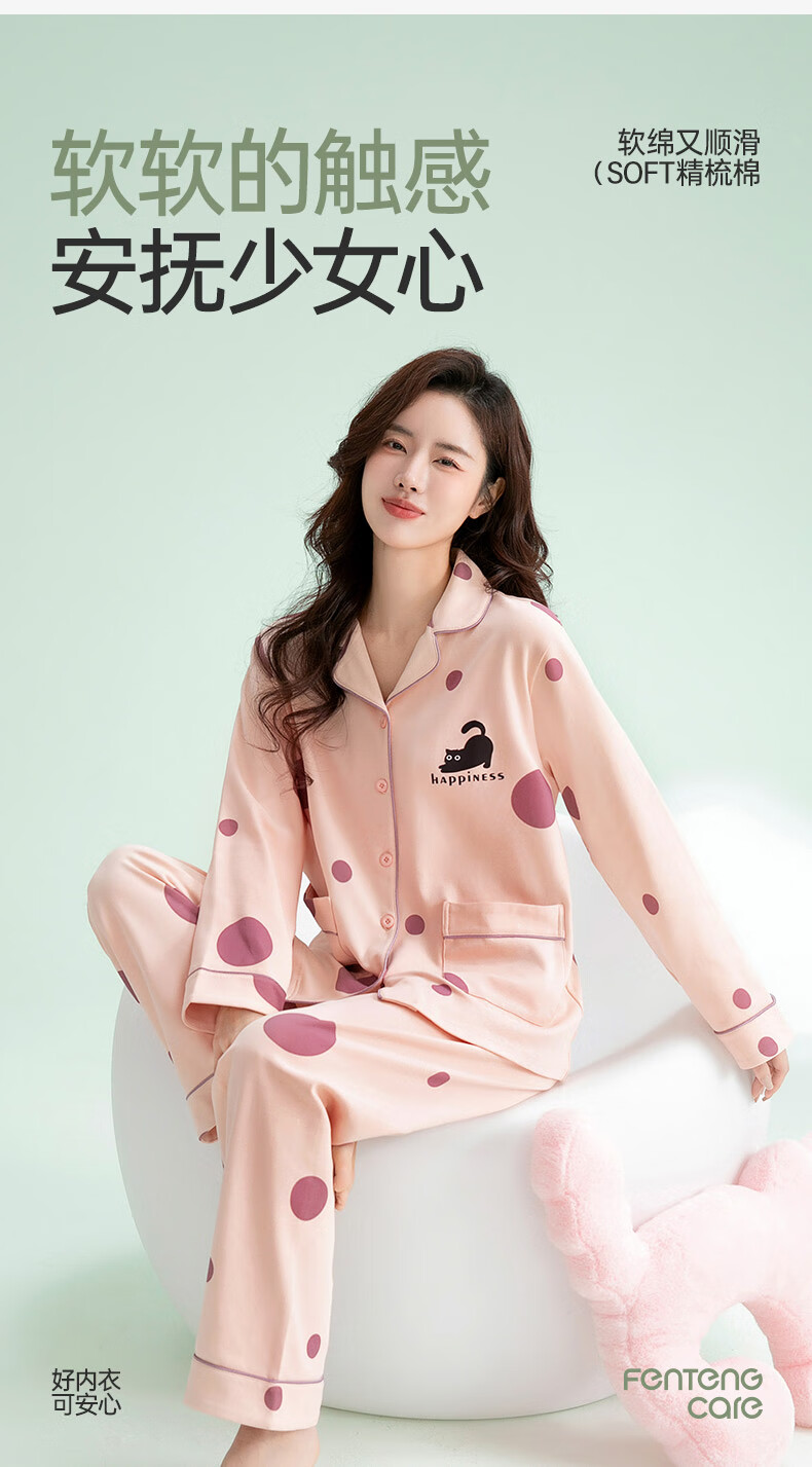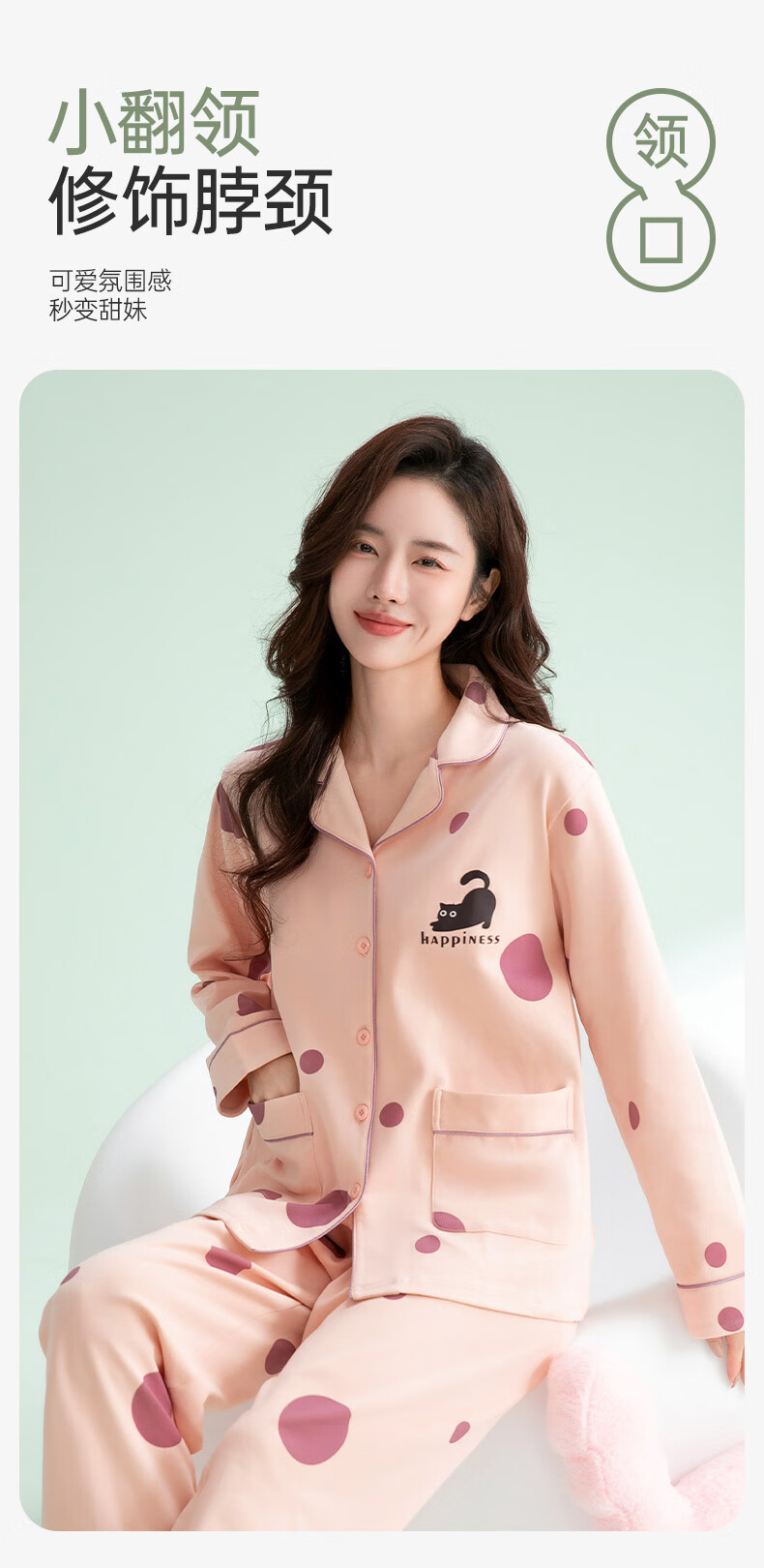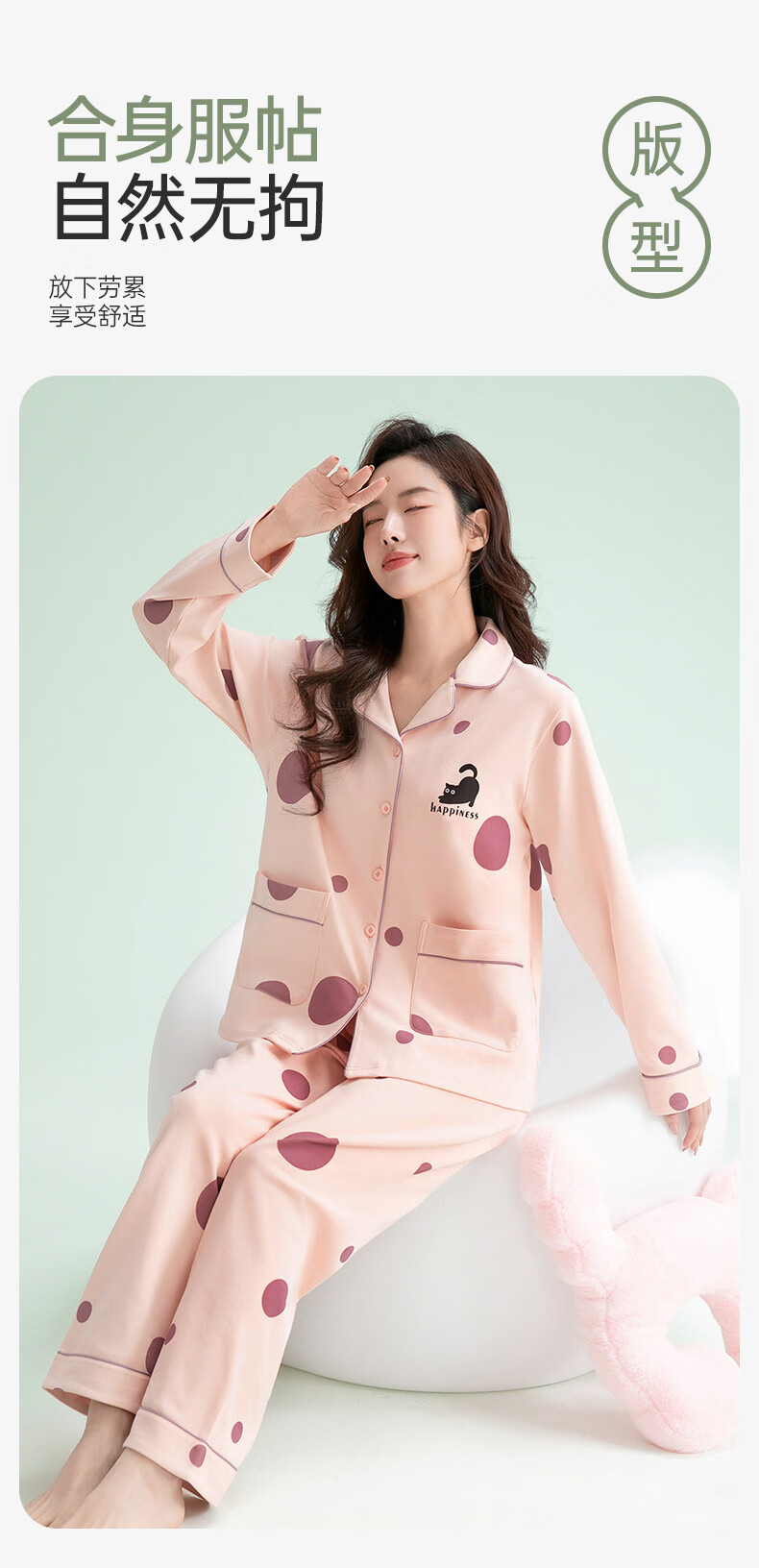芬腾可安睡衣女【100%纯棉】2025春秋新款翻领长袖套装女士睡衣家居服 粉色 2XL