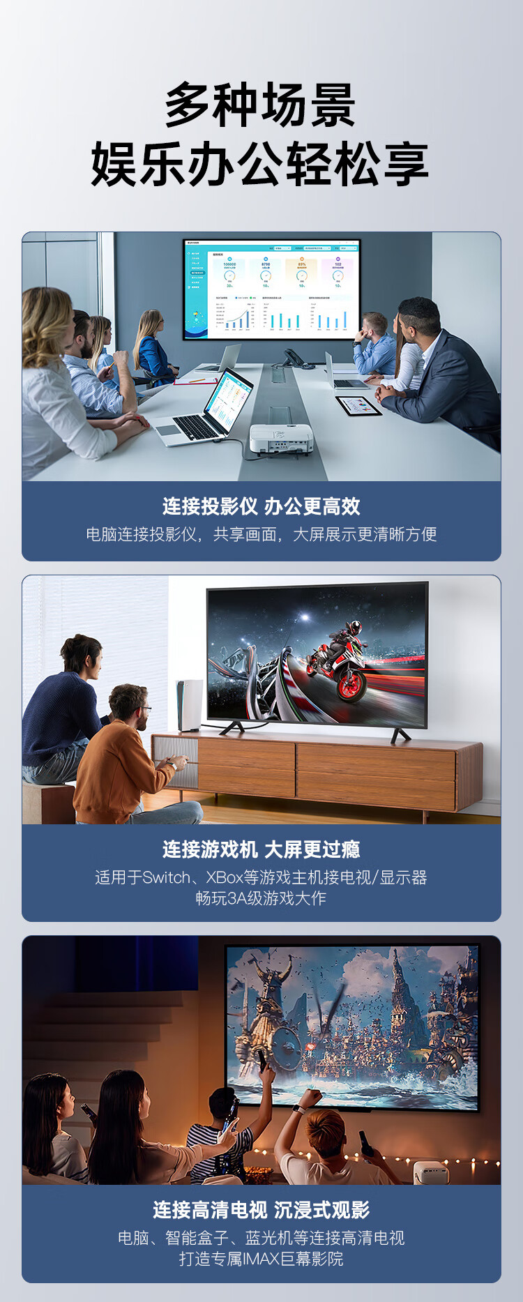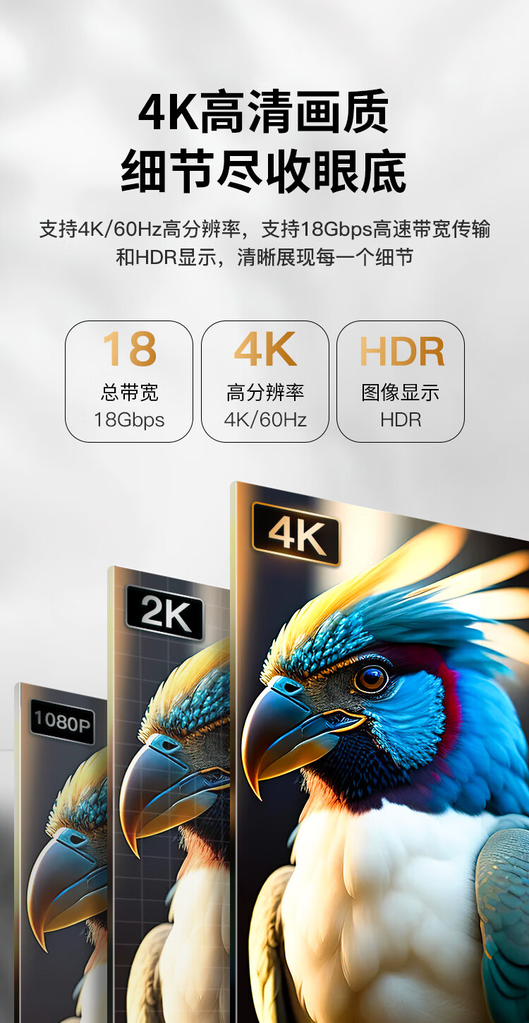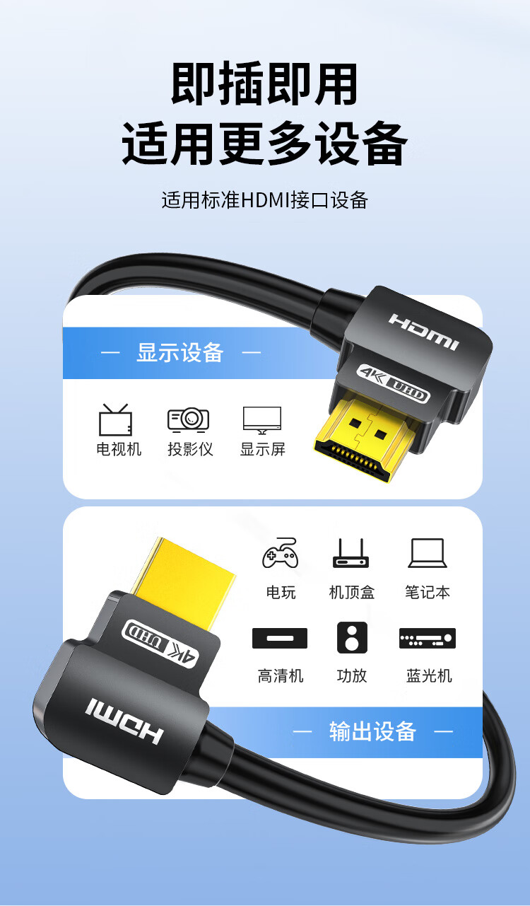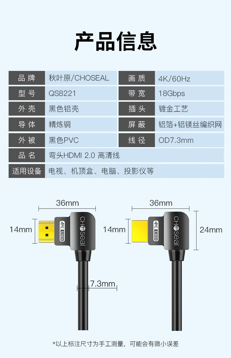 秋叶原(CHOSEAL)HDMI线2.0版弯头 4K/60HZ高清线 3D视频工程线 笔记本电脑电视机顶盒投影仪连接线 3米 QS8221