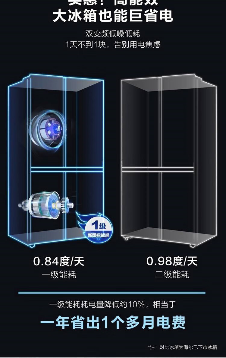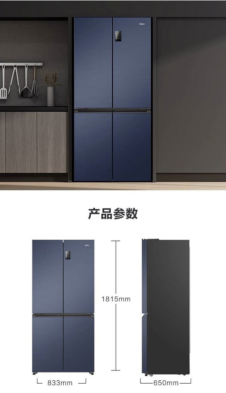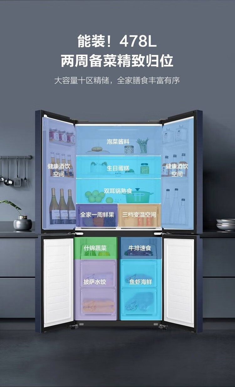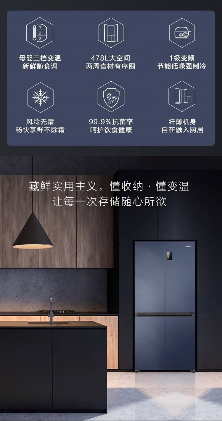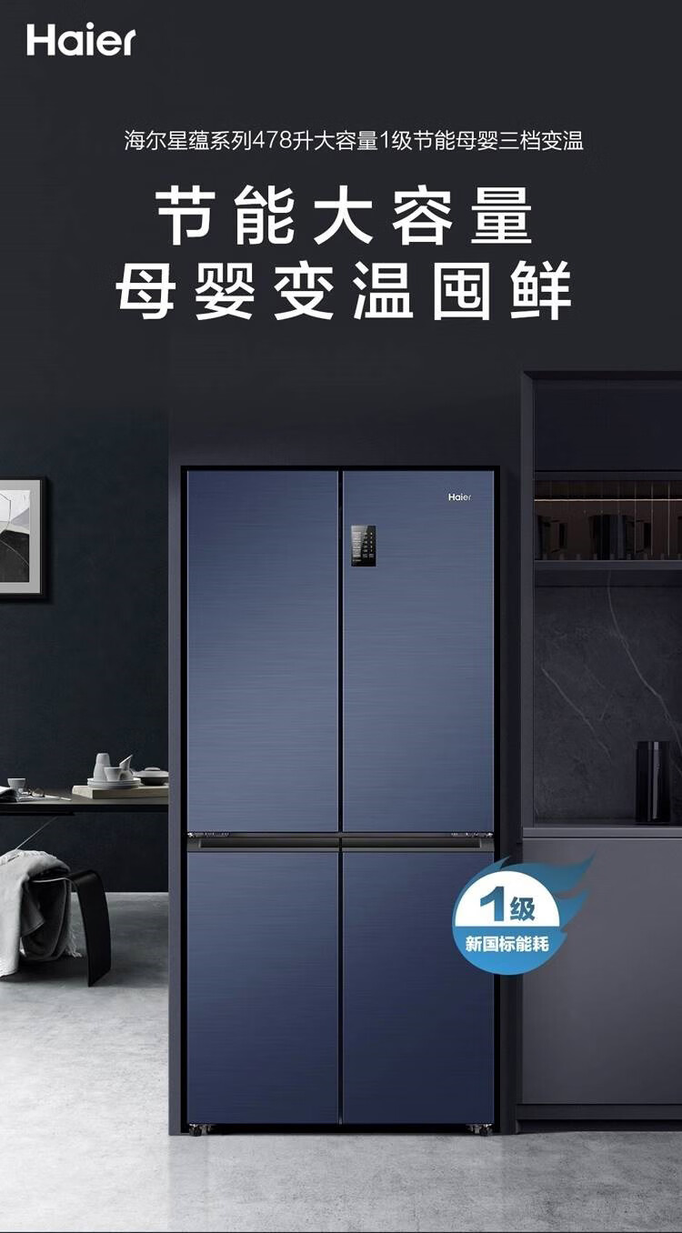 海尔冰箱478升十字对开门四门一级能效双变频双循环风冷无霜大容量家用可嵌入黑金净化节能电冰箱 【478升】一级能效双变频+黑金净化+三挡变温空间