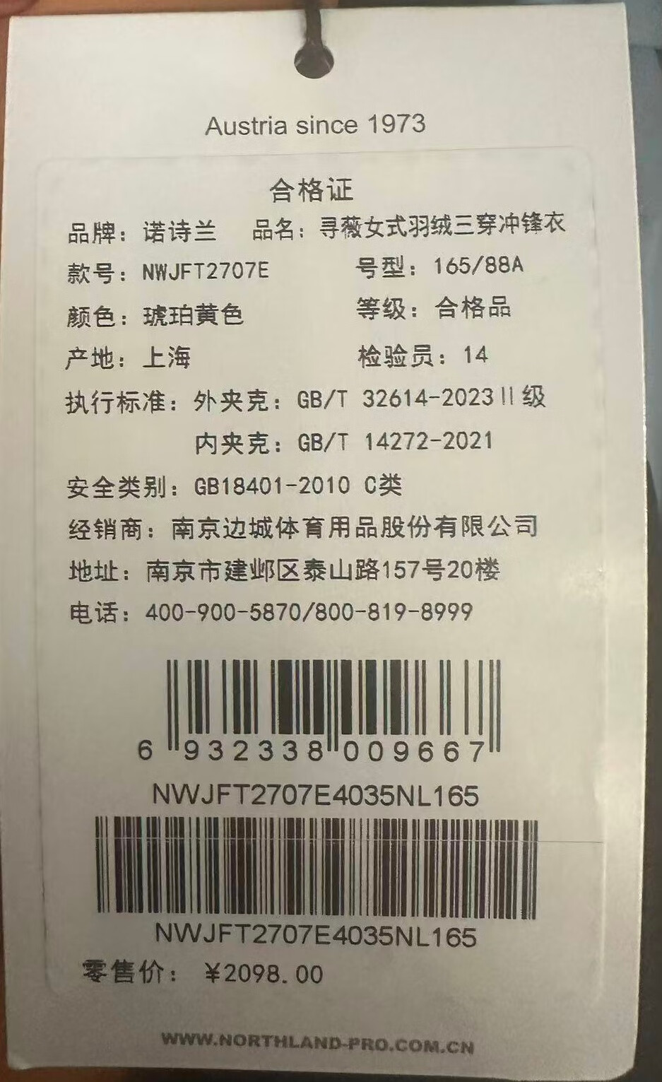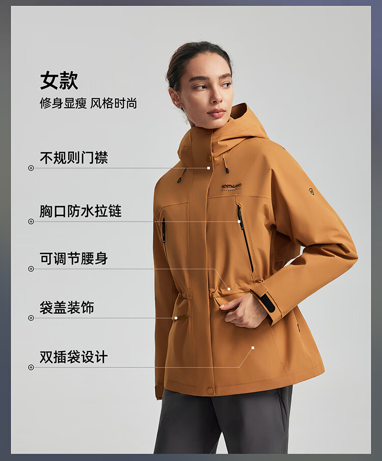 诺诗兰(NORTHLAND)三合一冲锋衣鹅绒内胆25新款秋冬女士徒步登山服