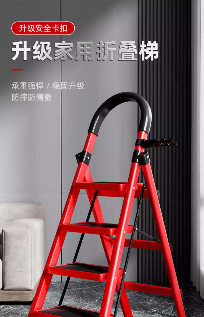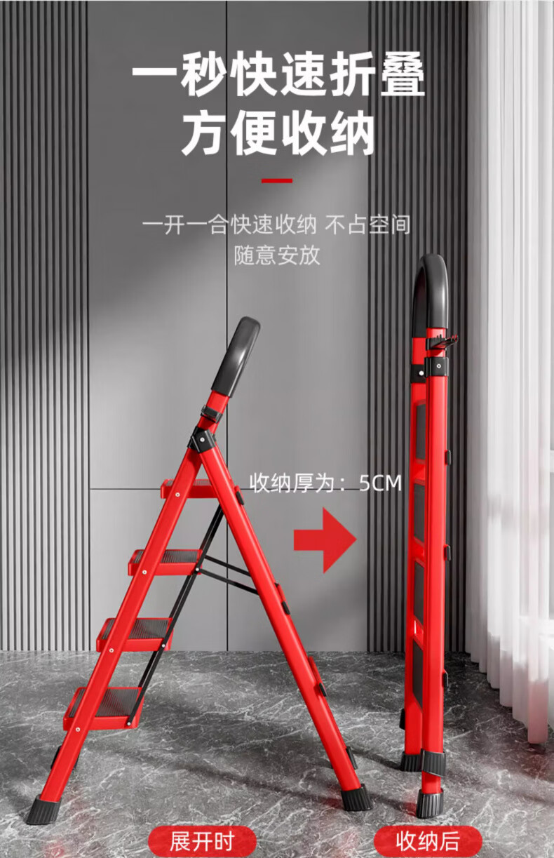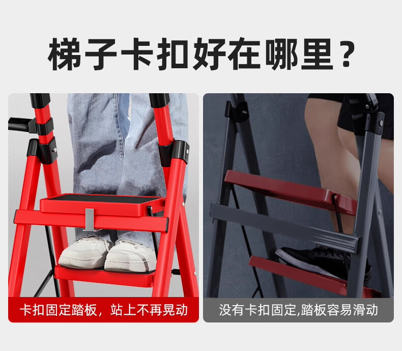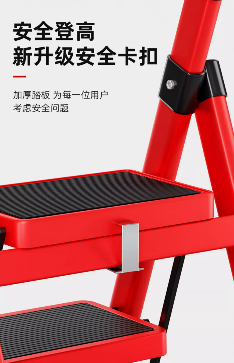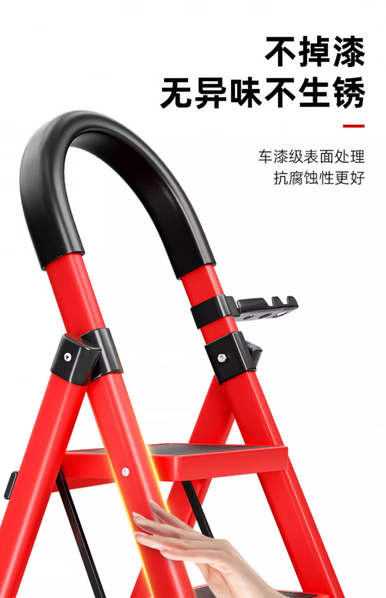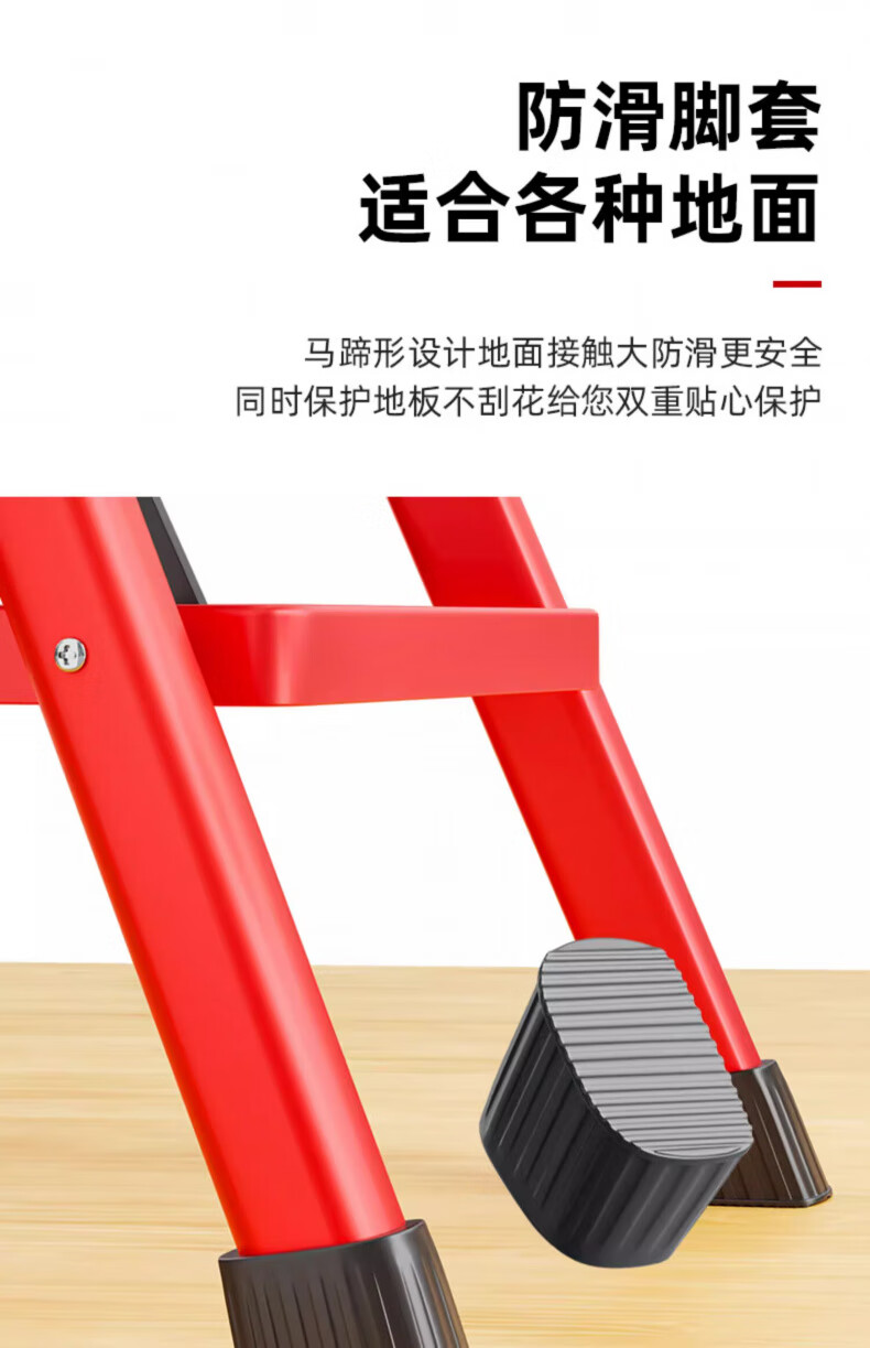法兰加德国高端梯子家用折叠伸缩室内楼梯人字梯多功能升降不锈钢五步梯 【承重1000斤】红色 四步梯 【加宽加厚踏板】安全卡扣+防滑脚垫