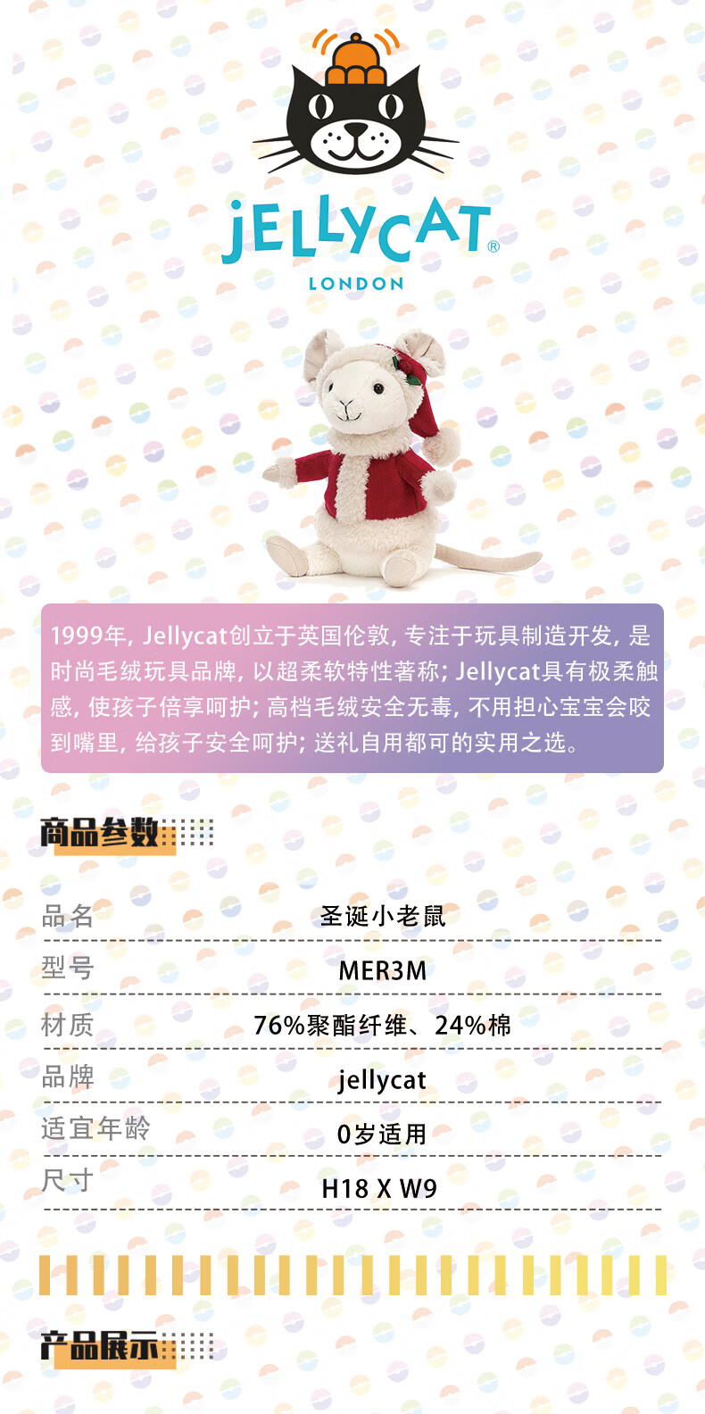 Jellycat英国高端毛绒玩具 圣诞小老鼠18cm 玩偶 圣诞礼物送女友