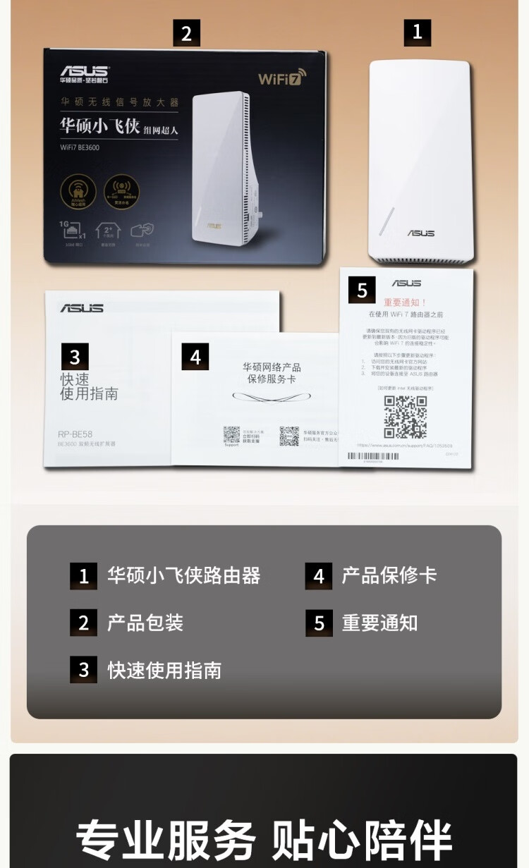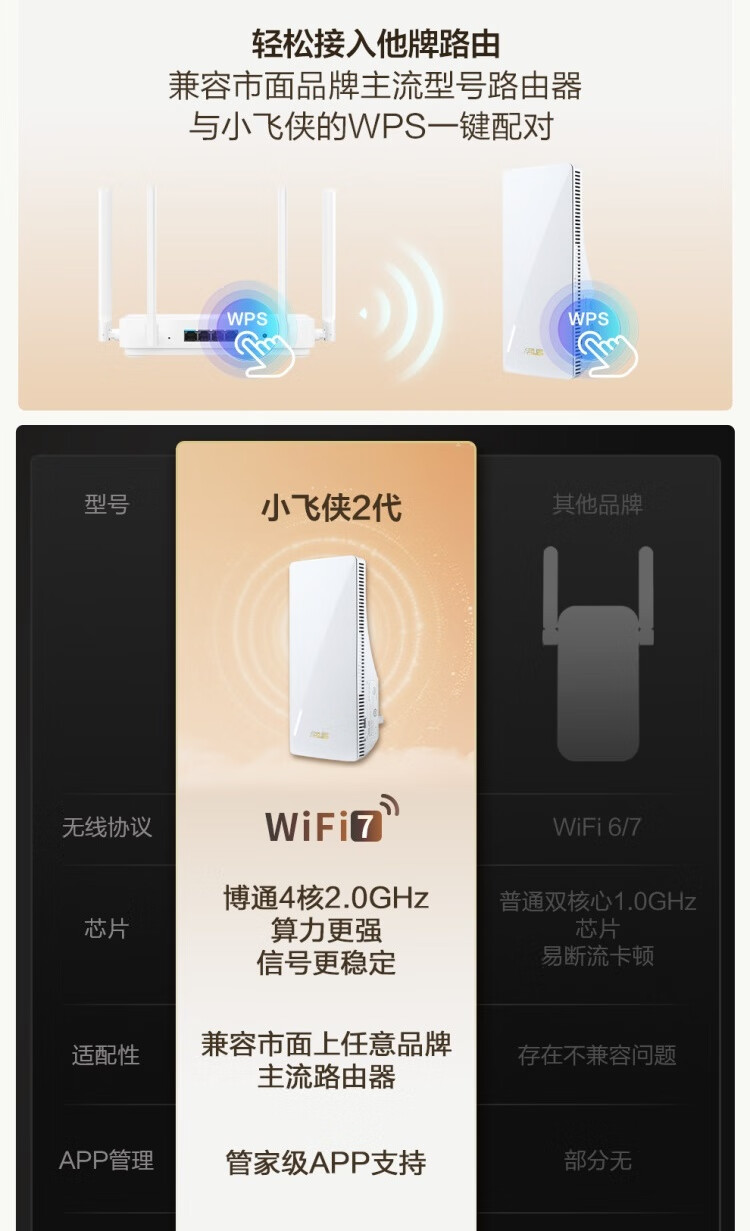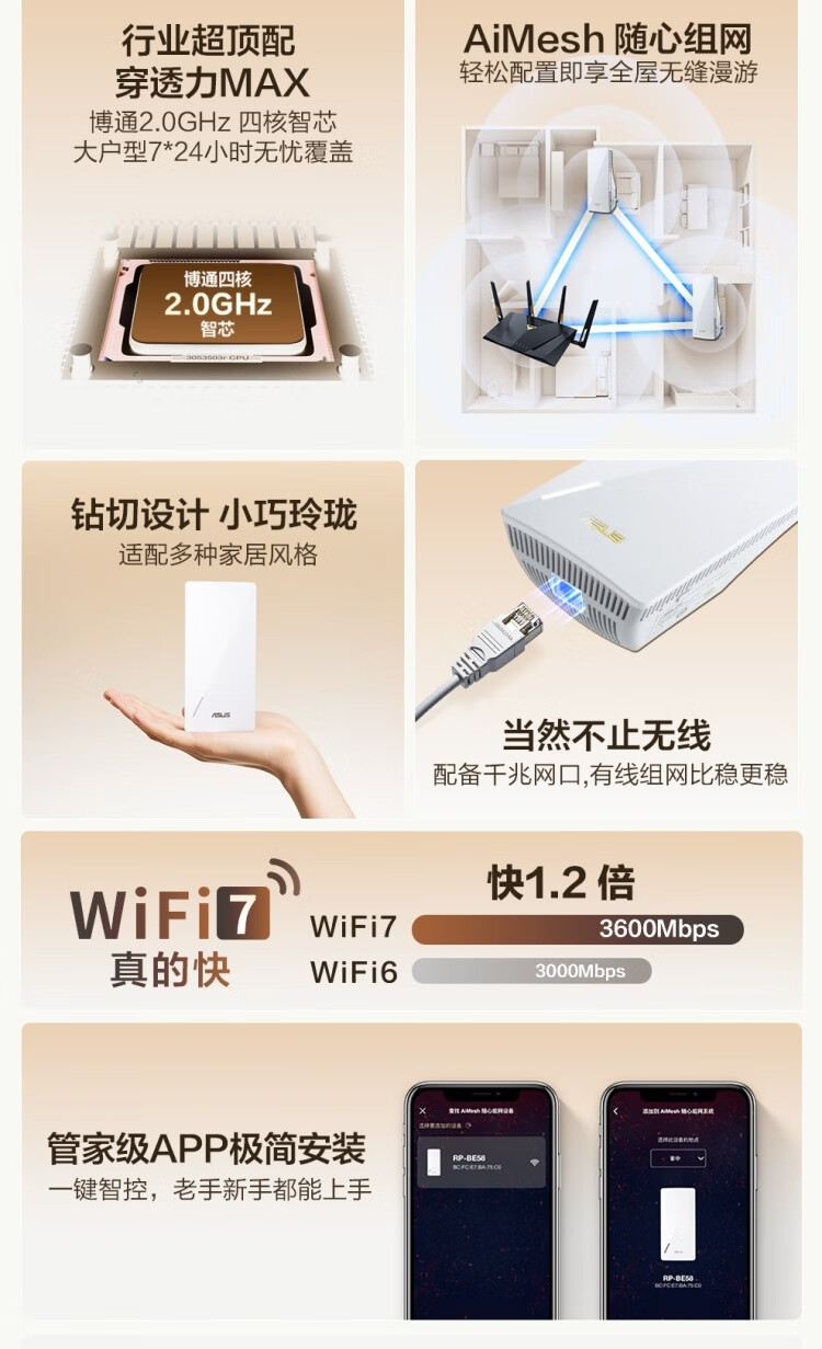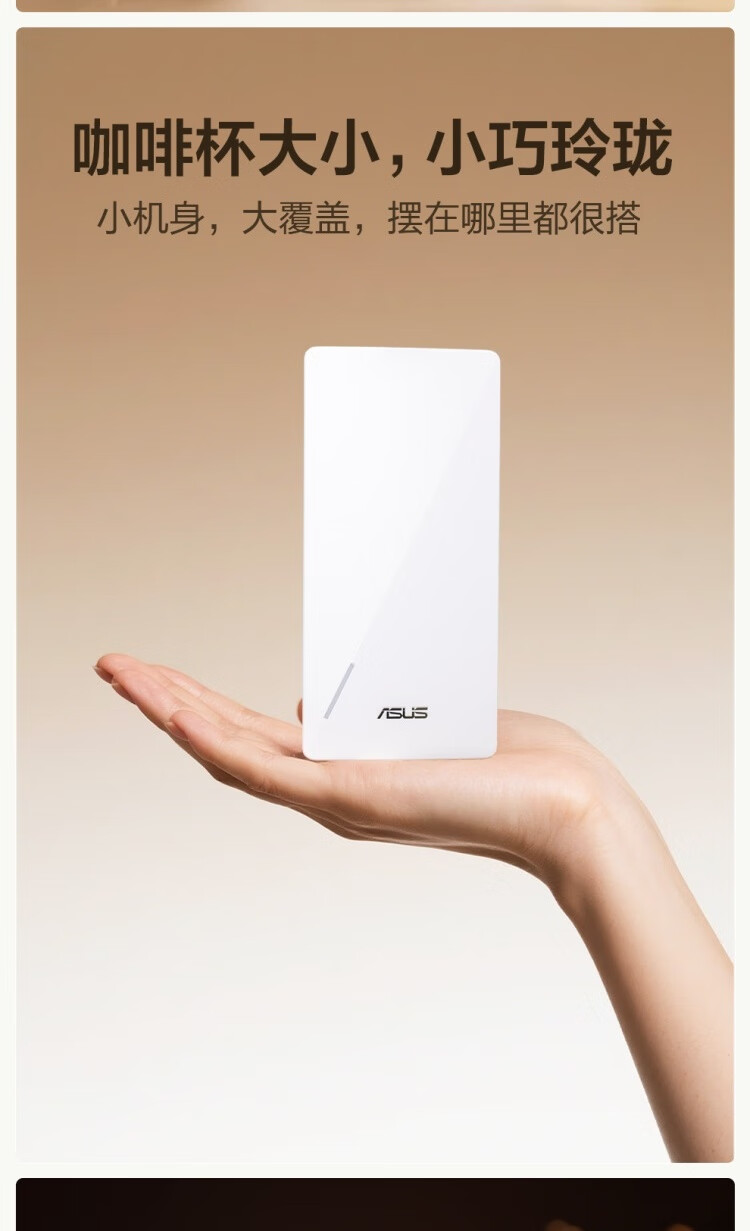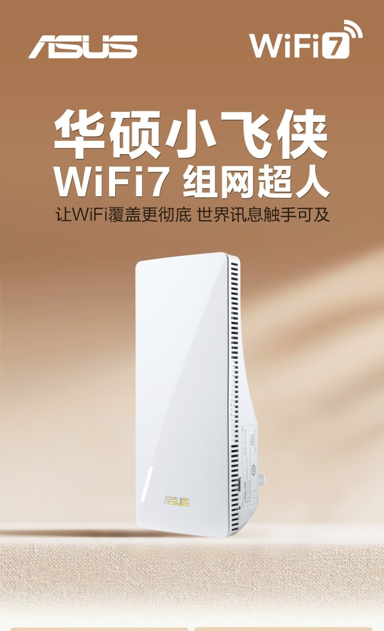 华硕(ASUS)小飞侠WiFi7信号放大器博通四核2.0G双频3600M无线增强小机身大覆盖RP-BE58