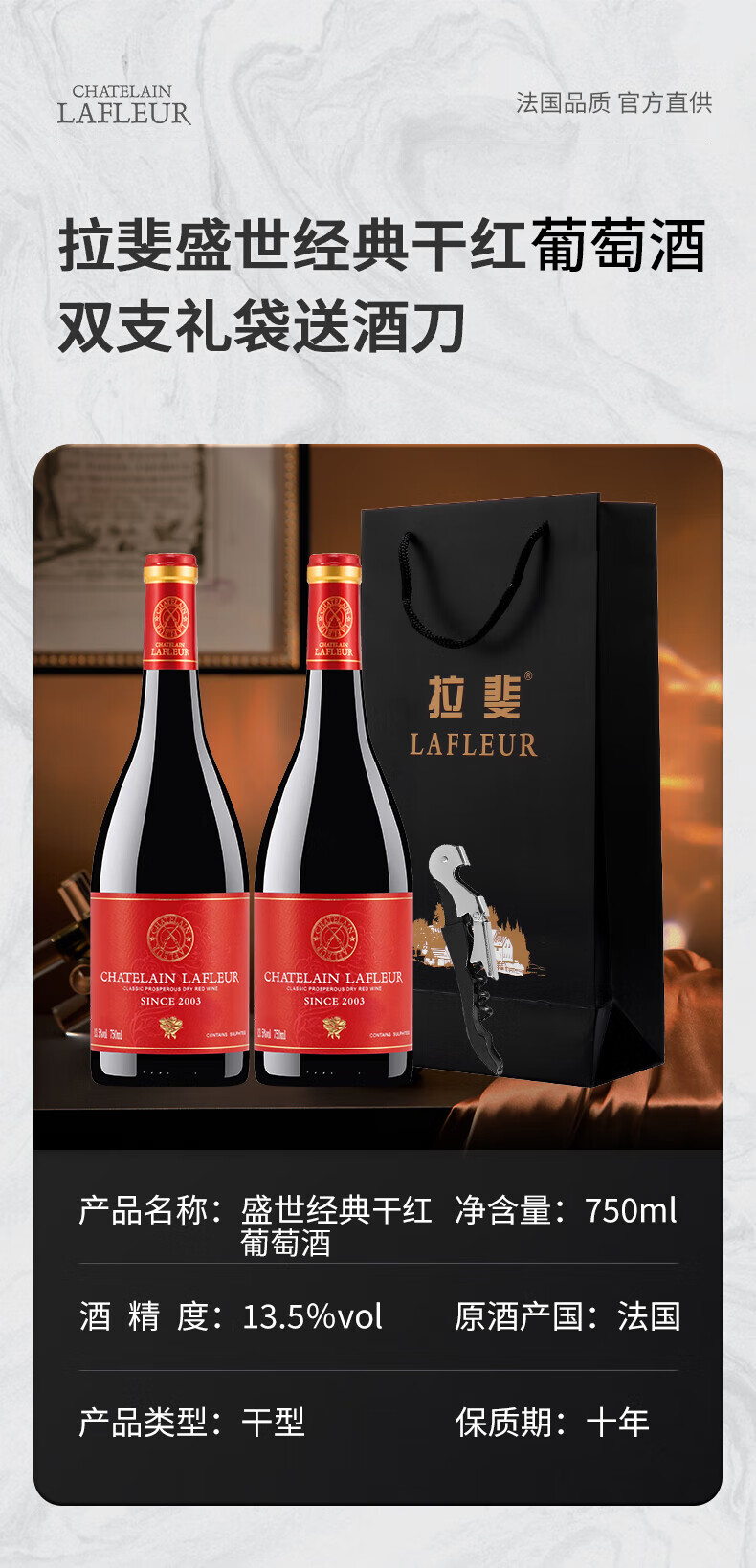 拉斐法国原酒进口红酒干红葡萄酒 750ml*2瓶装 送礼自饮礼品 拉斐窖藏2瓶礼袋装