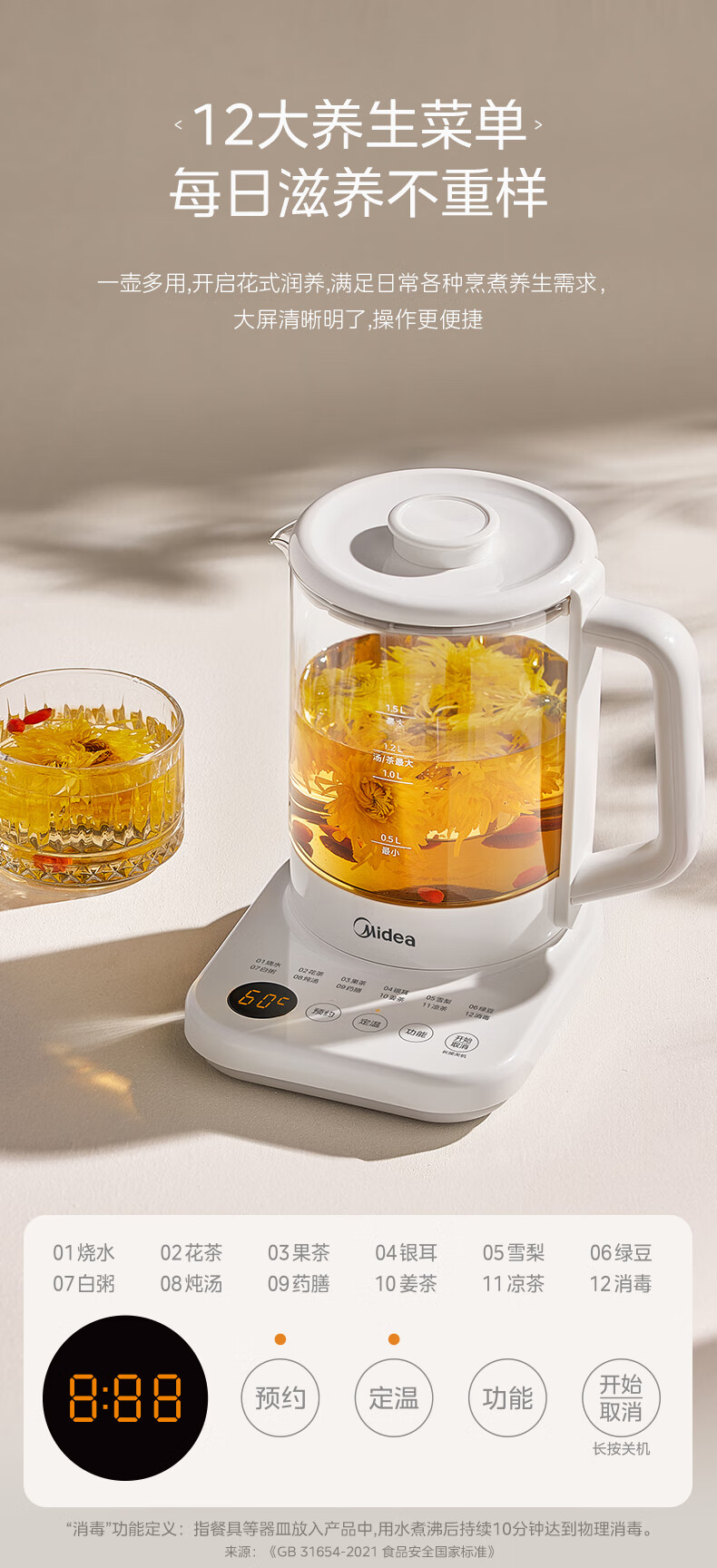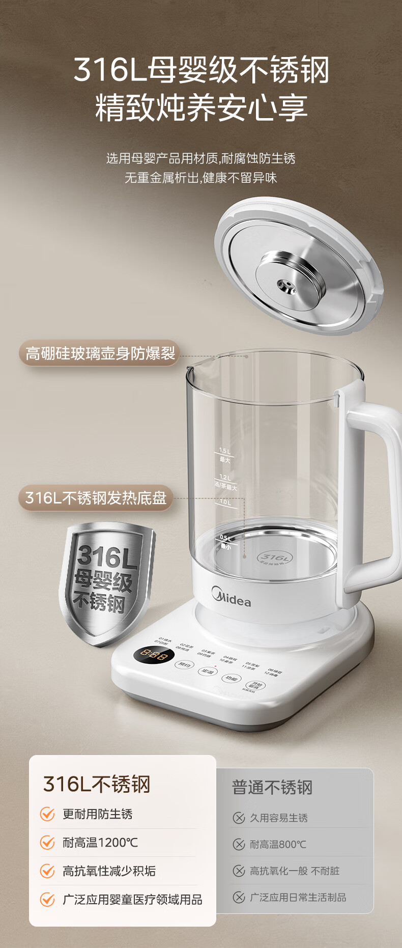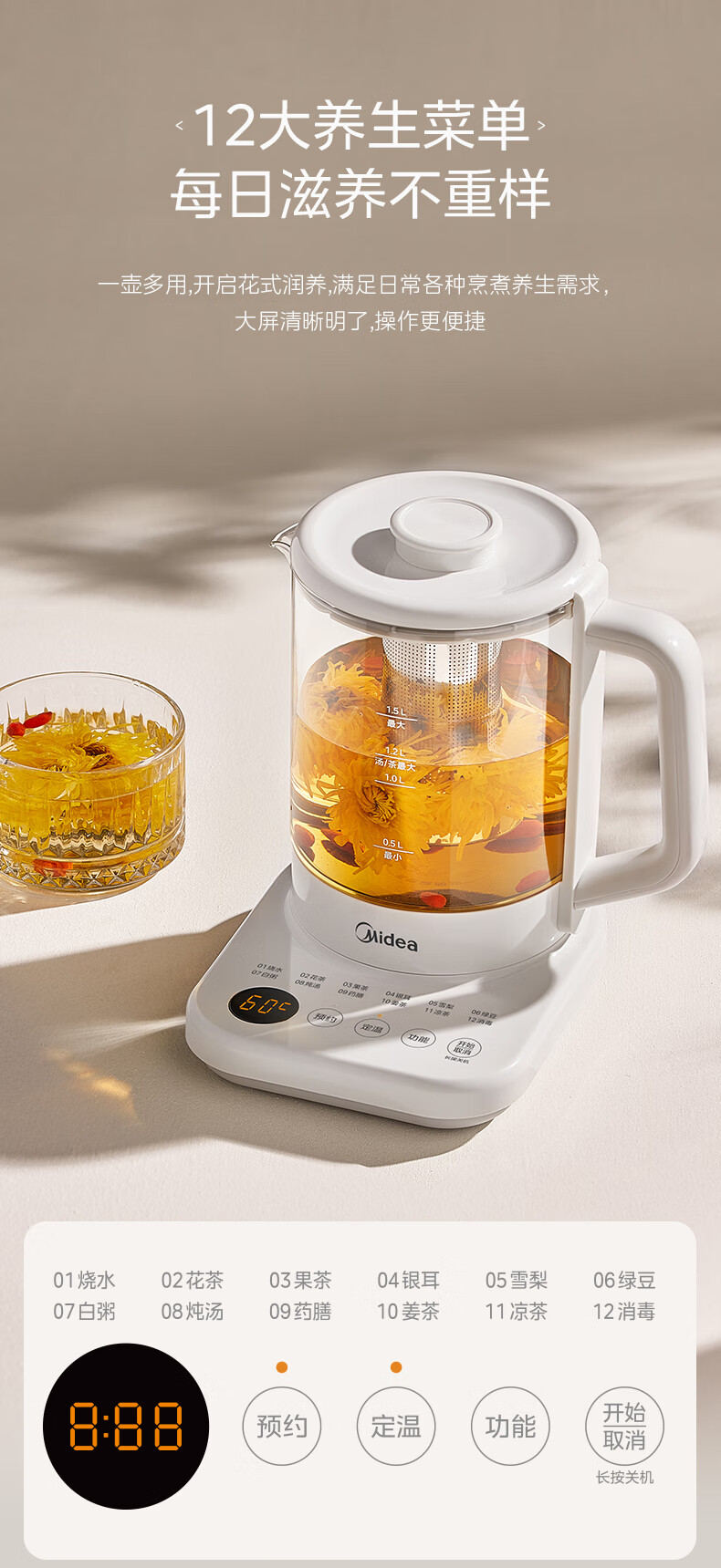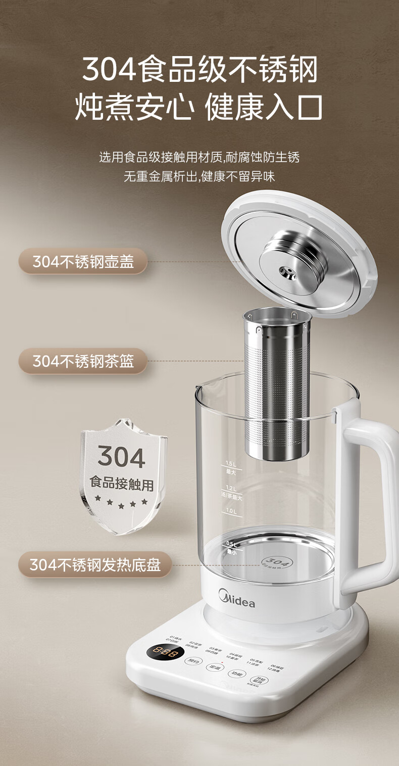 美的(Midea)养生壶 1.5L全自动大口径煮茶壶 24小时预约电热水壶预约保温烧水壶花茶壶多档恒温煮茶器 【316L材质】YS15P-Y2 1.5L