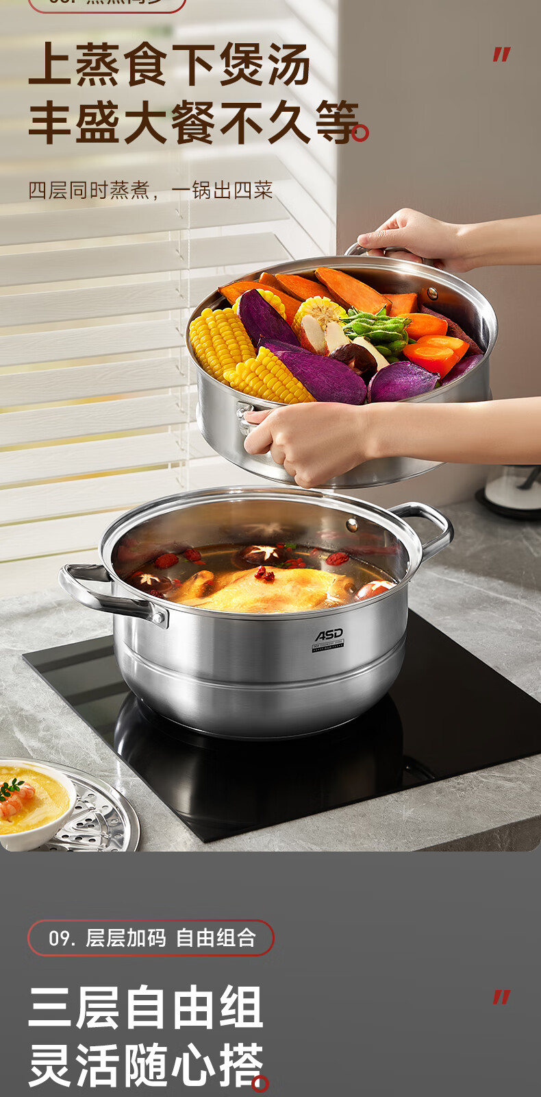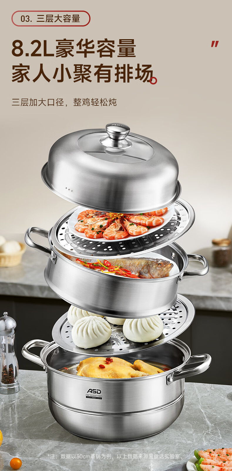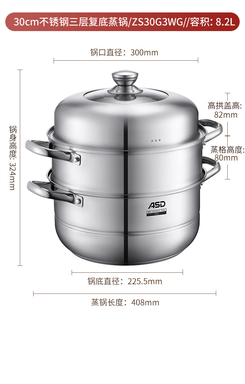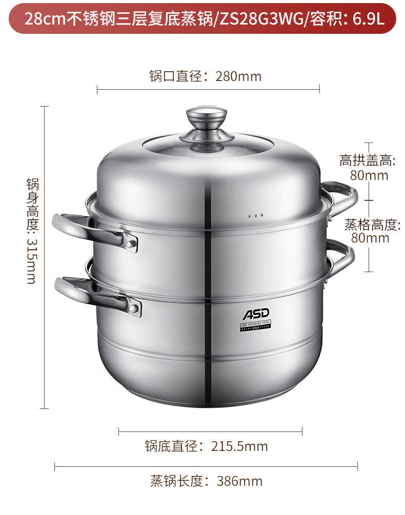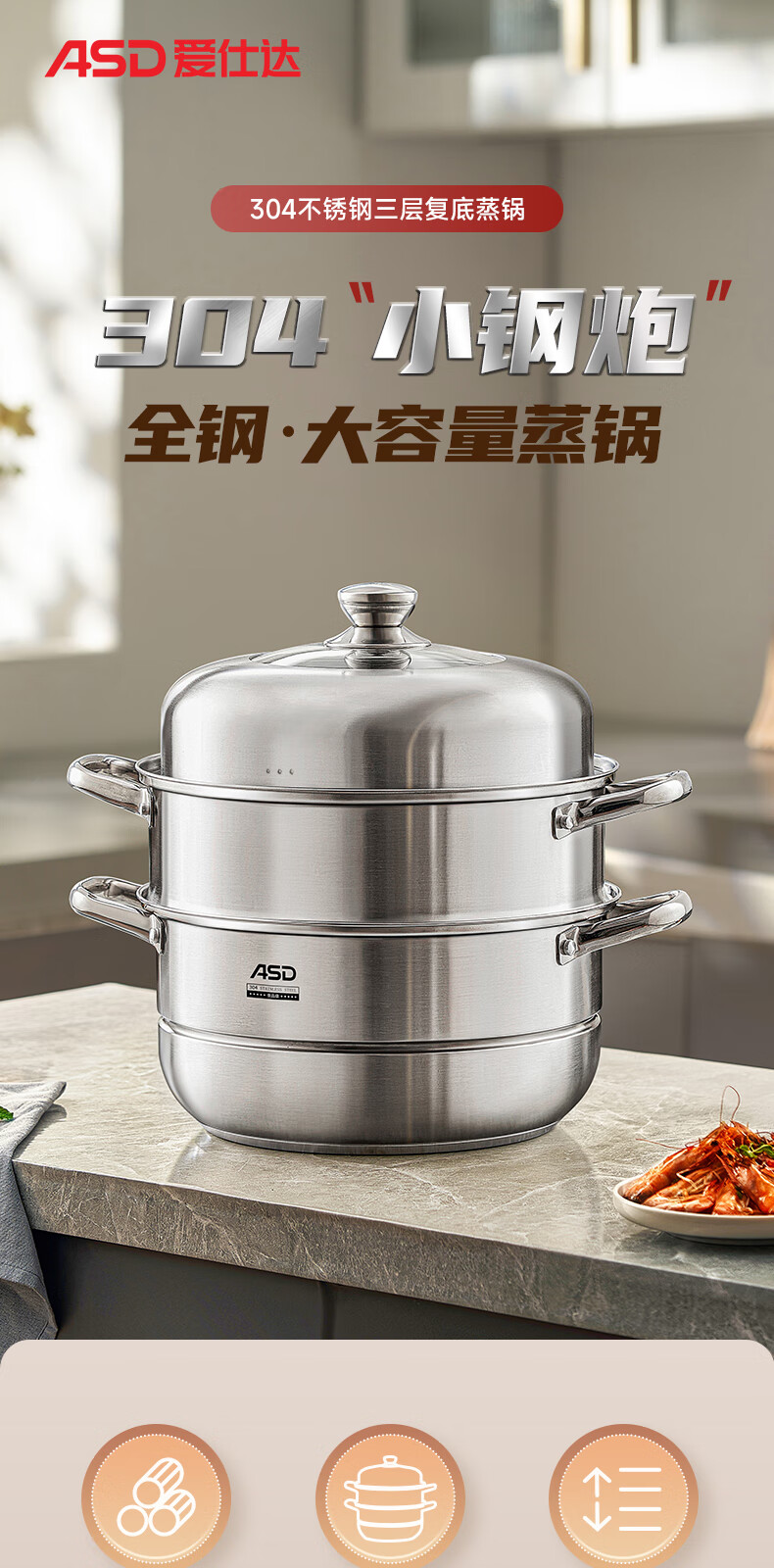 爱仕达(ASD)蒸锅304不锈钢三层汤锅蒸煮一体 家用复底28CM大容量高拱盖蒸笼G3