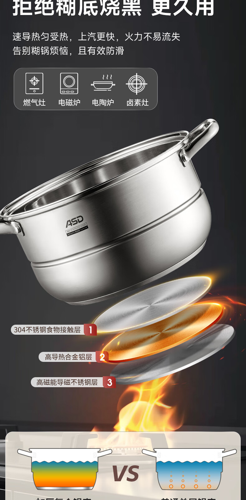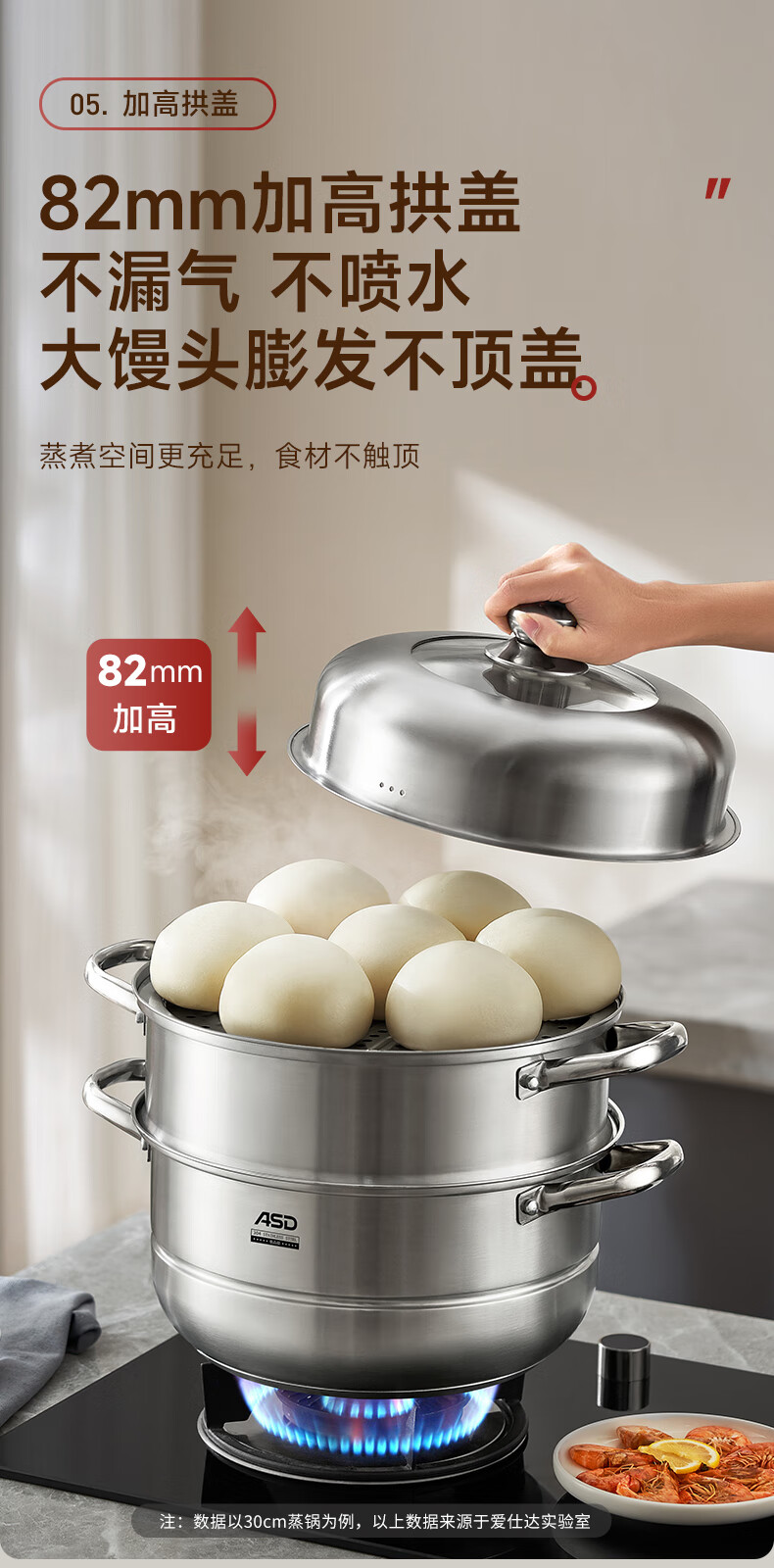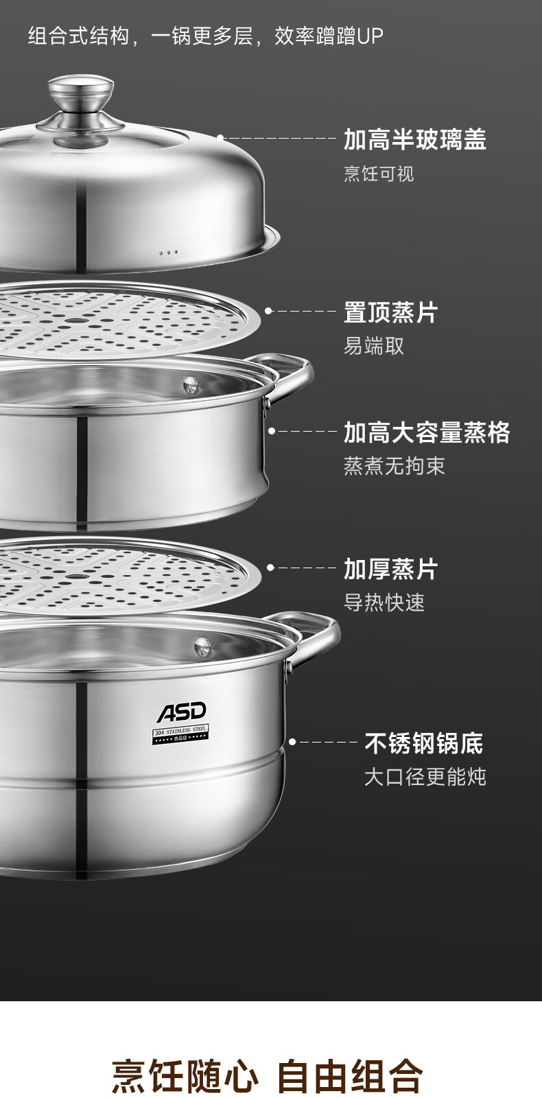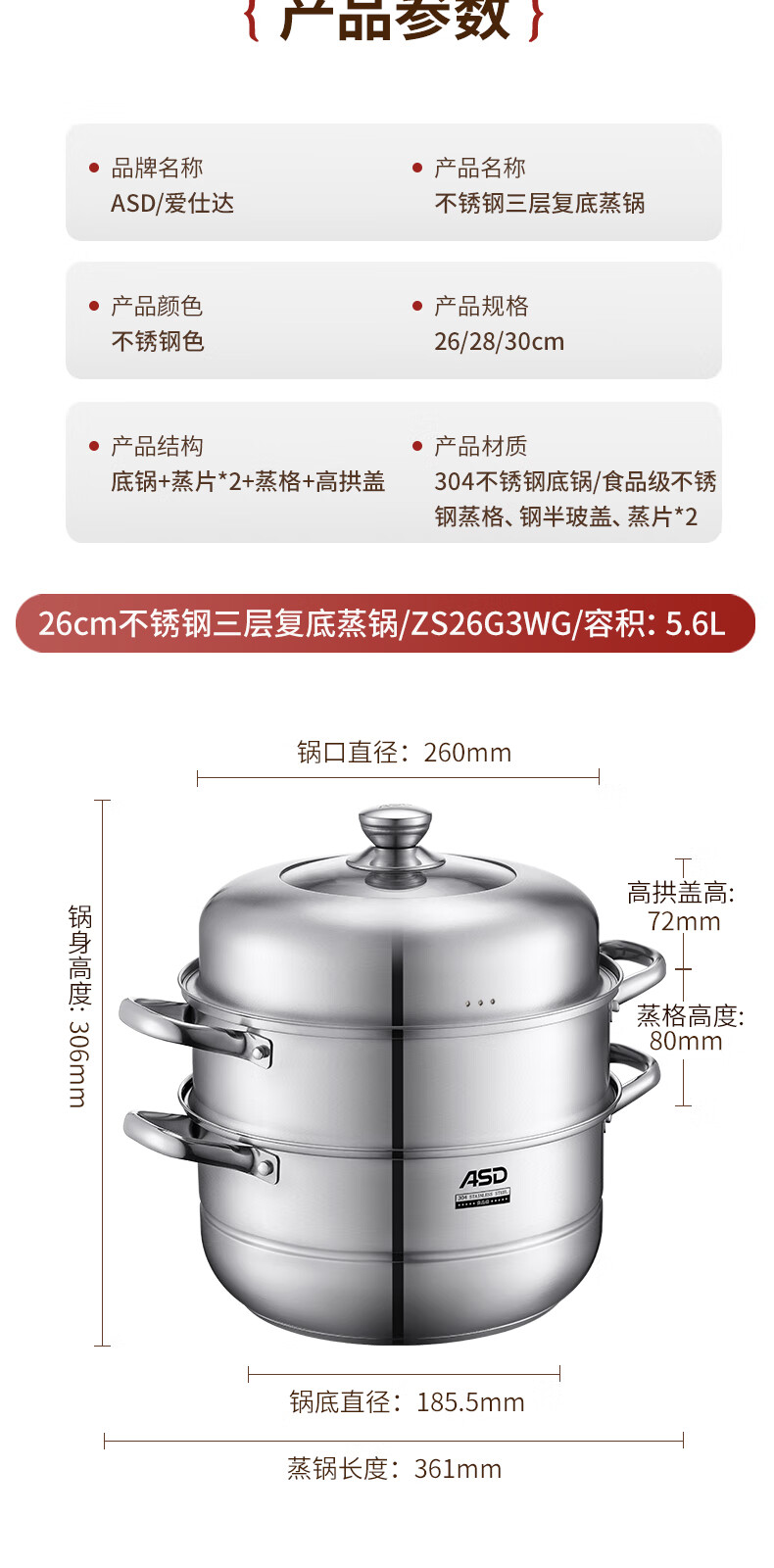 爱仕达(ASD)蒸锅304不锈钢三层汤锅蒸煮一体 家用复底28CM大容量高拱盖蒸笼G3